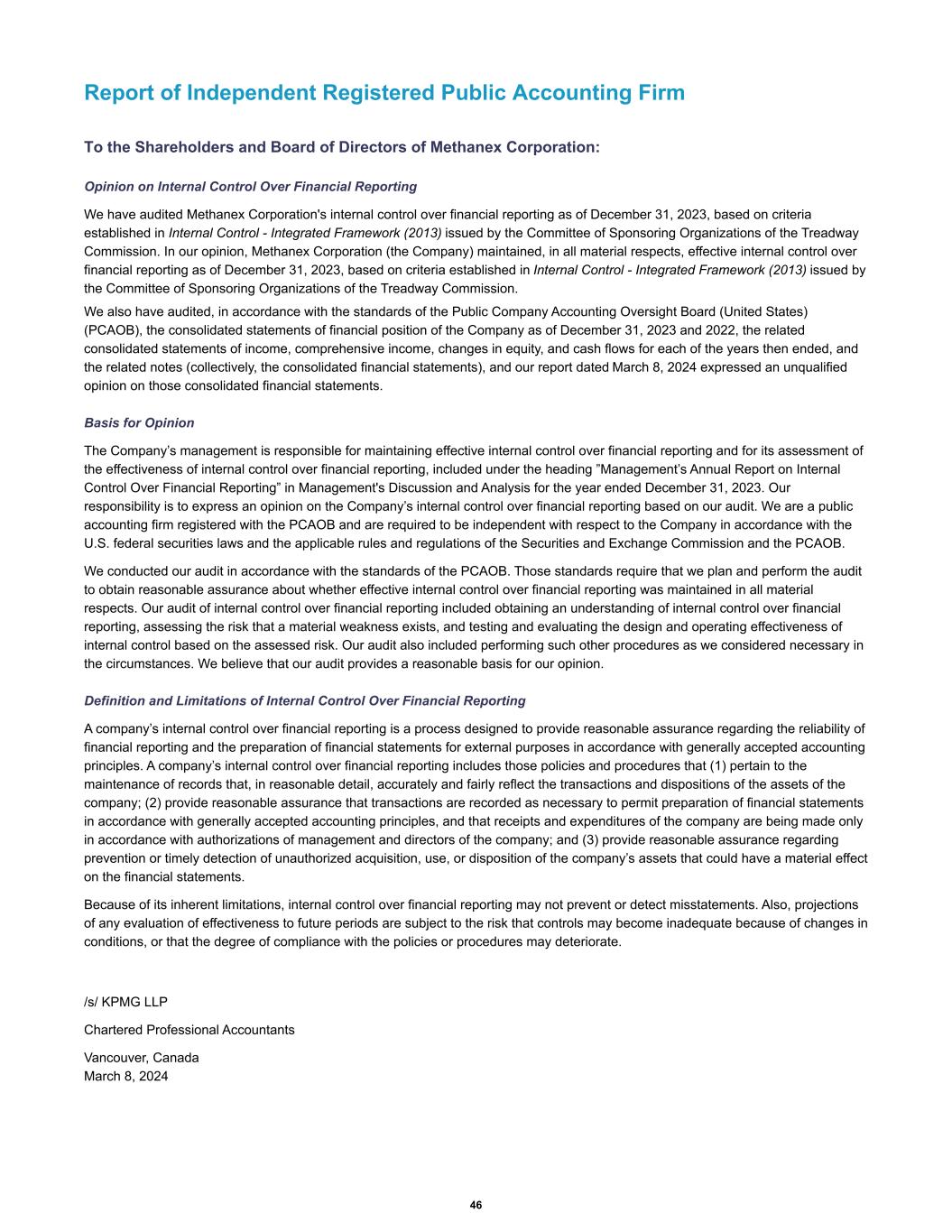 Report of Independent Registered Public Accounting Firm To the Shareholders and Board of Directors of Methanex Corporation: Opinion on Internal Control Over Financial Reporting We have audited Methanex Corporation's internal control over financial reporting as of December 31, 2023, based on criteria established in Internal Control - Integrated Framework (2013) issued by the Committee of Sponsoring Organizations of the Treadway Commission. In our opinion, Methanex Corporation (the Company) maintained, in all material respects, effective internal control over financial reporting as of December 31, 2023, based on criteria established in Internal Control - Integrated Framework (2013) issued by the Committee of Sponsoring Organizations of the Treadway Commission. We also have audited, in accordance with the standards of the Public Company Accounting Oversight Board (United States) (PCAOB), the consolidated statements of financial position of the Company as of December 31, 2023 and 2022, the related consolidated statements of income, comprehensive income, changes in equity, and cash flows for each of the years then ended, and the related notes (collectively, the consolidated financial statements), and our report dated March 8, 2024 expressed an unqualified opinion on those consolidated financial statements. Basis for Opinion The Company’s management is responsible for maintaining effective internal control over financial reporting and for its assessment of the effectiveness of internal control over financial reporting, included under the heading ”Management’s Annual Report on Internal Control Over Financial Reporting” in Management's Discussion and Analysis for the year ended December 31, 2023. Our responsibility is to express an opinion on the Company’s internal control over financial reporting based on our audit. We are a public accounting firm registered with the PCAOB and are required to be independent with respect to the Company in accordance with the U.S. federal securities laws and the applicable rules and regulations of the Securities and Exchange Commission and the PCAOB. We conducted our audit in accordance with the standards of the PCAOB. Those standards require that we plan and perform the audit to obtain reasonable assurance about whether effective internal control over financial reporting was maintained in all material respects. Our audit of internal control over financial reporting included obtaining an understanding of internal control over financial reporting, assessing the risk that a material weakness exists, and testing and evaluating the design and operating effectiveness of internal control based on the assessed risk. Our audit also included performing such other procedures as we considered necessary in the circumstances. We believe that our audit provides a reasonable basis for our opinion. Definition and Limitations of Internal Control Over Financial Reporting A company’s internal control over financial reporting is a process designed to provide reasonable assurance regarding the reliability of financial reporting and the preparation of financial statements for external purposes in accordance with generally accepted accounting principles. A company’s internal control over financial reporting includes those policies and procedures that (1) pertain to the maintenance of records that, in reasonable detail, accurately and fairly reflect the transactions and dispositions of the assets of the company; (2) provide reasonable assurance that transactions are recorded as necessary to permit preparation of financial statements in accordance with generally accepted accounting principles, and that receipts and expenditures of the company are being made only in accordance with authorizations of management and directors of the company; and (3) provide reasonable assurance regarding prevention or timely detection of unauthorized acquisition, use, or disposition of the company’s assets that could have a material effect on the financial statements. Because of its inherent limitations, internal control over financial reporting may not prevent or detect misstatements. Also, projections of any evaluation of effectiveness to future periods are subject to the risk that controls may become inadequate because of changes in conditions, or that the degree of compliance with the policies or procedures may deteriorate. /s/ KPMG LLP Chartered Professional Accountants Vancouver, Canada March 8, 2024 46