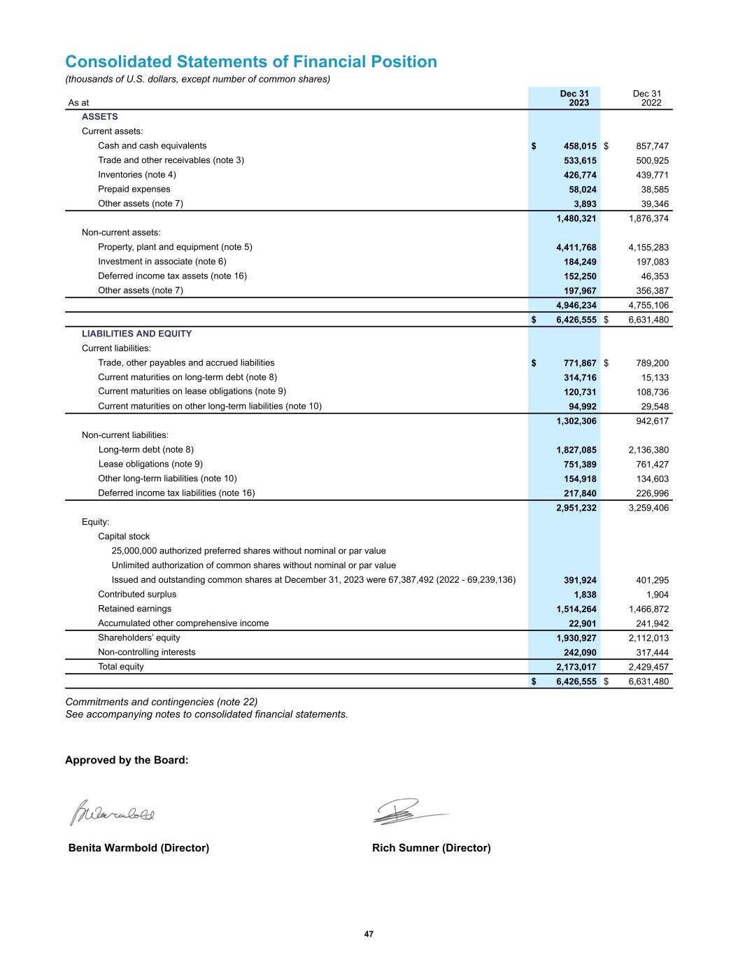 Consolidated Statements of Financial Position (thousands of U.S. dollars, except number of common shares) ASSETS Current assets: Cash and cash equivalents $ 458,015 $ 857,747 Trade and other receivables (note 3) 533,615 500,925 Inventories (note 4) 426,774 439,771 Prepaid expenses 58,024 38,585 Other assets (note 7) 3,893 39,346 1,480,321 1,876,374 Non-current assets: Property, plant and equipment (note 5) 4,411,768 4,155,283 Investment in associate (note 6) 184,249 197,083 Deferred income tax assets (note 16) 152,250 46,353 Other assets (note 7) 197,967 356,387 4,946,234 4,755,106 $ 6,426,555 $ 6,631,480 LIABILITIES AND EQUITY Current liabilities: Trade, other payables and accrued liabilities $ 771,867 $ 789,200 Current maturities on long-term debt (note 8) 314,716 15,133 Current maturities on lease obligations (note 9) 120,731 108,736 Current maturities on other long-term liabilities (note 10) 94,992 29,548 1,302,306 942,617 Non-current liabilities: Long-term debt (note 8) 1,827,085 2,136,380 Lease obligations (note 9) 751,389 761,427 Other long-term liabilities (note 10) 154,918 134,603 Deferred income tax liabilities (note 16) 217,840 226,996 2,951,232 3,259,406 Equity: Capital stock 25,000,000 authorized preferred shares without nominal or par value Unlimited authorization of common shares without nominal or par value Issued and outstanding common shares at December 31, 2023 were 67,387,492 (2022 - 69,239,136) 391,924 401,295 Contributed surplus 1,838 1,904 Retained earnings 1,514,264 1,466,872 Accumulated other comprehensive income 22,901 241,942 Shareholders’ equity 1,930,927 2,112,013 Non-controlling interests 242,090 317,444 Total equity 2,173,017 2,429,457 $ 6,426,555 $ 6,631,480 As at Dec 31 2023 Dec 31 2022 Commitments and contingencies (note 22) See accompanying notes to consolidated financial statements. Approved by the Board: Benita Warmbold (Director) Rich Sumner (Director) 47