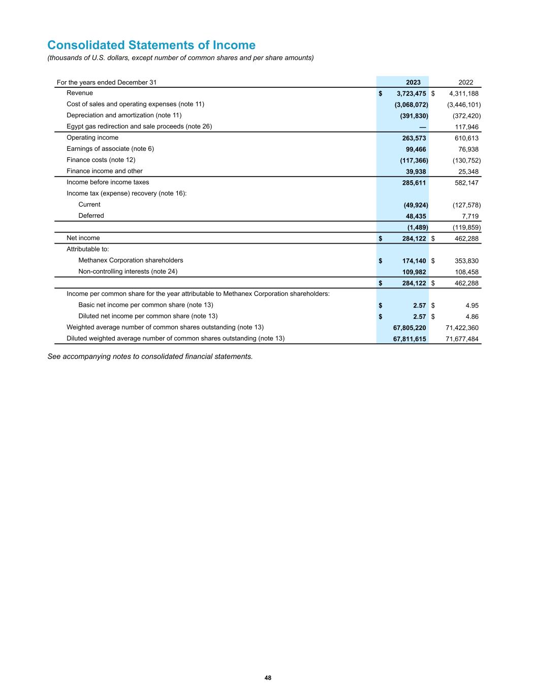 Consolidated Statements of Income (thousands of U.S. dollars, except number of common shares and per share amounts) Revenue $ 3,723,475 $ 4,311,188 Cost of sales and operating expenses (note 11) (3,068,072) (3,446,101) Depreciation and amortization (note 11) (391,830) (372,420) Egypt gas redirection and sale proceeds (note 26) — 117,946 Operating income 263,573 610,613 Earnings of associate (note 6) 99,466 76,938 Finance costs (note 12) (117,366) (130,752) Finance income and other 39,938 25,348 Income before income taxes 285,611 582,147 Income tax (expense) recovery (note 16): Current (49,924) (127,578) Deferred 48,435 7,719 (1,489) (119,859) Net income $ 284,122 $ 462,288 Attributable to: Methanex Corporation shareholders $ 174,140 $ 353,830 Non-controlling interests (note 24) 109,982 108,458 $ 284,122 $ 462,288 Income per common share for the year attributable to Methanex Corporation shareholders: Basic net income per common share (note 13) $ 2.57 $ 4.95 Diluted net income per common share (note 13) $ 2.57 $ 4.86 Weighted average number of common shares outstanding (note 13) 67,805,220 71,422,360 Diluted weighted average number of common shares outstanding (note 13) 67,811,615 71,677,484 For the years ended December 31 2023 2022 See accompanying notes to consolidated financial statements. 48