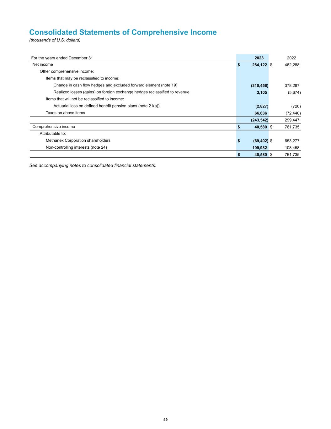 Consolidated Statements of Comprehensive Income (thousands of U.S. dollars) Net income $ 284,122 $ 462,288 Other comprehensive income: Items that may be reclassified to income: Change in cash flow hedges and excluded forward element (note 19) (310,456) 378,287 Realized losses (gains) on foreign exchange hedges reclassified to revenue 3,105 (5,674) Items that will not be reclassified to income: Actuarial loss on defined benefit pension plans (note 21(a)) (2,827) (726) Taxes on above items 66,636 (72,440) (243,542) 299,447 Comprehensive income $ 40,580 $ 761,735 Attributable to: Methanex Corporation shareholders $ (69,402) $ 653,277 Non-controlling interests (note 24) 109,982 108,458 $ 40,580 $ 761,735 For the years ended December 31 2023 2022 See accompanying notes to consolidated financial statements. 49