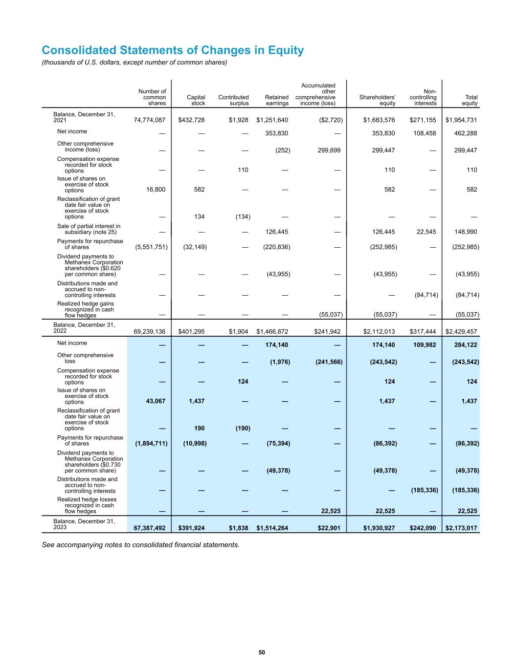 Consolidated Statements of Changes in Equity (thousands of U.S. dollars, except number of common shares) Balance, December 31, 2021 74,774,087 $432,728 $1,928 $1,251,640 ($2,720) $1,683,576 $271,155 $1,954,731 Net income — — — 353,830 — 353,830 108,458 462,288 Other comprehensive income (loss) — — — (252) 299,699 299,447 — 299,447 Compensation expense recorded for stock options — — 110 — — 110 — 110 Issue of shares on exercise of stock options 16,800 582 — — — 582 — 582 Reclassification of grant date fair value on exercise of stock options — 134 (134) — — — — — Sale of partial interest in subsidiary (note 25) — — — 126,445 — 126,445 22,545 148,990 Payments for repurchase of shares (5,551,751) (32,149) — (220,836) — (252,985) — (252,985) Dividend payments to Methanex Corporation shareholders ($0.620 per common share) — — — (43,955) — (43,955) — (43,955) Distributions made and accrued to non- controlling interests — — — — — — (84,714) (84,714) Realized hedge gains recognized in cash flow hedges — — — — (55,037) (55,037) — (55,037) Balance, December 31, 2022 69,239,136 $401,295 $1,904 $1,466,872 $241,942 $2,112,013 $317,444 $2,429,457 Net income — — — 174,140 — 174,140 109,982 284,122 Other comprehensive loss — — — (1,976) (241,566) (243,542) — (243,542) Compensation expense recorded for stock options — — 124 — — 124 — 124 Issue of shares on exercise of stock options 43,067 1,437 — — — 1,437 — 1,437 Reclassification of grant date fair value on exercise of stock options — 190 (190) — — — — — Payments for repurchase of shares (1,894,711) (10,998) — (75,394) — (86,392) — (86,392) Dividend payments to Methanex Corporation shareholders ($0.730 per common share) — — — (49,378) — (49,378) — (49,378) Distributions made and accrued to non- controlling interests — — — — — — (185,336) (185,336) Realized hedge losses recognized in cash flow hedges — — — — 22,525 22,525 — 22,525 Balance, December 31, 2023 67,387,492 $391,924 $1,838 $1,514,264 $22,901 $1,930,927 $242,090 $2,173,017 Number of common shares Capital stock Contributed surplus Retained earnings Accumulated other comprehensive income (loss) Shareholders’ equity Non- controlling interests Total equity See accompanying notes to consolidated financial statements. 50