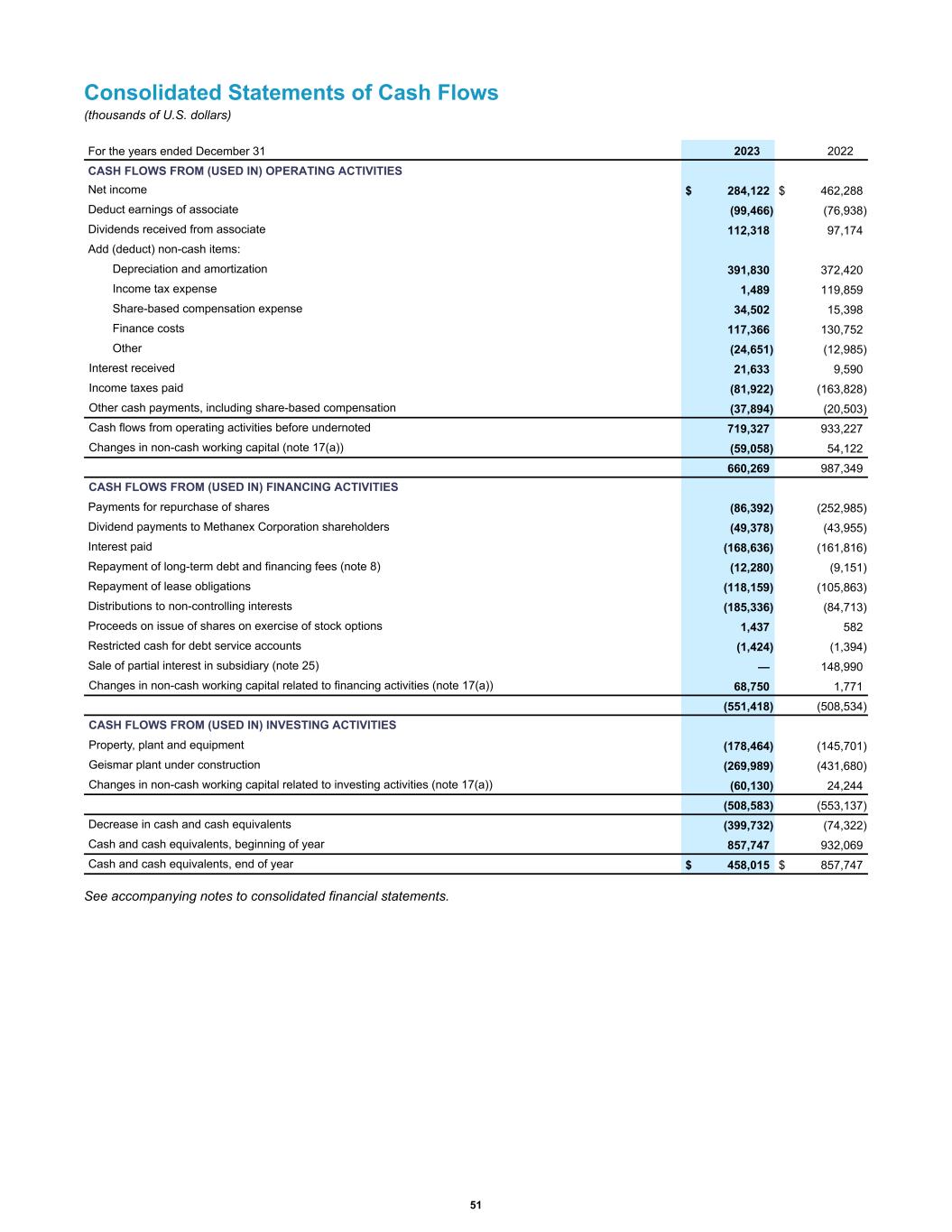 Consolidated Statements of Cash Flows (thousands of U.S. dollars) CASH FLOWS FROM (USED IN) OPERATING ACTIVITIES Net income $ 284,122 $ 462,288 Deduct earnings of associate (99,466) (76,938) Dividends received from associate 112,318 97,174 Add (deduct) non-cash items: Depreciation and amortization 391,830 372,420 Income tax expense 1,489 119,859 Share-based compensation expense 34,502 15,398 Finance costs 117,366 130,752 Other (24,651) (12,985) Interest received 21,633 9,590 Income taxes paid (81,922) (163,828) Other cash payments, including share-based compensation (37,894) (20,503) Cash flows from operating activities before undernoted 719,327 933,227 Changes in non-cash working capital (note 17(a)) (59,058) 54,122 660,269 987,349 CASH FLOWS FROM (USED IN) FINANCING ACTIVITIES Payments for repurchase of shares (86,392) (252,985) Dividend payments to Methanex Corporation shareholders (49,378) (43,955) Interest paid (168,636) (161,816) Repayment of long-term debt and financing fees (note 8) (12,280) (9,151) Repayment of lease obligations (118,159) (105,863) Distributions to non-controlling interests (185,336) (84,713) Proceeds on issue of shares on exercise of stock options 1,437 582 Restricted cash for debt service accounts (1,424) (1,394) Sale of partial interest in subsidiary (note 25) — 148,990 Changes in non-cash working capital related to financing activities (note 17(a)) 68,750 1,771 (551,418) (508,534) CASH FLOWS FROM (USED IN) INVESTING ACTIVITIES Property, plant and equipment (178,464) (145,701) Geismar plant under construction (269,989) (431,680) Changes in non-cash working capital related to investing activities (note 17(a)) (60,130) 24,244 (508,583) (553,137) Decrease in cash and cash equivalents (399,732) (74,322) Cash and cash equivalents, beginning of year 857,747 932,069 Cash and cash equivalents, end of year $ 458,015 $ 857,747 For the years ended December 31 2023 2022 See accompanying notes to consolidated financial statements. 51