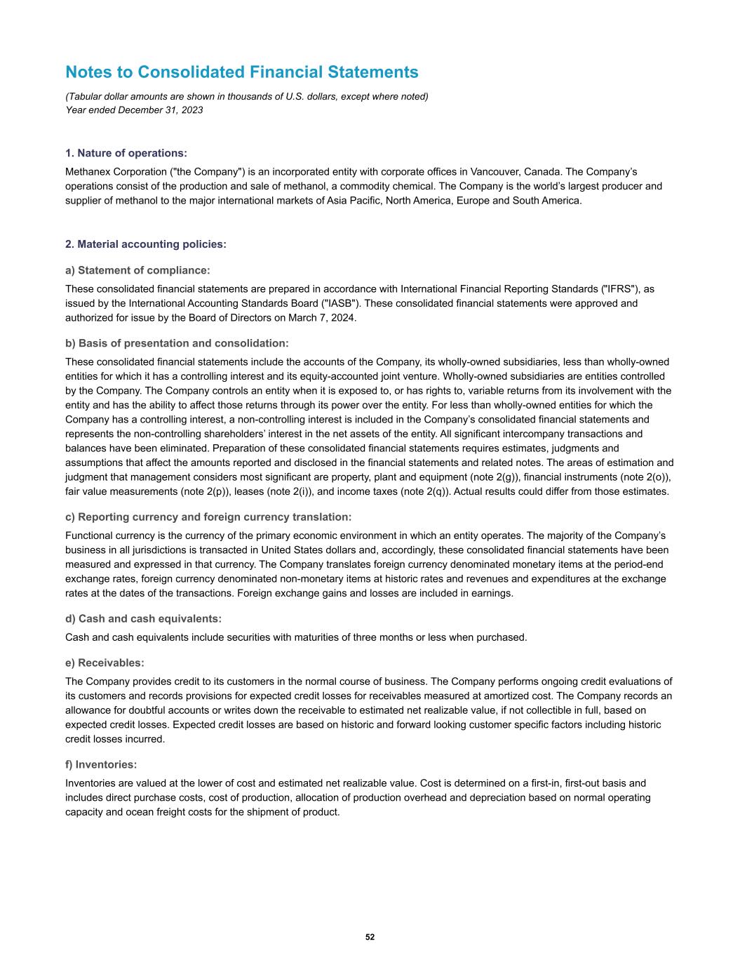 Notes to Consolidated Financial Statements (Tabular dollar amounts are shown in thousands of U.S. dollars, except where noted) Year ended December 31, 2023 1. Nature of operations: Methanex Corporation ("the Company") is an incorporated entity with corporate offices in Vancouver, Canada. The Company’s operations consist of the production and sale of methanol, a commodity chemical. The Company is the world’s largest producer and supplier of methanol to the major international markets of Asia Pacific, North America, Europe and South America. 2. Material accounting policies: a) Statement of compliance: These consolidated financial statements are prepared in accordance with International Financial Reporting Standards ("IFRS"), as issued by the International Accounting Standards Board ("IASB"). These consolidated financial statements were approved and authorized for issue by the Board of Directors on March 7, 2024. b) Basis of presentation and consolidation: These consolidated financial statements include the accounts of the Company, its wholly-owned subsidiaries, less than wholly-owned entities for which it has a controlling interest and its equity-accounted joint venture. Wholly-owned subsidiaries are entities controlled by the Company. The Company controls an entity when it is exposed to, or has rights to, variable returns from its involvement with the entity and has the ability to affect those returns through its power over the entity. For less than wholly-owned entities for which the Company has a controlling interest, a non-controlling interest is included in the Company’s consolidated financial statements and represents the non-controlling shareholders’ interest in the net assets of the entity. All significant intercompany transactions and balances have been eliminated. Preparation of these consolidated financial statements requires estimates, judgments and assumptions that affect the amounts reported and disclosed in the financial statements and related notes. The areas of estimation and judgment that management considers most significant are property, plant and equipment (note 2(g)), financial instruments (note 2(o)), fair value measurements (note 2(p)), leases (note 2(i)), and income taxes (note 2(q)). Actual results could differ from those estimates. c) Reporting currency and foreign currency translation: Functional currency is the currency of the primary economic environment in which an entity operates. The majority of the Company’s business in all jurisdictions is transacted in United States dollars and, accordingly, these consolidated financial statements have been measured and expressed in that currency. The Company translates foreign currency denominated monetary items at the period-end exchange rates, foreign currency denominated non-monetary items at historic rates and revenues and expenditures at the exchange rates at the dates of the transactions. Foreign exchange gains and losses are included in earnings. d) Cash and cash equivalents: Cash and cash equivalents include securities with maturities of three months or less when purchased. e) Receivables: The Company provides credit to its customers in the normal course of business. The Company performs ongoing credit evaluations of its customers and records provisions for expected credit losses for receivables measured at amortized cost. The Company records an allowance for doubtful accounts or writes down the receivable to estimated net realizable value, if not collectible in full, based on expected credit losses. Expected credit losses are based on historic and forward looking customer specific factors including historic credit losses incurred. f) Inventories: Inventories are valued at the lower of cost and estimated net realizable value. Cost is determined on a first-in, first-out basis and includes direct purchase costs, cost of production, allocation of production overhead and depreciation based on normal operating capacity and ocean freight costs for the shipment of product. 52