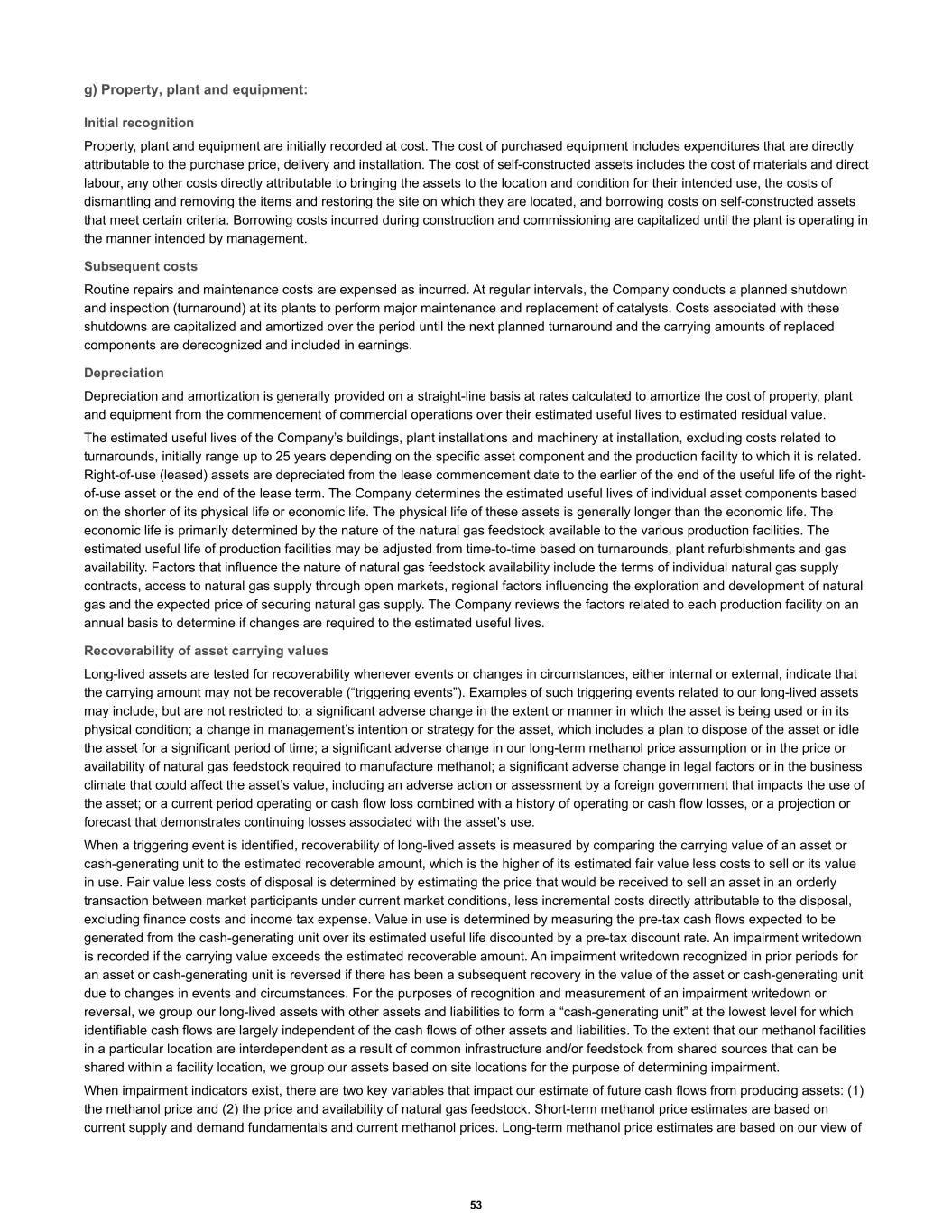 g) Property, plant and equipment: Initial recognition Property, plant and equipment are initially recorded at cost. The cost of purchased equipment includes expenditures that are directly attributable to the purchase price, delivery and installation. The cost of self-constructed assets includes the cost of materials and direct labour, any other costs directly attributable to bringing the assets to the location and condition for their intended use, the costs of dismantling and removing the items and restoring the site on which they are located, and borrowing costs on self-constructed assets that meet certain criteria. Borrowing costs incurred during construction and commissioning are capitalized until the plant is operating in the manner intended by management. Subsequent costs Routine repairs and maintenance costs are expensed as incurred. At regular intervals, the Company conducts a planned shutdown and inspection (turnaround) at its plants to perform major maintenance and replacement of catalysts. Costs associated with these shutdowns are capitalized and amortized over the period until the next planned turnaround and the carrying amounts of replaced components are derecognized and included in earnings. Depreciation Depreciation and amortization is generally provided on a straight-line basis at rates calculated to amortize the cost of property, plant and equipment from the commencement of commercial operations over their estimated useful lives to estimated residual value. The estimated useful lives of the Company’s buildings, plant installations and machinery at installation, excluding costs related to turnarounds, initially range up to 25 years depending on the specific asset component and the production facility to which it is related. Right-of-use (leased) assets are depreciated from the lease commencement date to the earlier of the end of the useful life of the right- of-use asset or the end of the lease term. The Company determines the estimated useful lives of individual asset components based on the shorter of its physical life or economic life. The physical life of these assets is generally longer than the economic life. The economic life is primarily determined by the nature of the natural gas feedstock available to the various production facilities. The estimated useful life of production facilities may be adjusted from time-to-time based on turnarounds, plant refurbishments and gas availability. Factors that influence the nature of natural gas feedstock availability include the terms of individual natural gas supply contracts, access to natural gas supply through open markets, regional factors influencing the exploration and development of natural gas and the expected price of securing natural gas supply. The Company reviews the factors related to each production facility on an annual basis to determine if changes are required to the estimated useful lives. Recoverability of asset carrying values Long-lived assets are tested for recoverability whenever events or changes in circumstances, either internal or external, indicate that the carrying amount may not be recoverable (“triggering events”). Examples of such triggering events related to our long-lived assets may include, but are not restricted to: a significant adverse change in the extent or manner in which the asset is being used or in its physical condition; a change in management’s intention or strategy for the asset, which includes a plan to dispose of the asset or idle the asset for a significant period of time; a significant adverse change in our long-term methanol price assumption or in the price or availability of natural gas feedstock required to manufacture methanol; a significant adverse change in legal factors or in the business climate that could affect the asset’s value, including an adverse action or assessment by a foreign government that impacts the use of the asset; or a current period operating or cash flow loss combined with a history of operating or cash flow losses, or a projection or forecast that demonstrates continuing losses associated with the asset’s use. When a triggering event is identified, recoverability of long-lived assets is measured by comparing the carrying value of an asset or cash-generating unit to the estimated recoverable amount, which is the higher of its estimated fair value less costs to sell or its value in use. Fair value less costs of disposal is determined by estimating the price that would be received to sell an asset in an orderly transaction between market participants under current market conditions, less incremental costs directly attributable to the disposal, excluding finance costs and income tax expense. Value in use is determined by measuring the pre-tax cash flows expected to be generated from the cash-generating unit over its estimated useful life discounted by a pre-tax discount rate. An impairment writedown is recorded if the carrying value exceeds the estimated recoverable amount. An impairment writedown recognized in prior periods for an asset or cash-generating unit is reversed if there has been a subsequent recovery in the value of the asset or cash-generating unit due to changes in events and circumstances. For the purposes of recognition and measurement of an impairment writedown or reversal, we group our long-lived assets with other assets and liabilities to form a “cash-generating unit” at the lowest level for which identifiable cash flows are largely independent of the cash flows of other assets and liabilities. To the extent that our methanol facilities in a particular location are interdependent as a result of common infrastructure and/or feedstock from shared sources that can be shared within a facility location, we group our assets based on site locations for the purpose of determining impairment. When impairment indicators exist, there are two key variables that impact our estimate of future cash flows from producing assets: (1) th