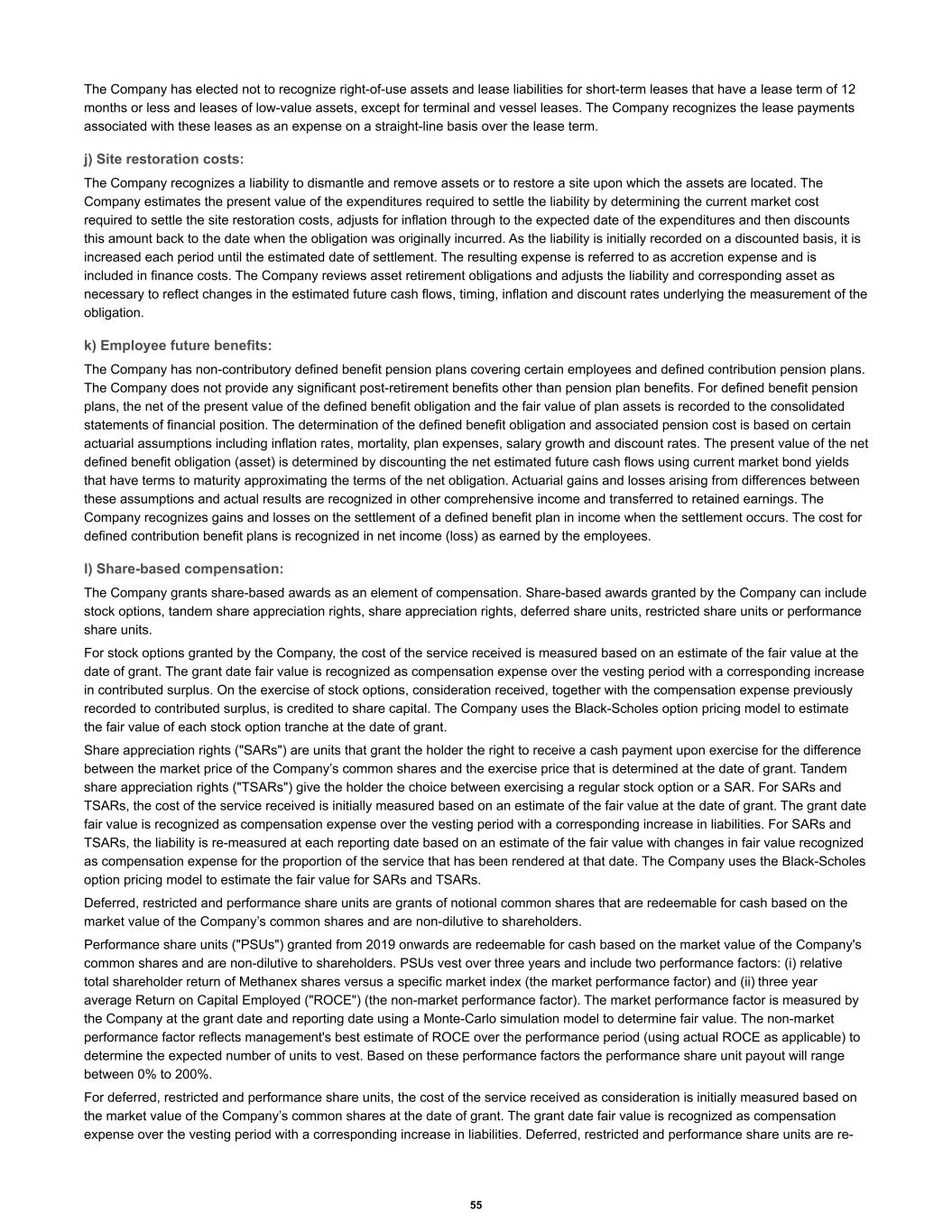 The Company has elected not to recognize right-of-use assets and lease liabilities for short-term leases that have a lease term of 12 months or less and leases of low-value assets, except for terminal and vessel leases. The Company recognizes the lease payments associated with these leases as an expense on a straight-line basis over the lease term. j) Site restoration costs: The Company recognizes a liability to dismantle and remove assets or to restore a site upon which the assets are located. The Company estimates the present value of the expenditures required to settle the liability by determining the current market cost required to settle the site restoration costs, adjusts for inflation through to the expected date of the expenditures and then discounts this amount back to the date when the obligation was originally incurred. As the liability is initially recorded on a discounted basis, it is increased each period until the estimated date of settlement. The resulting expense is referred to as accretion expense and is included in finance costs. The Company reviews asset retirement obligations and adjusts the liability and corresponding asset as necessary to reflect changes in the estimated future cash flows, timing, inflation and discount rates underlying the measurement of the obligation. k) Employee future benefits: The Company has non-contributory defined benefit pension plans covering certain employees and defined contribution pension plans. The Company does not provide any significant post-retirement benefits other than pension plan benefits. For defined benefit pension plans, the net of the present value of the defined benefit obligation and the fair value of plan assets is recorded to the consolidated statements of financial position. The determination of the defined benefit obligation and associated pension cost is based on certain actuarial assumptions including inflation rates, mortality, plan expenses, salary growth and discount rates. The present value of the net defined benefit obligation (asset) is determined by discounting the net estimated future cash flows using current market bond yields that have terms to maturity approximating the terms of the net obligation. Actuarial gains and losses arising from differences between these assumptions and actual results are recognized in other comprehensive income and transferred to retained earnings. The Company recognizes gains and losses on the settlement of a defined benefit plan in income when the settlement occurs. The cost for defined contribution benefit plans is recognized in net income (loss) as earned by the employees. l) Share-based compensation: The Company grants share-based awards as an element of compensation. Share-based awards granted by the Company can include stock options, tandem share appreciation rights, share appreciation rights, deferred share units, restricted share units or performance share units. For stock options granted by the Company, the cost of the service received is measured based on an estimate of the fair value at the date of grant. The grant date fair value is recognized as compensation expense over the vesting period with a corresponding increase in contributed surplus. On the exercise of stock options, consideration received, together with the compensation expense previously recorded to contributed surplus, is credited to share capital. The Company uses the Black-Scholes option pricing model to estimate the fair value of each stock option tranche at the date of grant. Share appreciation rights ("SARs") are units that grant the holder the right to receive a cash payment upon exercise for the difference between the market price of the Company’s common shares and the exercise price that is determined at the date of grant. Tandem share appreciation rights ("TSARs") give the holder the choice between exercising a regular stock option or a SAR. For SARs and TSARs, the cost of the service received is initially measured based on an estimate of the fair value at the date of grant. The grant date fair value is recognized as compensation expense over the vesting period with a corresponding increase in liabilities. For SARs and TSARs, the liability is re-measured at each reporting date based on an estimate of the fair value with changes in fair value recognized as compensation expense for the proportion of the service that has been rendered at that date. The Company uses the Black-Scholes option pricing model to estimate the fair value for SARs and TSARs. Deferred, restricted and performance share units are grants of notional common shares that are redeemable for cash based on the market value of the Company’s common shares and are non-dilutive to shareholders. Performance share units ("PSUs") granted from 2019 onwards are redeemable for cash based on the market value of the Company's common shares and are non-dilutive to shareholders. PSUs vest over three years and include two performance factors: (i) relative total shareholder return of Methanex shares versus a specific market index (the market performance factor) and (ii) three year average Return on Capital Employed ("ROCE") (the non-market performance factor). The market performance factor is measured by the Company at the grant date and reporting date using a Monte-Carlo simulation model to determine fair value. The non-market performance factor reflects management's best estimate of ROCE over the performance period (using actual ROCE as applicable) to determine the expected number of units to vest. Based on these performance factors the performance share unit payout will range between 0% to 200%. For deferred, restricted and performance share units, the cost of the service received as consideration is initially measured based on the market value of the Company’s common shares at the date of grant. The grant date fair value is recognized as compensation expense over the vesting period with a corresponding increase in liabilities. Deferred,