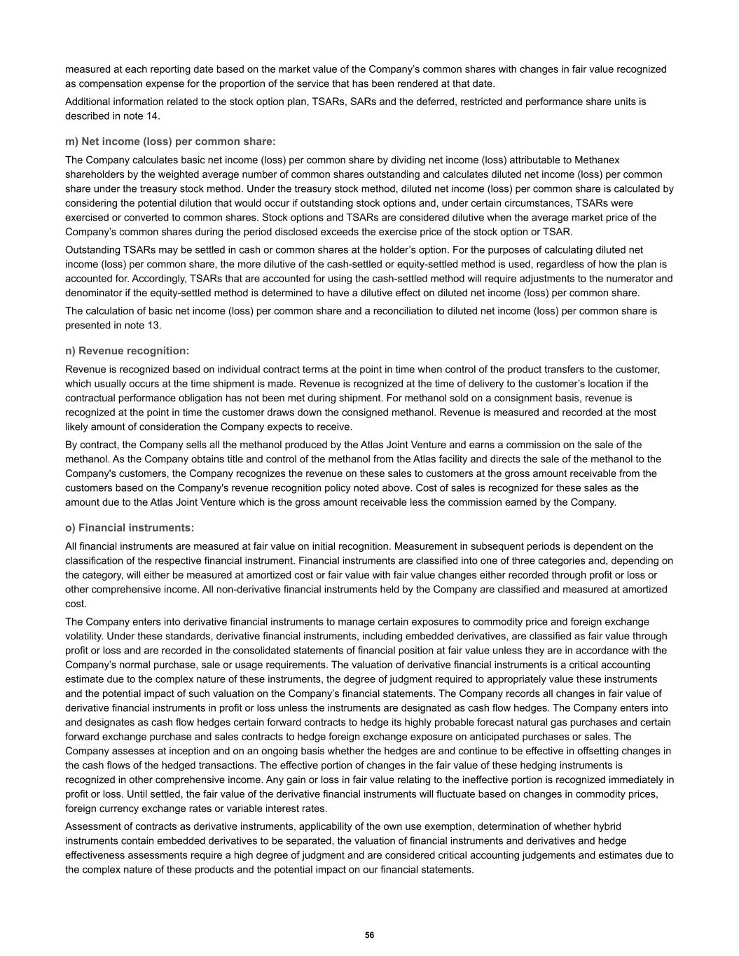 measured at each reporting date based on the market value of the Company’s common shares with changes in fair value recognized as compensation expense for the proportion of the service that has been rendered at that date. Additional information related to the stock option plan, TSARs, SARs and the deferred, restricted and performance share units is described in note 14. m) Net income (loss) per common share: The Company calculates basic net income (loss) per common share by dividing net income (loss) attributable to Methanex shareholders by the weighted average number of common shares outstanding and calculates diluted net income (loss) per common share under the treasury stock method. Under the treasury stock method, diluted net income (loss) per common share is calculated by considering the potential dilution that would occur if outstanding stock options and, under certain circumstances, TSARs were exercised or converted to common shares. Stock options and TSARs are considered dilutive when the average market price of the Company’s common shares during the period disclosed exceeds the exercise price of the stock option or TSAR. Outstanding TSARs may be settled in cash or common shares at the holder’s option. For the purposes of calculating diluted net income (loss) per common share, the more dilutive of the cash-settled or equity-settled method is used, regardless of how the plan is accounted for. Accordingly, TSARs that are accounted for using the cash-settled method will require adjustments to the numerator and denominator if the equity-settled method is determined to have a dilutive effect on diluted net income (loss) per common share. The calculation of basic net income (loss) per common share and a reconciliation to diluted net income (loss) per common share is presented in note 13. n) Revenue recognition: Revenue is recognized based on individual contract terms at the point in time when control of the product transfers to the customer, which usually occurs at the time shipment is made. Revenue is recognized at the time of delivery to the customer’s location if the contractual performance obligation has not been met during shipment. For methanol sold on a consignment basis, revenue is recognized at the point in time the customer draws down the consigned methanol. Revenue is measured and recorded at the most likely amount of consideration the Company expects to receive. By contract, the Company sells all the methanol produced by the Atlas Joint Venture and earns a commission on the sale of the methanol. As the Company obtains title and control of the methanol from the Atlas facility and directs the sale of the methanol to the Company's customers, the Company recognizes the revenue on these sales to customers at the gross amount receivable from the customers based on the Company's revenue recognition policy noted above. Cost of sales is recognized for these sales as the amount due to the Atlas Joint Venture which is the gross amount receivable less the commission earned by the Company. o) Financial instruments: All financial instruments are measured at fair value on initial recognition. Measurement in subsequent periods is dependent on the classification of the respective financial instrument. Financial instruments are classified into one of three categories and, depending on the category, will either be measured at amortized cost or fair value with fair value changes either recorded through profit or loss or other comprehensive income. All non-derivative financial instruments held by the Company are classified and measured at amortized cost. The Company enters into derivative financial instruments to manage certain exposures to commodity price and foreign exchange volatility. Under these standards, derivative financial instruments, including embedded derivatives, are classified as fair value through profit or loss and are recorded in the consolidated statements of financial position at fair value unless they are in accordance with the Company’s normal purchase, sale or usage requirements. The valuation of derivative financial instruments is a critical accounting estimate due to the complex nature of these instruments, the degree of judgment required to appropriately value these instruments and the potential impact of such valuation on the Company’s financial statements. The Company records all changes in fair value of derivative financial instruments in profit or loss unless the instruments are designated as cash flow hedges. The Company enters into and designates as cash flow hedges certain forward contracts to hedge its highly probable forecast natural gas purchases and certain forward exchange purchase and sales contracts to hedge foreign exchange exposure on anticipated purchases or sales. The Company assesses at inception and on an ongoing basis whether the hedges are and continue to be effective in offsetting changes in the cash flows of the hedged transactions. The effective portion of changes in the fair value of these hedging instruments is recognized in other comprehensive income. Any gain or loss in fair value relating to the ineffective portion is recognized immediately in profit or loss. Until settled, the fair value of the derivative financial instruments will fluctuate based on changes in commodity prices, foreign currency exchange rates or variable interest rates. Assessment of contracts as derivative instruments, applicability of the own use exemption, determination of whether hybrid instruments contain embedded derivatives to be separated, the valuation of financial instruments and derivatives and hedge effectiveness assessments require a high degree of judgment and are considered critical accounting judgements and estimates due to the complex nature of these products and the potential impact on our financial statements. 56
