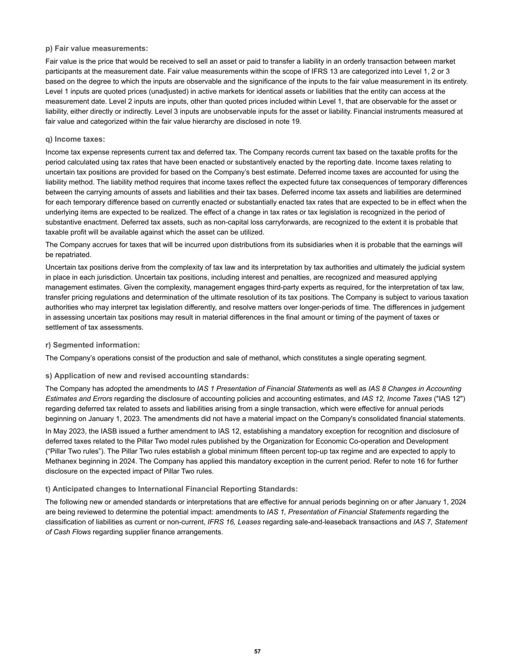 p) Fair value measurements: Fair value is the price that would be received to sell an asset or paid to transfer a liability in an orderly transaction between market participants at the measurement date. Fair value measurements within the scope of IFRS 13 are categorized into Level 1, 2 or 3 based on the degree to which the inputs are observable and the significance of the inputs to the fair value measurement in its entirety. Level 1 inputs are quoted prices (unadjusted) in active markets for identical assets or liabilities that the entity can access at the measurement date. Level 2 inputs are inputs, other than quoted prices included within Level 1, that are observable for the asset or liability, either directly or indirectly. Level 3 inputs are unobservable inputs for the asset or liability. Financial instruments measured at fair value and categorized within the fair value hierarchy are disclosed in note 19. q) Income taxes: Income tax expense represents current tax and deferred tax. The Company records current tax based on the taxable profits for the period calculated using tax rates that have been enacted or substantively enacted by the reporting date. Income taxes relating to uncertain tax positions are provided for based on the Company’s best estimate. Deferred income taxes are accounted for using the liability method. The liability method requires that income taxes reflect the expected future tax consequences of temporary differences between the carrying amounts of assets and liabilities and their tax bases. Deferred income tax assets and liabilities are determined for each temporary difference based on currently enacted or substantially enacted tax rates that are expected to be in effect when the underlying items are expected to be realized. The effect of a change in tax rates or tax legislation is recognized in the period of substantive enactment. Deferred tax assets, such as non-capital loss carryforwards, are recognized to the extent it is probable that taxable profit will be available against which the asset can be utilized. The Company accrues for taxes that will be incurred upon distributions from its subsidiaries when it is probable that the earnings will be repatriated. Uncertain tax positions derive from the complexity of tax law and its interpretation by tax authorities and ultimately the judicial system in place in each jurisdiction. Uncertain tax positions, including interest and penalties, are recognized and measured applying management estimates. Given the complexity, management engages third-party experts as required, for the interpretation of tax law, transfer pricing regulations and determination of the ultimate resolution of its tax positions. The Company is subject to various taxation authorities who may interpret tax legislation differently, and resolve matters over longer-periods of time. The differences in judgement in assessing uncertain tax positions may result in material differences in the final amount or timing of the payment of taxes or settlement of tax assessments. r) Segmented information: The Company’s operations consist of the production and sale of methanol, which constitutes a single operating segment. s) Application of new and revised accounting standards: The Company has adopted the amendments to IAS 1 Presentation of Financial Statements as well as IAS 8 Changes in Accounting Estimates and Errors regarding the disclosure of accounting policies and accounting estimates, and IAS 12, Income Taxes ("IAS 12") regarding deferred tax related to assets and liabilities arising from a single transaction, which were effective for annual periods beginning on January 1, 2023. The amendments did not have a material impact on the Company's consolidated financial statements. In May 2023, the IASB issued a further amendment to IAS 12, establishing a mandatory exception for recognition and disclosure of deferred taxes related to the Pillar Two model rules published by the Organization for Economic Co-operation and Development (“Pillar Two rules”). The Pillar Two rules establish a global minimum fifteen percent top-up tax regime and are expected to apply to Methanex beginning in 2024. The Company has applied this mandatory exception in the current period. Refer to note 16 for further disclosure on the expected impact of Pillar Two rules. t) Anticipated changes to International Financial Reporting Standards: The following new or amended standards or interpretations that are effective for annual periods beginning on or after January 1, 2024 are being reviewed to determine the potential impact: amendments to IAS 1, Presentation of Financial Statements regarding the classification of liabilities as current or non-current, IFRS 16, Leases regarding sale-and-leaseback transactions and IAS 7, Statement of Cash Flows regarding supplier finance arrangements. 57