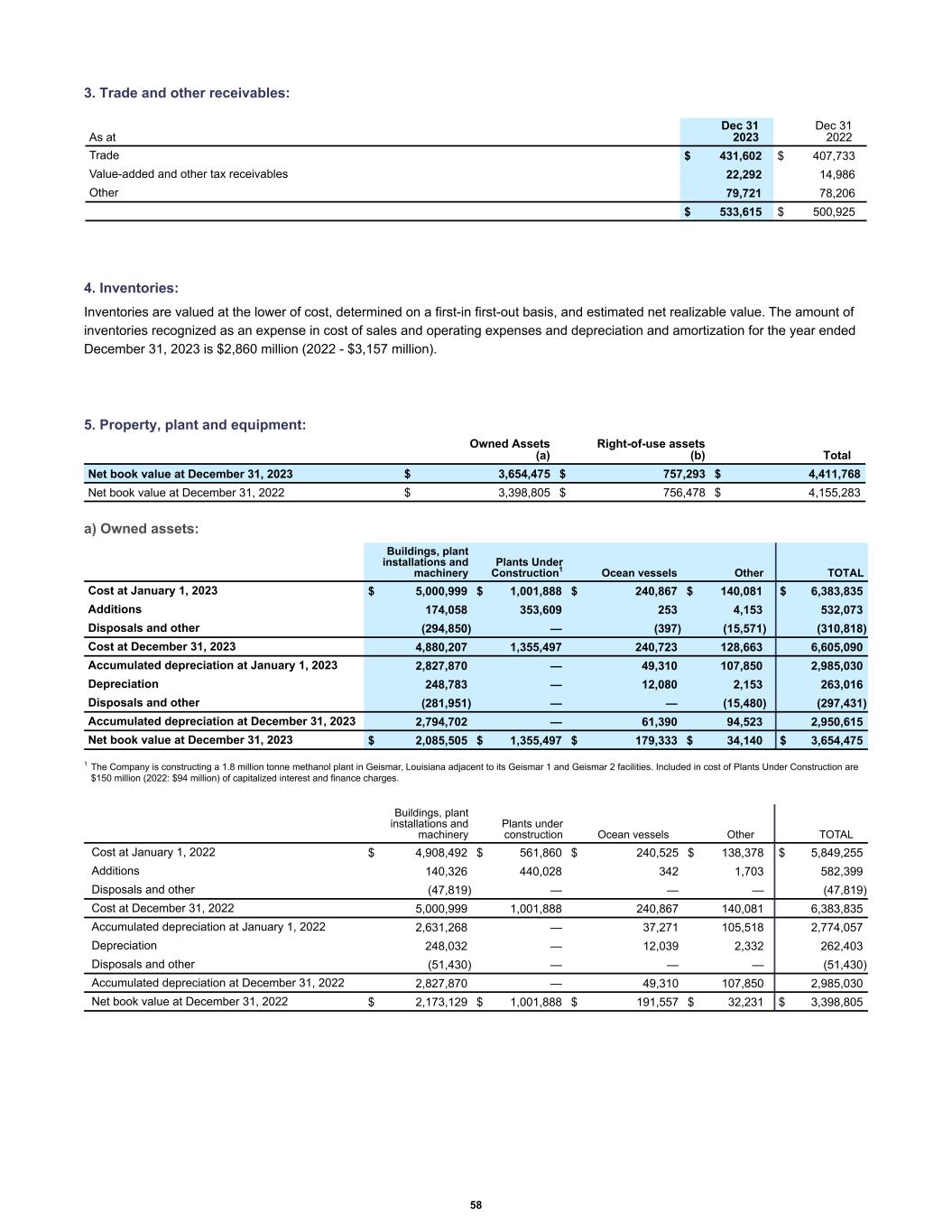 3. Trade and other receivables: Trade $ 431,602 $ 407,733 Value-added and other tax receivables 22,292 14,986 Other 79,721 78,206 $ 533,615 $ 500,925 As at Dec 31 2023 Dec 31 2022 4. Inventories: Inventories are valued at the lower of cost, determined on a first-in first-out basis, and estimated net realizable value. The amount of inventories recognized as an expense in cost of sales and operating expenses and depreciation and amortization for the year ended December 31, 2023 is $2,860 million (2022 - $3,157 million). 5. Property, plant and equipment: Net book value at December 31, 2023 $ 3,654,475 $ 757,293 $ 4,411,768 Net book value at December 31, 2022 $ 3,398,805 $ 756,478 $ 4,155,283 Owned Assets (a) Right-of-use assets (b) Total a) Owned assets: Cost at January 1, 2023 $ 5,000,999 $ 1,001,888 $ 240,867 $ 140,081 $ 6,383,835 Additions 174,058 353,609 253 4,153 532,073 Disposals and other (294,850) — (397) (15,571) (310,818) Cost at December 31, 2023 4,880,207 1,355,497 240,723 128,663 6,605,090 Accumulated depreciation at January 1, 2023 2,827,870 — 49,310 107,850 2,985,030 Depreciation 248,783 — 12,080 2,153 263,016 Disposals and other (281,951) — — (15,480) (297,431) Accumulated depreciation at December 31, 2023 2,794,702 — 61,390 94,523 2,950,615 Net book value at December 31, 2023 $ 2,085,505 $ 1,355,497 $ 179,333 $ 34,140 $ 3,654,475 Buildings, plant installations and machinery Plants Under Construction1 Ocean vessels Other TOTAL 1 The Company is constructing a 1.8 million tonne methanol plant in Geismar, Louisiana adjacent to its Geismar 1 and Geismar 2 facilities. Included in cost of Plants Under Construction are $150 million (2022: $94 million) of capitalized interest and finance charges. Cost at January 1, 2022 $ 4,908,492 $ 561,860 $ 240,525 $ 138,378 $ 5,849,255 Additions 140,326 440,028 342 1,703 582,399 Disposals and other (47,819) — — — (47,819) Cost at December 31, 2022 5,000,999 1,001,888 240,867 140,081 6,383,835 Accumulated depreciation at January 1, 2022 2,631,268 — 37,271 105,518 2,774,057 Depreciation 248,032 — 12,039 2,332 262,403 Disposals and other (51,430) — — — (51,430) Accumulated depreciation at December 31, 2022 2,827,870 — 49,310 107,850 2,985,030 Net book value at December 31, 2022 $ 2,173,129 $ 1,001,888 $ 191,557 $ 32,231 $ 3,398,805 Buildings, plant installations and machinery Plants under construction Ocean vessels Other TOTAL 58