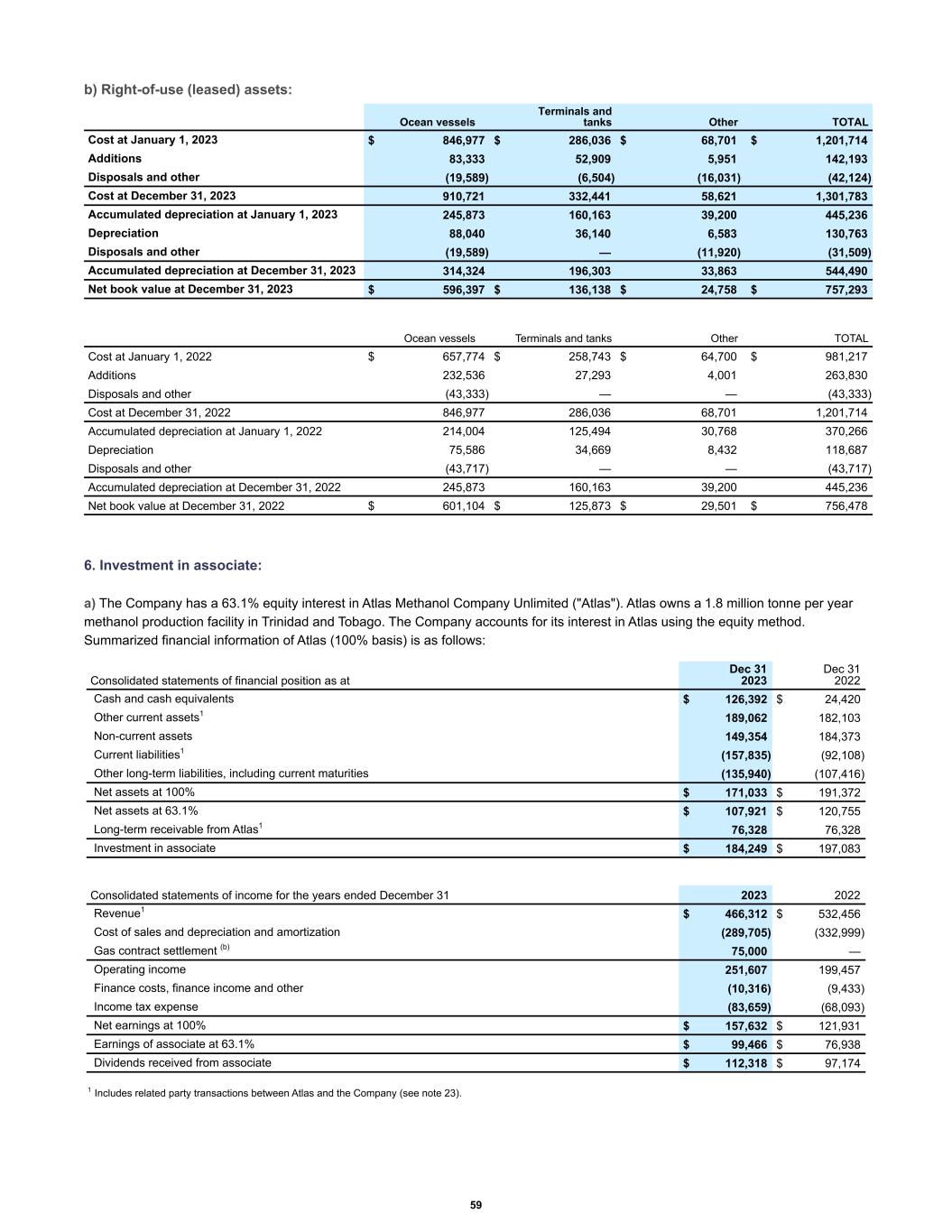 b) Right-of-use (leased) assets: Cost at January 1, 2023 $ 846,977 $ 286,036 $ 68,701 $ 1,201,714 Additions 83,333 52,909 5,951 142,193 Disposals and other (19,589) (6,504) (16,031) (42,124) Cost at December 31, 2023 910,721 332,441 58,621 1,301,783 Accumulated depreciation at January 1, 2023 245,873 160,163 39,200 445,236 Depreciation 88,040 36,140 6,583 130,763 Disposals and other (19,589) — (11,920) (31,509) Accumulated depreciation at December 31, 2023 314,324 196,303 33,863 544,490 Net book value at December 31, 2023 $ 596,397 $ 136,138 $ 24,758 $ 757,293 Ocean vessels Terminals and tanks Other TOTAL Ocean vessels Terminals and tanks Other TOTAL Cost at January 1, 2022 $ 657,774 $ 258,743 $ 64,700 $ 981,217 Additions 232,536 27,293 4,001 263,830 Disposals and other (43,333) — — (43,333) Cost at December 31, 2022 846,977 286,036 68,701 1,201,714 Accumulated depreciation at January 1, 2022 214,004 125,494 30,768 370,266 Depreciation 75,586 34,669 8,432 118,687 Disposals and other (43,717) — — (43,717) Accumulated depreciation at December 31, 2022 245,873 160,163 39,200 445,236 Net book value at December 31, 2022 $ 601,104 $ 125,873 $ 29,501 $ 756,478 6. Investment in associate: a) The Company has a 63.1% equity interest in Atlas Methanol Company Unlimited ("Atlas"). Atlas owns a 1.8 million tonne per year methanol production facility in Trinidad and Tobago. The Company accounts for its interest in Atlas using the equity method. Summarized financial information of Atlas (100% basis) is as follows: Cash and cash equivalents $ 126,392 $ 24,420 Other current assets1 189,062 182,103 Non-current assets 149,354 184,373 Current liabilities1 (157,835) (92,108) Other long-term liabilities, including current maturities (135,940) (107,416) Net assets at 100% $ 171,033 $ 191,372 Net assets at 63.1% $ 107,921 $ 120,755 Long-term receivable from Atlas1 76,328 76,328 Investment in associate $ 184,249 $ 197,083 Consolidated statements of financial position as at Dec 31 2023 Dec 31 2022 Revenue1 $ 466,312 $ 532,456 Cost of sales and depreciation and amortization (289,705) (332,999) Gas contract settlement (b) 75,000 — Operating income 251,607 199,457 Finance costs, finance income and other (10,316) (9,433) Income tax expense (83,659) (68,093) Net earnings at 100% $ 157,632 $ 121,931 Earnings of associate at 63.1% $ 99,466 $ 76,938 Dividends received from associate $ 112,318 $ 97,174 Consolidated statements of income for the years ended December 31 2023 2022 1 Includes related party transactions between Atlas and the Company (see note 23). 59