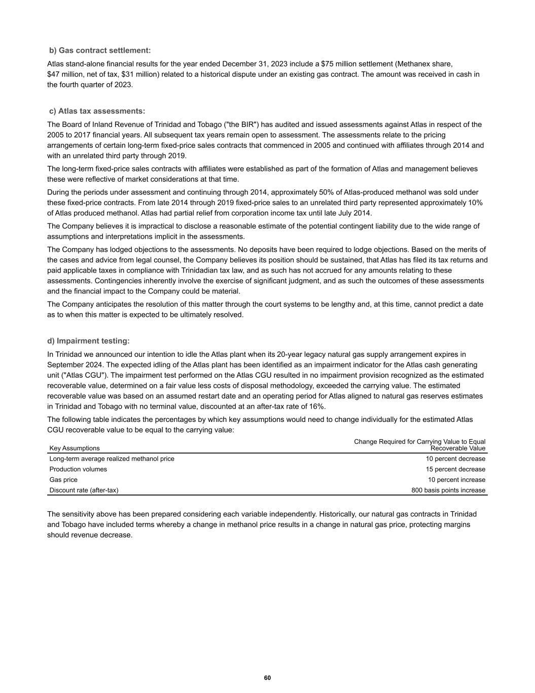 b) Gas contract settlement: Atlas stand-alone financial results for the year ended December 31, 2023 include a $75 million settlement (Methanex share, $47 million, net of tax, $31 million) related to a historical dispute under an existing gas contract. The amount was received in cash in the fourth quarter of 2023. c) Atlas tax assessments: The Board of Inland Revenue of Trinidad and Tobago ("the BIR") has audited and issued assessments against Atlas in respect of the 2005 to 2017 financial years. All subsequent tax years remain open to assessment. The assessments relate to the pricing arrangements of certain long-term fixed-price sales contracts that commenced in 2005 and continued with affiliates through 2014 and with an unrelated third party through 2019. The long-term fixed-price sales contracts with affiliates were established as part of the formation of Atlas and management believes these were reflective of market considerations at that time. During the periods under assessment and continuing through 2014, approximately 50% of Atlas-produced methanol was sold under these fixed-price contracts. From late 2014 through 2019 fixed-price sales to an unrelated third party represented approximately 10% of Atlas produced methanol. Atlas had partial relief from corporation income tax until late July 2014. The Company believes it is impractical to disclose a reasonable estimate of the potential contingent liability due to the wide range of assumptions and interpretations implicit in the assessments. The Company has lodged objections to the assessments. No deposits have been required to lodge objections. Based on the merits of the cases and advice from legal counsel, the Company believes its position should be sustained, that Atlas has filed its tax returns and paid applicable taxes in compliance with Trinidadian tax law, and as such has not accrued for any amounts relating to these assessments. Contingencies inherently involve the exercise of significant judgment, and as such the outcomes of these assessments and the financial impact to the Company could be material. The Company anticipates the resolution of this matter through the court systems to be lengthy and, at this time, cannot predict a date as to when this matter is expected to be ultimately resolved. d) Impairment testing: In Trinidad we announced our intention to idle the Atlas plant when its 20-year legacy natural gas supply arrangement expires in September 2024. The expected idling of the Atlas plant has been identified as an impairment indicator for the Atlas cash generating unit ("Atlas CGU"). The impairment test performed on the Atlas CGU resulted in no impairment provision recognized as the estimated recoverable value, determined on a fair value less costs of disposal methodology, exceeded the carrying value. The estimated recoverable value was based on an assumed restart date and an operating period for Atlas aligned to natural gas reserves estimates in Trinidad and Tobago with no terminal value, discounted at an after-tax rate of 16%. The following table indicates the percentages by which key assumptions would need to change individually for the estimated Atlas CGU recoverable value to be equal to the carrying value: Key Assumptions Change Required for Carrying Value to Equal Recoverable Value Long-term average realized methanol price 10 percent decrease Production volumes 15 percent decrease Gas price 10 percent increase Discount rate (after-tax) 800 basis points increase The sensitivity above has been prepared considering each variable independently. Historically, our natural gas contracts in Trinidad and Tobago have included terms whereby a change in methanol price results in a change in natural gas price, protecting margins should revenue decrease. 60
