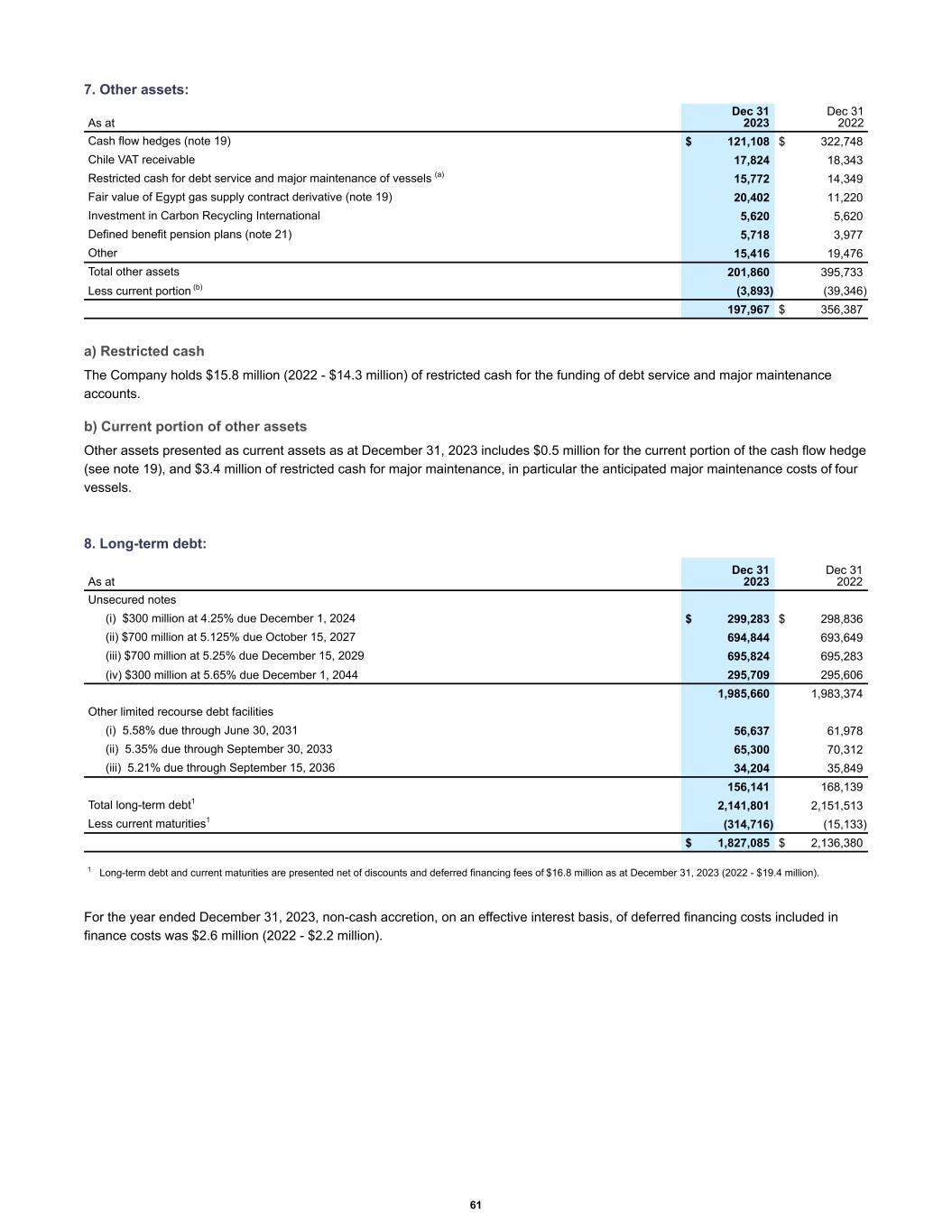 7. Other assets: Cash flow hedges (note 19) $ 121,108 $ 322,748 Chile VAT receivable 17,824 18,343 Restricted cash for debt service and major maintenance of vessels (a) 15,772 14,349 Fair value of Egypt gas supply contract derivative (note 19) 20,402 11,220 Investment in Carbon Recycling International 5,620 5,620 Defined benefit pension plans (note 21) 5,718 3,977 Other 15,416 19,476 Total other assets 201,860 395,733 Less current portion (b) (3,893) (39,346) 197,967 $ 356,387 As at Dec 31 2023 Dec 31 2022 a) Restricted cash The Company holds $15.8 million (2022 - $14.3 million) of restricted cash for the funding of debt service and major maintenance accounts. b) Current portion of other assets Other assets presented as current assets as at December 31, 2023 includes $0.5 million for the current portion of the cash flow hedge (see note 19), and $3.4 million of restricted cash for major maintenance, in particular the anticipated major maintenance costs of four vessels. 8. Long-term debt: Unsecured notes (i) $300 million at 4.25% due December 1, 2024 $ 299,283 $ 298,836 (ii) $700 million at 5.125% due October 15, 2027 694,844 693,649 (iii) $700 million at 5.25% due December 15, 2029 695,824 695,283 (iv) $300 million at 5.65% due December 1, 2044 295,709 295,606 1,985,660 1,983,374 Other limited recourse debt facilities (i) 5.58% due through June 30, 2031 56,637 61,978 (ii) 5.35% due through September 30, 2033 65,300 70,312 (iii) 5.21% due through September 15, 2036 34,204 35,849 156,141 168,139 Total long-term debt1 2,141,801 2,151,513 Less current maturities1 (314,716) (15,133) $ 1,827,085 $ 2,136,380 As at Dec 31 2023 Dec 31 2022 1 Long-term debt and current maturities are presented net of discounts and deferred financing fees of $16.8 million as at December 31, 2023 (2022 - $19.4 million). For the year ended December 31, 2023, non-cash accretion, on an effective interest basis, of deferred financing costs included in finance costs was $2.6 million (2022 - $2.2 million). 61