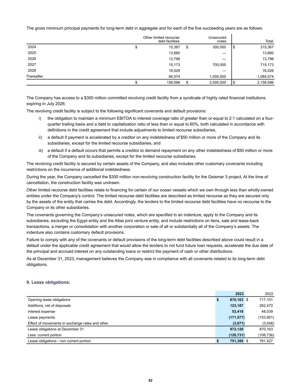 The gross minimum principal payments for long-term debt in aggregate and for each of the five succeeding years are as follows: Other limited recourse debt facilities Unsecured notes Total 2024 $ 15,367 $ 300,000 $ 315,367 2025 13,660 — 13,660 2026 13,796 — 13,796 2027 15,173 700,000 715,173 2028 16,026 — 16,026 Thereafter 84,574 1,000,000 1,084,574 $ 158,596 $ 2,000,000 $ 2,158,596 The Company has access to a $300 million committed revolving credit facility from a syndicate of highly rated financial institutions expiring in July 2026. The revolving credit facility is subject to the following significant covenants and default provisions: i) the obligation to maintain a minimum EBITDA to interest coverage ratio of greater than or equal to 2:1 calculated on a four- quarter trailing basis and a debt to capitalization ratio of less than or equal to 60%, both calculated in accordance with definitions in the credit agreement that include adjustments to limited recourse subsidiaries, ii) a default if payment is accelerated by a creditor on any indebtedness of $50 million or more of the Company and its subsidiaries, except for the limited recourse subsidiaries, and iii) a default if a default occurs that permits a creditor to demand repayment on any other indebtedness of $50 million or more of the Company and its subsidiaries, except for the limited recourse subsidiaries. The revolving credit facility is secured by certain assets of the Company, and also includes other customary covenants including restrictions on the incurrence of additional indebtedness. During the year, the Company cancelled the $300 million non-revolving construction facility for the Geismar 3 project. At the time of cancellation, the construction facility was undrawn. Other limited recourse debt facilities relate to financing for certain of our ocean vessels which we own through less than wholly-owned entities under the Company's control. The limited recourse debt facilities are described as limited recourse as they are secured only by the assets of the entity that carries the debt. Accordingly, the lenders to the limited recourse debt facilities have no recourse to the Company or its other subsidiaries. The covenants governing the Company’s unsecured notes, which are specified in an indenture, apply to the Company and its subsidiaries, excluding the Egypt entity and the Atlas joint venture entity, and include restrictions on liens, sale and lease-back transactions, a merger or consolidation with another corporation or sale of all or substantially all of the Company’s assets. The indenture also contains customary default provisions. Failure to comply with any of the covenants or default provisions of the long-term debt facilities described above could result in a default under the applicable credit agreement that would allow the lenders to not fund future loan requests, accelerate the due date of the principal and accrued interest on any outstanding loans or restrict the payment of cash or other distributions. As at December 31, 2023, management believes the Company was in compliance with all covenants related to its long-term debt obligations. 9. Lease obligations: 2023 2022 Opening lease obligations $ 870,163 $ 717,101 Additions, net of disposals 123,187 262,470 Interest expense 53,418 48,039 Lease payments (171,577) (153,901) Effect of movements in exchange rates and other (3,071) (3,546) Lease obligations at December 31 872,120 870,163 Less: current portion (120,731) (108,736) Lease obligations - non current portion $ 751,389 $ 761,427 62