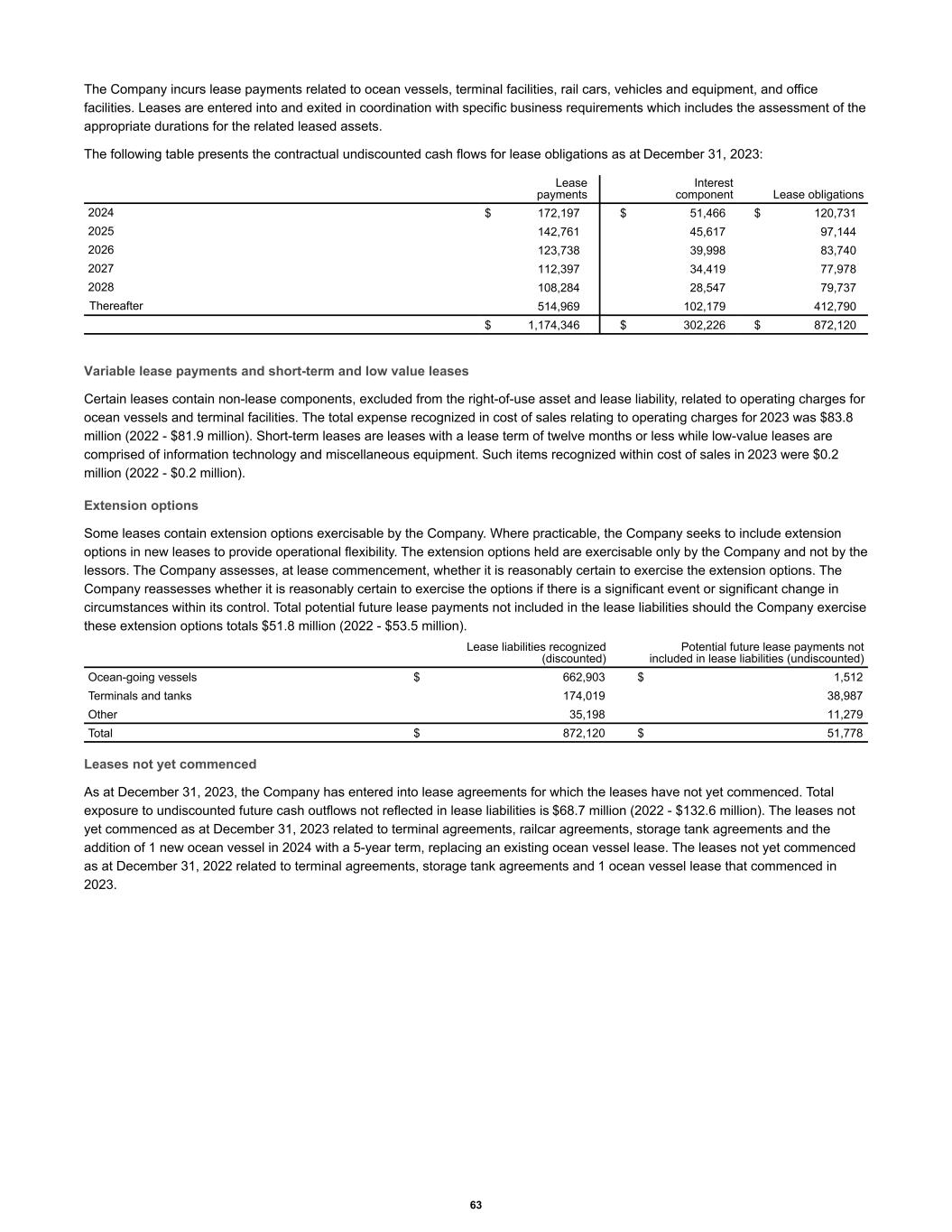 The Company incurs lease payments related to ocean vessels, terminal facilities, rail cars, vehicles and equipment, and office facilities. Leases are entered into and exited in coordination with specific business requirements which includes the assessment of the appropriate durations for the related leased assets. The following table presents the contractual undiscounted cash flows for lease obligations as at December 31, 2023: Lease payments Interest component Lease obligations 2024 $ 172,197 $ 51,466 $ 120,731 2025 142,761 45,617 97,144 2026 123,738 39,998 83,740 2027 112,397 34,419 77,978 2028 108,284 28,547 79,737 Thereafter 514,969 102,179 412,790 $ 1,174,346 $ 302,226 $ 872,120 Variable lease payments and short-term and low value leases Certain leases contain non-lease components, excluded from the right-of-use asset and lease liability, related to operating charges for ocean vessels and terminal facilities. The total expense recognized in cost of sales relating to operating charges for 2023 was $83.8 million (2022 - $81.9 million). Short-term leases are leases with a lease term of twelve months or less while low-value leases are comprised of information technology and miscellaneous equipment. Such items recognized within cost of sales in 2023 were $0.2 million (2022 - $0.2 million). Extension options Some leases contain extension options exercisable by the Company. Where practicable, the Company seeks to include extension options in new leases to provide operational flexibility. The extension options held are exercisable only by the Company and not by the lessors. The Company assesses, at lease commencement, whether it is reasonably certain to exercise the extension options. The Company reassesses whether it is reasonably certain to exercise the options if there is a significant event or significant change in circumstances within its control. Total potential future lease payments not included in the lease liabilities should the Company exercise these extension options totals $51.8 million (2022 - $53.5 million). Lease liabilities recognized (discounted) Potential future lease payments not included in lease liabilities (undiscounted) Ocean-going vessels $ 662,903 $ 1,512 Terminals and tanks 174,019 38,987 Other 35,198 11,279 Total $ 872,120 $ 51,778 Leases not yet commenced As at December 31, 2023, the Company has entered into lease agreements for which the leases have not yet commenced. Total exposure to undiscounted future cash outflows not reflected in lease liabilities is $68.7 million (2022 - $132.6 million). The leases not yet commenced as at December 31, 2023 related to terminal agreements, railcar agreements, storage tank agreements and the addition of 1 new ocean vessel in 2024 with a 5-year term, replacing an existing ocean vessel lease. The leases not yet commenced as at December 31, 2022 related to terminal agreements, storage tank agreements and 1 ocean vessel lease that commenced in 2023. 63