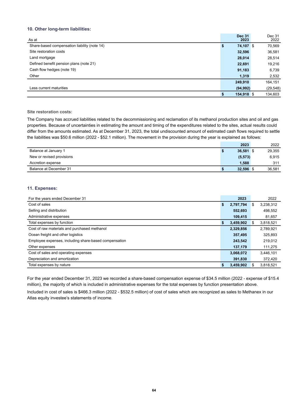 10. Other long-term liabilities: Share-based compensation liability (note 14) $ 74,107 $ 70,569 Site restoration costs 32,596 36,581 Land mortgage 28,014 28,514 Defined benefit pension plans (note 21) 22,691 19,216 Cash flow hedges (note 19) 91,183 6,739 Other 1,319 2,532 249,910 164,151 Less current maturities (94,992) (29,548) $ 154,918 $ 134,603 As at Dec 31 2023 Dec 31 2022 Site restoration costs: The Company has accrued liabilities related to the decommissioning and reclamation of its methanol production sites and oil and gas properties. Because of uncertainties in estimating the amount and timing of the expenditures related to the sites, actual results could differ from the amounts estimated. As at December 31, 2023, the total undiscounted amount of estimated cash flows required to settle the liabilities was $50.6 million (2022 - $52.1 million). The movement in the provision during the year is explained as follows: Balance at January 1 $ 36,581 $ 29,355 New or revised provisions (5,573) 6,915 Accretion expense 1,588 311 Balance at December 31 $ 32,596 $ 36,581 2023 2022 11. Expenses: Cost of sales $ 2,797,794 $ 3,238,312 Selling and distribution 552,693 498,552 Administrative expenses 109,415 81,657 Total expenses by function $ 3,459,902 $ 3,818,521 Cost of raw materials and purchased methanol 2,329,856 2,789,921 Ocean freight and other logistics 357,495 325,893 Employee expenses, including share-based compensation 243,542 219,012 Other expenses 137,179 111,275 Cost of sales and operating expenses 3,068,072 3,446,101 Depreciation and amortization 391,830 372,420 Total expenses by nature $ 3,459,902 $ 3,818,521 For the years ended December 31 2023 2022 For the year ended December 31, 2023 we recorded a share-based compensation expense of $34.5 million (2022 - expense of $15.4 million), the majority of which is included in administrative expenses for the total expenses by function presentation above. Included in cost of sales is $466.3 million (2022 - $532.5 million) of cost of sales which are recognized as sales to Methanex in our Atlas equity investee’s statements of income. 64