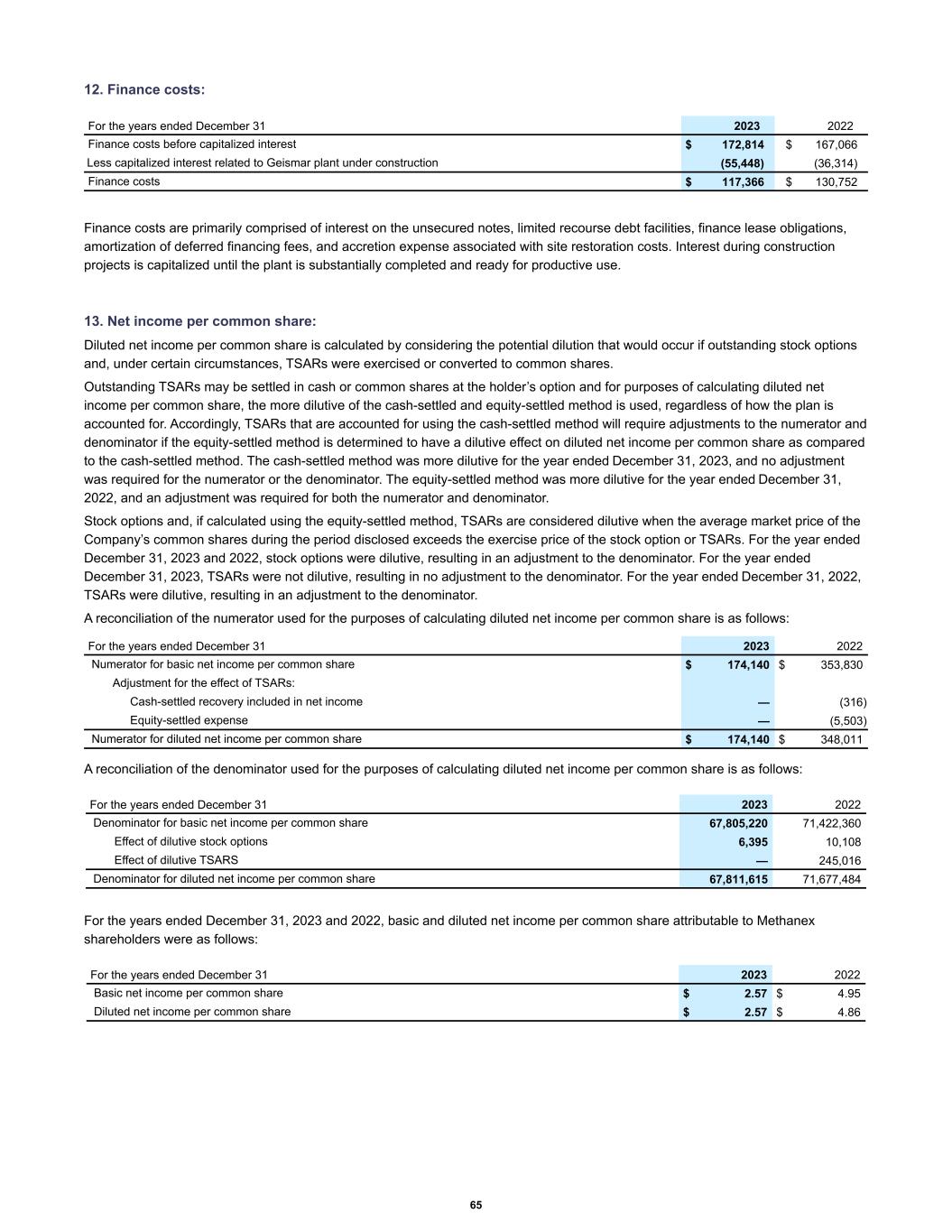 12. Finance costs: For the years ended December 31 2023 2022 Finance costs before capitalized interest $ 172,814 $ 167,066 Less capitalized interest related to Geismar plant under construction (55,448) (36,314) Finance costs $ 117,366 $ 130,752 Finance costs are primarily comprised of interest on the unsecured notes, limited recourse debt facilities, finance lease obligations, amortization of deferred financing fees, and accretion expense associated with site restoration costs. Interest during construction projects is capitalized until the plant is substantially completed and ready for productive use. 13. Net income per common share: Diluted net income per common share is calculated by considering the potential dilution that would occur if outstanding stock options and, under certain circumstances, TSARs were exercised or converted to common shares. Outstanding TSARs may be settled in cash or common shares at the holder’s option and for purposes of calculating diluted net income per common share, the more dilutive of the cash-settled and equity-settled method is used, regardless of how the plan is accounted for. Accordingly, TSARs that are accounted for using the cash-settled method will require adjustments to the numerator and denominator if the equity-settled method is determined to have a dilutive effect on diluted net income per common share as compared to the cash-settled method. The cash-settled method was more dilutive for the year ended December 31, 2023, and no adjustment was required for the numerator or the denominator. The equity-settled method was more dilutive for the year ended December 31, 2022, and an adjustment was required for both the numerator and denominator. Stock options and, if calculated using the equity-settled method, TSARs are considered dilutive when the average market price of the Company’s common shares during the period disclosed exceeds the exercise price of the stock option or TSARs. For the year ended December 31, 2023 and 2022, stock options were dilutive, resulting in an adjustment to the denominator. For the year ended December 31, 2023, TSARs were not dilutive, resulting in no adjustment to the denominator. For the year ended December 31, 2022, TSARs were dilutive, resulting in an adjustment to the denominator. A reconciliation of the numerator used for the purposes of calculating diluted net income per common share is as follows: For the years ended December 31 2023 2022 Numerator for basic net income per common share $ 174,140 $ 353,830 Adjustment for the effect of TSARs: Cash-settled recovery included in net income — (316) Equity-settled expense — (5,503) Numerator for diluted net income per common share $ 174,140 $ 348,011 A reconciliation of the denominator used for the purposes of calculating diluted net income per common share is as follows: Denominator for basic net income per common share 67,805,220 71,422,360 Effect of dilutive stock options 6,395 10,108 Effect of dilutive TSARS — 245,016 Denominator for diluted net income per common share 67,811,615 71,677,484 For the years ended December 31 2023 2022 For the years ended December 31, 2023 and 2022, basic and diluted net income per common share attributable to Methanex shareholders were as follows: Basic net income per common share $ 2.57 $ 4.95 Diluted net income per common share $ 2.57 $ 4.86 For the years ended December 31 2023 2022 65