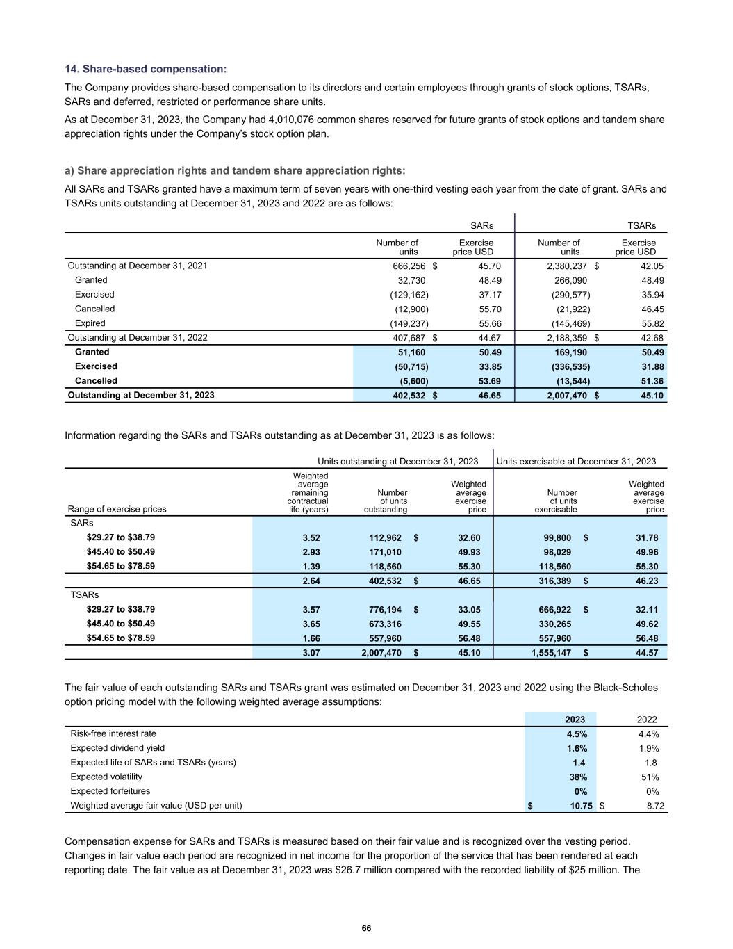 14. Share-based compensation: The Company provides share-based compensation to its directors and certain employees through grants of stock options, TSARs, SARs and deferred, restricted or performance share units. As at December 31, 2023, the Company had 4,010,076 common shares reserved for future grants of stock options and tandem share appreciation rights under the Company’s stock option plan. a) Share appreciation rights and tandem share appreciation rights: All SARs and TSARs granted have a maximum term of seven years with one-third vesting each year from the date of grant. SARs and TSARs units outstanding at December 31, 2023 and 2022 are as follows: Number of units Exercise price USD Number of units Exercise price USD Outstanding at December 31, 2021 666,256 $ 45.70 2,380,237 $ 42.05 Granted 32,730 48.49 266,090 48.49 Exercised (129,162) 37.17 (290,577) 35.94 Cancelled (12,900) 55.70 (21,922) 46.45 Expired (149,237) 55.66 (145,469) 55.82 Outstanding at December 31, 2022 407,687 $ 44.67 2,188,359 $ 42.68 Granted 51,160 50.49 169,190 50.49 Exercised (50,715) 33.85 (336,535) 31.88 Cancelled (5,600) 53.69 (13,544) 51.36 Outstanding at December 31, 2023 402,532 $ 46.65 2,007,470 $ 45.10 SARs TSARs Information regarding the SARs and TSARs outstanding as at December 31, 2023 is as follows: Range of exercise prices Weighted average remaining contractual life (years) Number of units outstanding Weighted average exercise price Number of units exercisable Weighted average exercise price SARs $29.27 to $38.79 3.52 112,962 $ 32.60 99,800 $ 31.78 $45.40 to $50.49 2.93 171,010 49.93 98,029 49.96 $54.65 to $78.59 1.39 118,560 55.30 118,560 55.30 2.64 402,532 $ 46.65 316,389 $ 46.23 TSARs $29.27 to $38.79 3.57 776,194 $ 33.05 666,922 $ 32.11 $45.40 to $50.49 3.65 673,316 49.55 330,265 49.62 $54.65 to $78.59 1.66 557,960 56.48 557,960 56.48 3.07 2,007,470 $ 45.10 1,555,147 $ 44.57 Units outstanding at December 31, 2023 Units exercisable at December 31, 2023 The fair value of each outstanding SARs and TSARs grant was estimated on December 31, 2023 and 2022 using the Black-Scholes option pricing model with the following weighted average assumptions: Risk-free interest rate 4.5 % 4.4 % Expected dividend yield 1.6 % 1.9 % Expected life of SARs and TSARs (years) 1.4 1.8 Expected volatility 38 % 51 % Expected forfeitures 0 % 0 % Weighted average fair value (USD per unit) $ 10.75 $ 8.72 2023 2022 Compensation expense for SARs and TSARs is measured based on their fair value and is recognized over the vesting period. Changes in fair value each period are recognized in net income for the proportion of the service that has been rendered at each reporting date. The fair value as at December 31, 2023 was $26.7 million compared with the recorded liability of $25 million. The 66