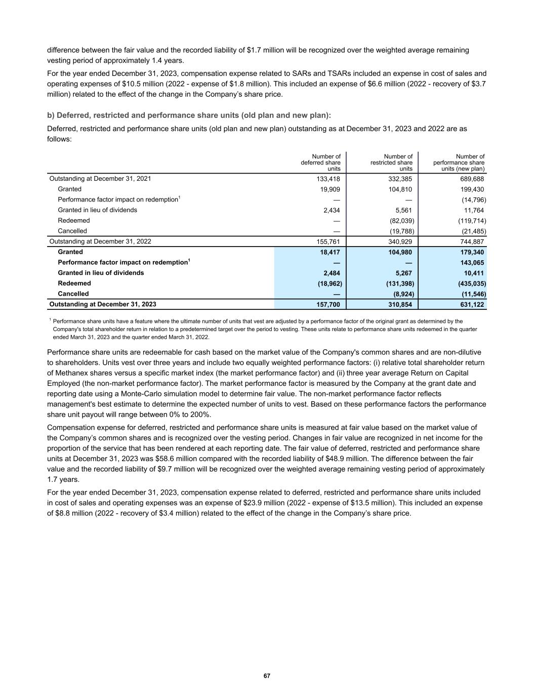 difference between the fair value and the recorded liability of $1.7 million will be recognized over the weighted average remaining vesting period of approximately 1.4 years. For the year ended December 31, 2023, compensation expense related to SARs and TSARs included an expense in cost of sales and operating expenses of $10.5 million (2022 - expense of $1.8 million). This included an expense of $6.6 million (2022 - recovery of $3.7 million) related to the effect of the change in the Company’s share price. b) Deferred, restricted and performance share units (old plan and new plan): Deferred, restricted and performance share units (old plan and new plan) outstanding as at December 31, 2023 and 2022 are as follows: Outstanding at December 31, 2021 133,418 332,385 689,688 Granted 19,909 104,810 199,430 Performance factor impact on redemption1 — — (14,796) Granted in lieu of dividends 2,434 5,561 11,764 Redeemed — (82,039) (119,714) Cancelled — (19,788) (21,485) Outstanding at December 31, 2022 155,761 340,929 744,887 Granted 18,417 104,980 179,340 Performance factor impact on redemption1 — — 143,065 Granted in lieu of dividends 2,484 5,267 10,411 Redeemed (18,962) (131,398) (435,035) Cancelled — (8,924) (11,546) Outstanding at December 31, 2023 157,700 310,854 631,122 Number of deferred share units Number of restricted share units Number of performance share units (new plan) 1 Performance share units have a feature where the ultimate number of units that vest are adjusted by a performance factor of the original grant as determined by the Company's total shareholder return in relation to a predetermined target over the period to vesting. These units relate to performance share units redeemed in the quarter ended March 31, 2023 and the quarter ended March 31, 2022. Performance share units are redeemable for cash based on the market value of the Company's common shares and are non-dilutive to shareholders. Units vest over three years and include two equally weighted performance factors: (i) relative total shareholder return of Methanex shares versus a specific market index (the market performance factor) and (ii) three year average Return on Capital Employed (the non-market performance factor). The market performance factor is measured by the Company at the grant date and reporting date using a Monte-Carlo simulation model to determine fair value. The non-market performance factor reflects management's best estimate to determine the expected number of units to vest. Based on these performance factors the performance share unit payout will range between 0% to 200%. Compensation expense for deferred, restricted and performance share units is measured at fair value based on the market value of the Company’s common shares and is recognized over the vesting period. Changes in fair value are recognized in net income for the proportion of the service that has been rendered at each reporting date. The fair value of deferred, restricted and performance share units at December 31, 2023 was $58.6 million compared with the recorded liability of $48.9 million. The difference between the fair value and the recorded liability of $9.7 million will be recognized over the weighted average remaining vesting period of approximately 1.7 years. For the year ended December 31, 2023, compensation expense related to deferred, restricted and performance share units included in cost of sales and operating expenses was an expense of $23.9 million (2022 - expense of $13.5 million). This included an expense of $8.8 million (2022 - recovery of $3.4 million) related to the effect of the change in the Company’s share price. 67