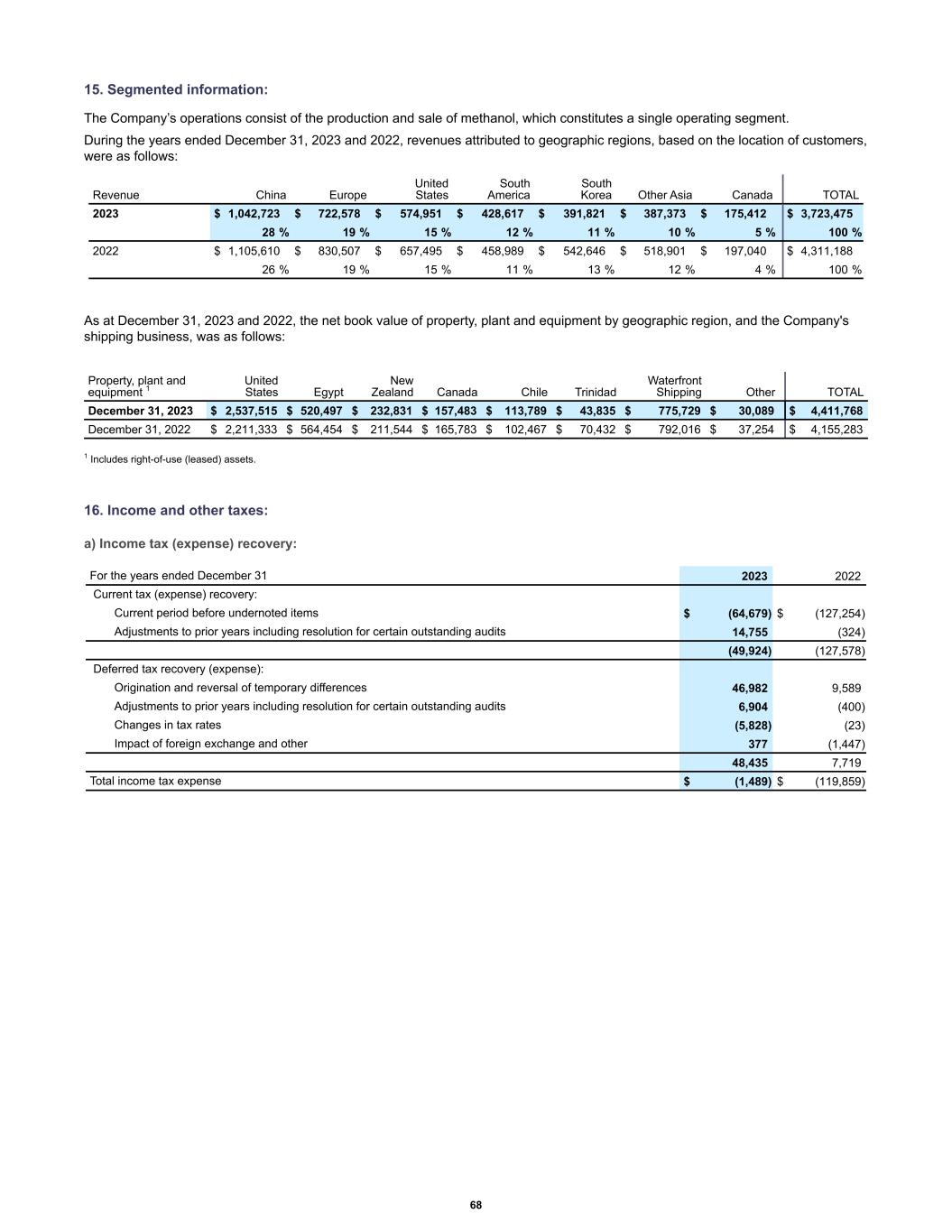 15. Segmented information: The Company’s operations consist of the production and sale of methanol, which constitutes a single operating segment. During the years ended December 31, 2023 and 2022, revenues attributed to geographic regions, based on the location of customers, were as follows: 2023 $ 1,042,723 $ 722,578 $ 574,951 $ 428,617 $ 391,821 $ 387,373 $ 175,412 $ 3,723,475 28 % 19 % 15 % 12 % 11 % 10 % 5 % 100 % 2022 $ 1,105,610 $ 830,507 $ 657,495 $ 458,989 $ 542,646 $ 518,901 $ 197,040 $ 4,311,188 26 % 19 % 15 % 11 % 13 % 12 % 4 % 100 % Revenue China Europe United States South America South Korea Other Asia Canada TOTAL As at December 31, 2023 and 2022, the net book value of property, plant and equipment by geographic region, and the Company's shipping business, was as follows: December 31, 2023 $ 2,537,515 $ 520,497 $ 232,831 $ 157,483 $ 113,789 $ 43,835 $ 775,729 $ 30,089 $ 4,411,768 December 31, 2022 $ 2,211,333 $ 564,454 $ 211,544 $ 165,783 $ 102,467 $ 70,432 $ 792,016 $ 37,254 $ 4,155,283 Property, plant and equipment 1 United States Egypt New Zealand Canada Chile Trinidad Waterfront Shipping Other TOTAL 1 Includes right-of-use (leased) assets. 16. Income and other taxes: a) Income tax (expense) recovery: Current tax (expense) recovery: Current period before undernoted items $ (64,679) $ (127,254) Adjustments to prior years including resolution for certain outstanding audits 14,755 (324) (49,924) (127,578) Deferred tax recovery (expense): Origination and reversal of temporary differences 46,982 9,589 Adjustments to prior years including resolution for certain outstanding audits 6,904 (400) Changes in tax rates (5,828) (23) Impact of foreign exchange and other 377 (1,447) 48,435 7,719 Total income tax expense $ (1,489) $ (119,859) For the years ended December 31 2023 2022 68