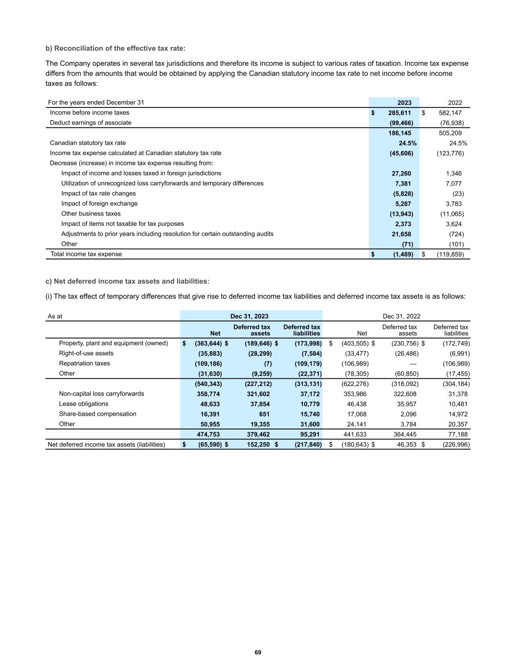 b) Reconciliation of the effective tax rate: The Company operates in several tax jurisdictions and therefore its income is subject to various rates of taxation. Income tax expense differs from the amounts that would be obtained by applying the Canadian statutory income tax rate to net income before income taxes as follows: Income before income taxes $ 285,611 $ 582,147 Deduct earnings of associate (99,466) (76,938) 186,145 505,209 Canadian statutory tax rate 24.5% 24.5% Income tax expense calculated at Canadian statutory tax rate (45,606) (123,776) Decrease (increase) in income tax expense resulting from: Impact of income and losses taxed in foreign jurisdictions 27,260 1,346 Utilization of unrecognized loss carryforwards and temporary differences 7,381 7,077 Impact of tax rate changes (5,828) (23) Impact of foreign exchange 5,287 3,783 Other business taxes (13,943) (11,065) Impact of items not taxable for tax purposes 2,373 3,624 Adjustments to prior years including resolution for certain outstanding audits 21,658 (724) Other (71) (101) Total income tax expense $ (1,489) $ (119,859) For the years ended December 31 2023 2022 c) Net deferred income tax assets and liabilities: (i) The tax effect of temporary differences that give rise to deferred income tax liabilities and deferred income tax assets is as follows: Net Deferred tax assets Deferred tax liabilities Net Deferred tax assets Deferred tax liabilities Property, plant and equipment (owned) $ (363,644) $ (189,646) $ (173,998) $ (403,505) $ (230,756) $ (172,749) Right-of-use assets (35,883) (28,299) (7,584) (33,477) (26,486) (6,991) Repatriation taxes (109,186) (7) (109,179) (106,989) — (106,989) Other (31,630) (9,259) (22,371) (78,305) (60,850) (17,455) (540,343) (227,212) (313,131) (622,276) (318,092) (304,184) Non-capital loss carryforwards 358,774 321,602 37,172 353,986 322,608 31,378 Lease obligations 48,633 37,854 10,779 46,438 35,957 10,481 Share-based compensation 16,391 651 15,740 17,068 2,096 14,972 Other 50,955 19,355 31,600 24,141 3,784 20,357 474,753 379,462 95,291 441,633 364,445 77,188 Net deferred income tax assets (liabilities) $ (65,590) $ 152,250 $ (217,840) $ (180,643) $ 46,353 $ (226,996) As at Dec 31, 2023 Dec 31, 2022 69