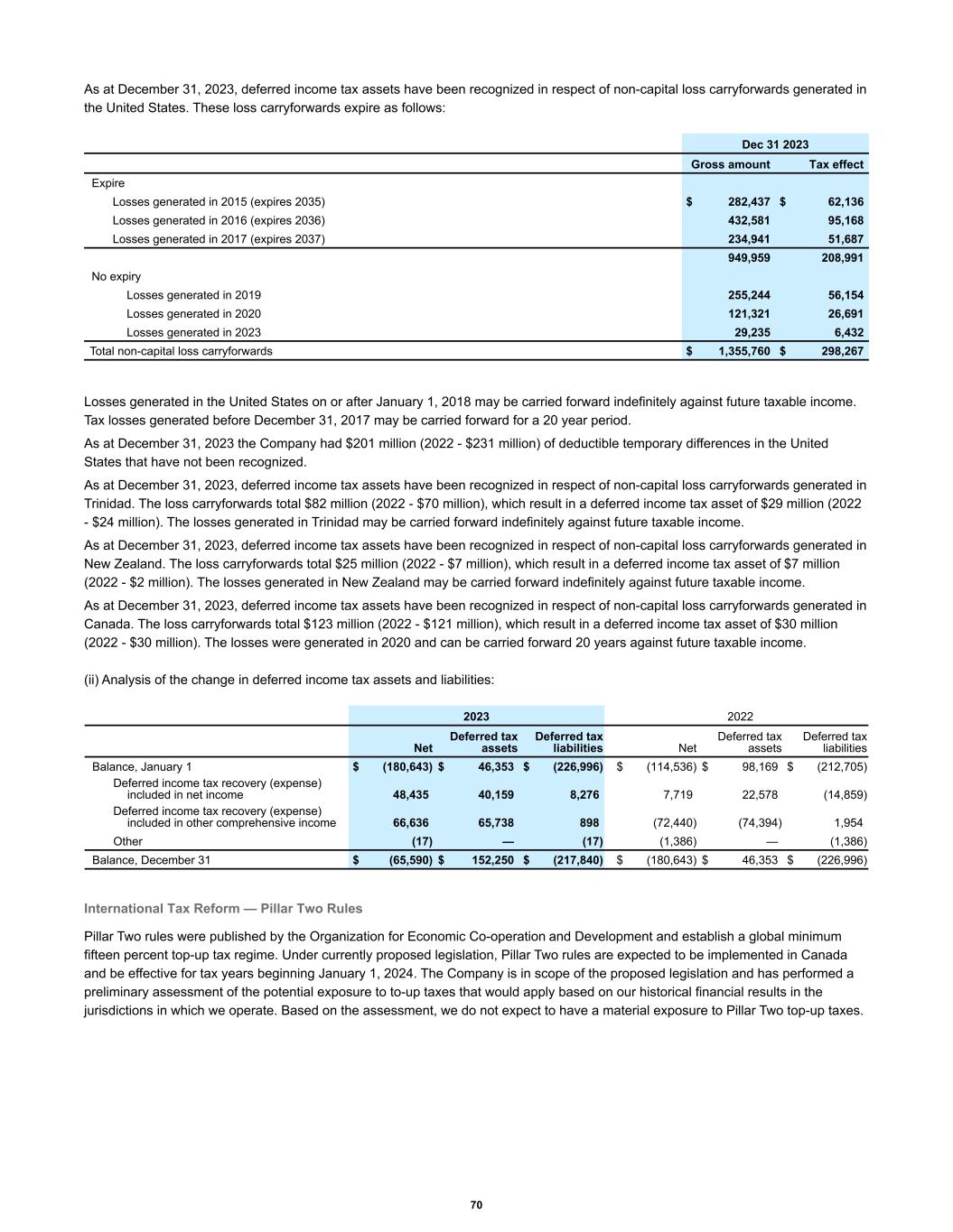 As at December 31, 2023, deferred income tax assets have been recognized in respect of non-capital loss carryforwards generated in the United States. These loss carryforwards expire as follows: Dec 31 2023 Gross amount Tax effect Expire Losses generated in 2015 (expires 2035) $ 282,437 $ 62,136 Losses generated in 2016 (expires 2036) 432,581 95,168 Losses generated in 2017 (expires 2037) 234,941 51,687 949,959 208,991 No expiry Losses generated in 2019 255,244 56,154 Losses generated in 2020 121,321 26,691 Losses generated in 2023 29,235 6,432 Total non-capital loss carryforwards $ 1,355,760 $ 298,267 Losses generated in the United States on or after January 1, 2018 may be carried forward indefinitely against future taxable income. Tax losses generated before December 31, 2017 may be carried forward for a 20 year period. As at December 31, 2023 the Company had $201 million (2022 - $231 million) of deductible temporary differences in the United States that have not been recognized. As at December 31, 2023, deferred income tax assets have been recognized in respect of non-capital loss carryforwards generated in Trinidad. The loss carryforwards total $82 million (2022 - $70 million), which result in a deferred income tax asset of $29 million (2022 - $24 million). The losses generated in Trinidad may be carried forward indefinitely against future taxable income. As at December 31, 2023, deferred income tax assets have been recognized in respect of non-capital loss carryforwards generated in New Zealand. The loss carryforwards total $25 million (2022 - $7 million), which result in a deferred income tax asset of $7 million (2022 - $2 million). The losses generated in New Zealand may be carried forward indefinitely against future taxable income. As at December 31, 2023, deferred income tax assets have been recognized in respect of non-capital loss carryforwards generated in Canada. The loss carryforwards total $123 million (2022 - $121 million), which result in a deferred income tax asset of $30 million (2022 - $30 million). The losses were generated in 2020 and can be carried forward 20 years against future taxable income. (ii) Analysis of the change in deferred income tax assets and liabilities: Net Deferred tax assets Deferred tax liabilities Net Deferred tax assets Deferred tax liabilities Balance, January 1 $ (180,643) $ 46,353 $ (226,996) $ (114,536) $ 98,169 $ (212,705) Deferred income tax recovery (expense) included in net income 48,435 40,159 8,276 7,719 22,578 (14,859) Deferred income tax recovery (expense) included in other comprehensive income 66,636 65,738 898 (72,440) (74,394) 1,954 Other (17) — (17) (1,386) — (1,386) Balance, December 31 $ (65,590) $ 152,250 $ (217,840) $ (180,643) $ 46,353 $ (226,996) 2023 2022 International Tax Reform — Pillar Two Rules Pillar Two rules were published by the Organization for Economic Co-operation and Development and establish a global minimum fifteen percent top-up tax regime. Under currently proposed legislation, Pillar Two rules are expected to be implemented in Canada and be effective for tax years beginning January 1, 2024. The Company is in scope of the proposed legislation and has performed a preliminary assessment of the potential exposure to to-up taxes that would apply based on our historical financial results in the jurisdictions in which we operate. Based on the assessment, we do not expect to have a material exposure to Pillar Two top-up taxes. 70