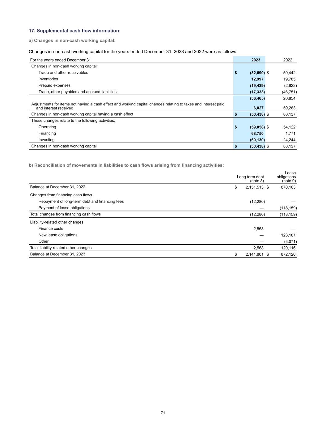 17. Supplemental cash flow information: a) Changes in non-cash working capital: Changes in non-cash working capital for the years ended December 31, 2023 and 2022 were as follows: Changes in non-cash working capital: Trade and other receivables $ (32,690) $ 50,442 Inventories 12,997 19,785 Prepaid expenses (19,439) (2,622) Trade, other payables and accrued liabilities (17,333) (46,751) (56,465) 20,854 Adjustments for items not having a cash effect and working capital changes relating to taxes and interest paid and interest received 6,027 59,283 Changes in non-cash working capital having a cash effect $ (50,438) $ 80,137 These changes relate to the following activities: Operating $ (59,058) $ 54,122 Financing 68,750 1,771 Investing (60,130) 24,244 Changes in non-cash working capital $ (50,438) $ 80,137 For the years ended December 31 2023 2022 b) Reconciliation of movements in liabilities to cash flows arising from financing activities: Long term debt (note 8) Lease obligations (note 9) Balance at December 31, 2022 $ 2,151,513 $ 870,163 Changes from financing cash flows Repayment of long-term debt and financing fees (12,280) — Payment of lease obligations — (118,159) Total changes from financing cash flows (12,280) (118,159) Liability-related other changes Finance costs 2,568 — New lease obligations — 123,187 Other — (3,071) Total liability-related other changes 2,568 120,116 Balance at December 31, 2023 $ 2,141,801 $ 872,120 71