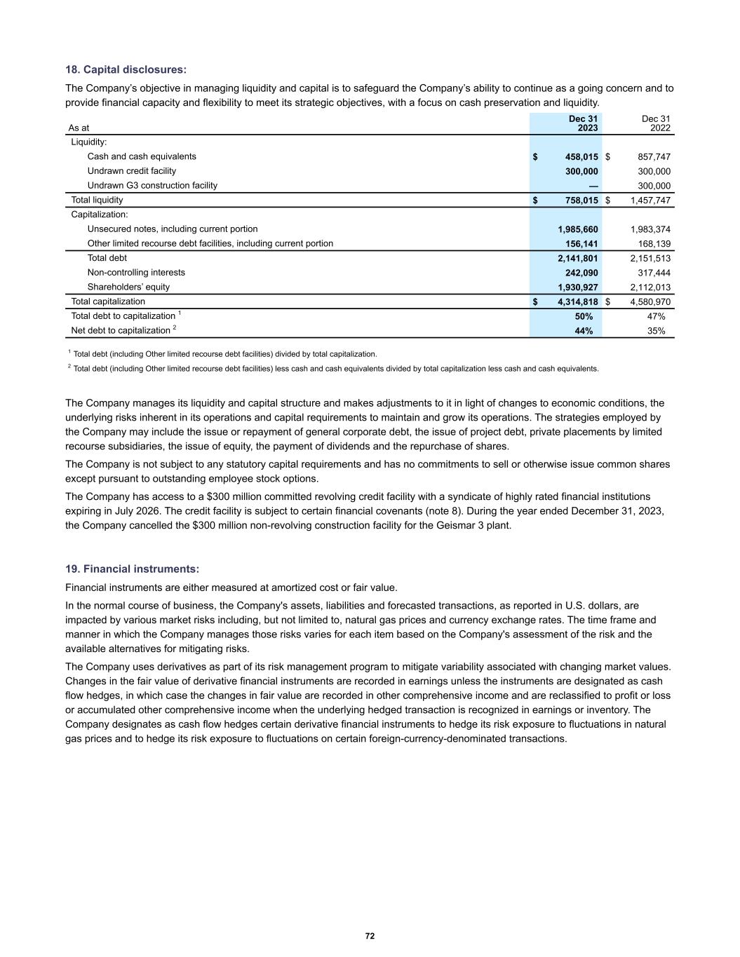 18. Capital disclosures: The Company’s objective in managing liquidity and capital is to safeguard the Company’s ability to continue as a going concern and to provide financial capacity and flexibility to meet its strategic objectives, with a focus on cash preservation and liquidity. Liquidity: Cash and cash equivalents $ 458,015 $ 857,747 Undrawn credit facility 300,000 300,000 Undrawn G3 construction facility — 300,000 Total liquidity $ 758,015 $ 1,457,747 Capitalization: Unsecured notes, including current portion 1,985,660 1,983,374 Other limited recourse debt facilities, including current portion 156,141 168,139 Total debt 2,141,801 2,151,513 Non-controlling interests 242,090 317,444 Shareholders’ equity 1,930,927 2,112,013 Total capitalization $ 4,314,818 $ 4,580,970 Total debt to capitalization 1 50 % 47 % Net debt to capitalization 2 44 % 35 % As at Dec 31 2023 Dec 31 2022 1 Total debt (including Other limited recourse debt facilities) divided by total capitalization. 2 Total debt (including Other limited recourse debt facilities) less cash and cash equivalents divided by total capitalization less cash and cash equivalents. The Company manages its liquidity and capital structure and makes adjustments to it in light of changes to economic conditions, the underlying risks inherent in its operations and capital requirements to maintain and grow its operations. The strategies employed by the Company may include the issue or repayment of general corporate debt, the issue of project debt, private placements by limited recourse subsidiaries, the issue of equity, the payment of dividends and the repurchase of shares. The Company is not subject to any statutory capital requirements and has no commitments to sell or otherwise issue common shares except pursuant to outstanding employee stock options. The Company has access to a $300 million committed revolving credit facility with a syndicate of highly rated financial institutions expiring in July 2026. The credit facility is subject to certain financial covenants (note 8). During the year ended December 31, 2023, the Company cancelled the $300 million non-revolving construction facility for the Geismar 3 plant. 19. Financial instruments: Financial instruments are either measured at amortized cost or fair value. In the normal course of business, the Company's assets, liabilities and forecasted transactions, as reported in U.S. dollars, are impacted by various market risks including, but not limited to, natural gas prices and currency exchange rates. The time frame and manner in which the Company manages those risks varies for each item based on the Company's assessment of the risk and the available alternatives for mitigating risks. The Company uses derivatives as part of its risk management program to mitigate variability associated with changing market values. Changes in the fair value of derivative financial instruments are recorded in earnings unless the instruments are designated as cash flow hedges, in which case the changes in fair value are recorded in other comprehensive income and are reclassified to profit or loss or accumulated other comprehensive income when the underlying hedged transaction is recognized in earnings or inventory. The Company designates as cash flow hedges certain derivative financial instruments to hedge its risk exposure to fluctuations in natural gas prices and to hedge its risk exposure to fluctuations on certain foreign-currency-denominated transactions. 72