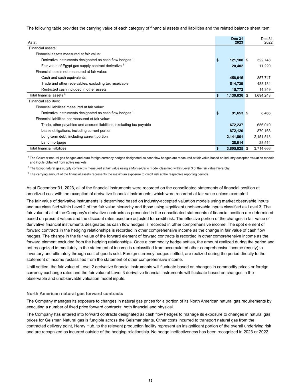 The following table provides the carrying value of each category of financial assets and liabilities and the related balance sheet item: Financial assets: Financial assets measured at fair value: Derivative instruments designated as cash flow hedges 1 $ 121,108 $ 322,748 Fair value of Egypt gas supply contract derivative 2 20,402 11,220 Financial assets not measured at fair value: Cash and cash equivalents 458,015 857,747 Trade and other receivables, excluding tax receivable 514,739 488,184 Restricted cash included in other assets 15,772 14,349 Total financial assets 3 $ 1,130,036 $ 1,694,248 Financial liabilities: Financial liabilities measured at fair value: Derivative instruments designated as cash flow hedges 1 $ 91,653 $ 8,466 Financial liabilities not measured at fair value: Trade, other payables and accrued liabilities, excluding tax payable 672,237 656,010 Lease obligations, including current portion 872,120 870,163 Long-term debt, including current portion 2,141,801 2,151,513 Land mortgage 28,014 28,514 Total financial liabilities $ 3,805,825 $ 3,714,666 As at Dec 31 2023 Dec 31 2022 1 The Geismar natural gas hedges and euro foreign currency hedges designated as cash flow hedges are measured at fair value based on industry accepted valuation models and inputs obtained from active markets. 2 The Egypt natural gas supply contract is measured at fair value using a Monte-Carlo model classified within Level 3 of the fair value hierarchy. 3 The carrying amount of the financial assets represents the maximum exposure to credit risk at the respective reporting periods. As at December 31, 2023, all of the financial instruments were recorded on the consolidated statements of financial position at amortized cost with the exception of derivative financial instruments, which were recorded at fair value unless exempted. The fair value of derivative instruments is determined based on industry-accepted valuation models using market observable inputs and are classified within Level 2 of the fair value hierarchy and those using significant unobservable inputs classified as Level 3. The fair value of all of the Company's derivative contracts as presented in the consolidated statements of financial position are determined based on present values and the discount rates used are adjusted for credit risk. The effective portion of the changes in fair value of derivative financial instruments designated as cash flow hedges is recorded in other comprehensive income. The spot element of forward contracts in the hedging relationships is recorded in other comprehensive income as the change in fair value of cash flow hedges. The change in the fair value of the forward element of forward contracts is recorded in other comprehensive income as the forward element excluded from the hedging relationships. Once a commodity hedge settles, the amount realized during the period and not recognized immediately in the statement of income is reclassified from accumulated other comprehensive income (equity) to inventory and ultimately through cost of goods sold. Foreign currency hedges settled, are realized during the period directly to the statement of income reclassified from the statement of other comprehensive income. Until settled, the fair value of Level 2 derivative financial instruments will fluctuate based on changes in commodity prices or foreign currency exchange rates and the fair value of Level 3 derivative financial instruments will fluctuate based on changes in the observable and unobservable valuation model inputs. North American natural gas forward contracts The Company manages its exposure to changes in natural gas prices for a portion of its North American natural gas requirements by executing a number of fixed price forward contracts: both financial and physical. The Company has entered into forward contracts designated as cash flow hedges to manage its exposure to changes in natural gas prices for Geismar. Natural gas is fungible across the Geismar plants. Other costs incurred to transport natural gas from the contracted delivery point, Henry Hub, to the relevant production facility represent an insignificant portion of the overall underlying risk and are recognized as incurred outside of the hedging relationship. No hedge ineffectiveness has been recognized in 2023 or 2022. 73