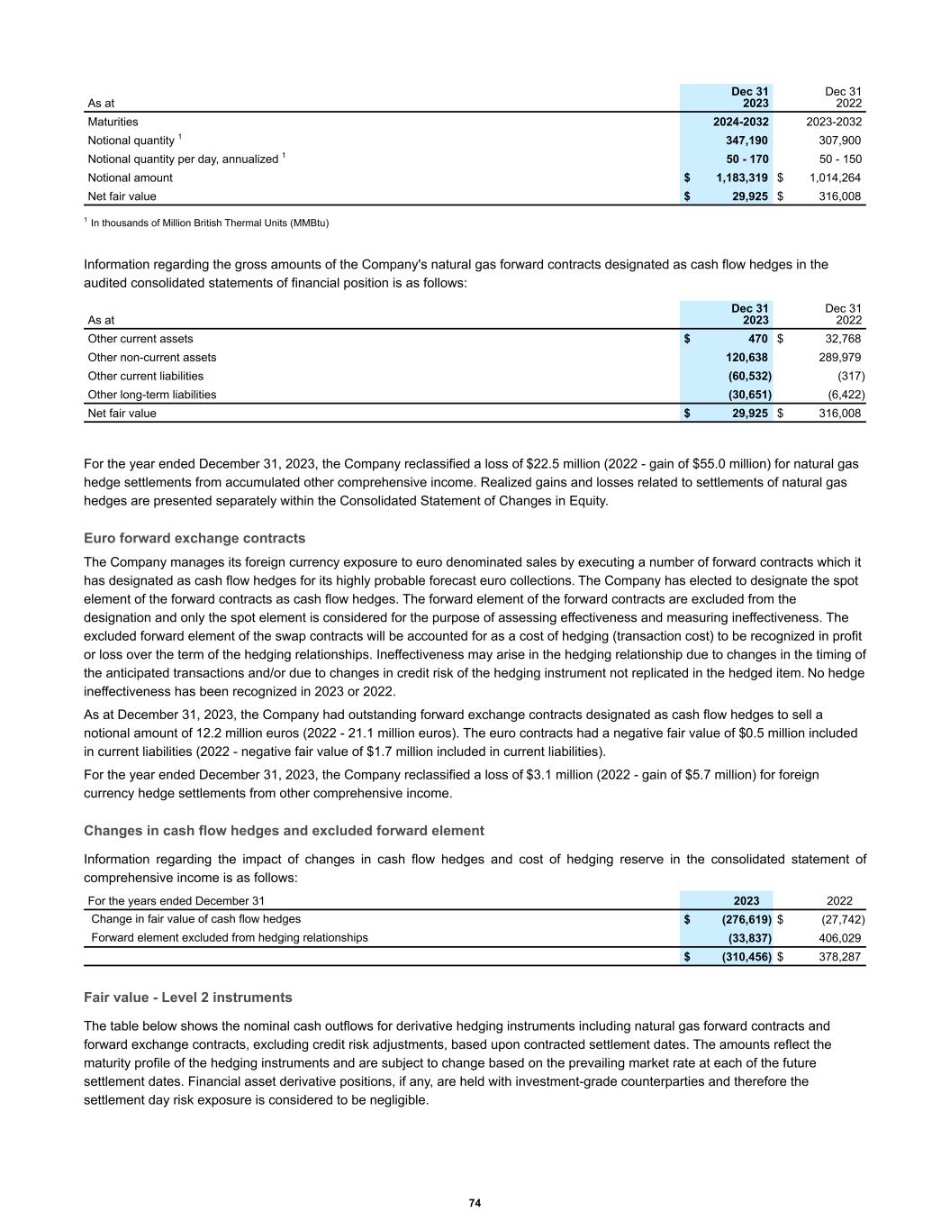 As at Dec 31 2023 Dec 31 2022 Maturities 2024-2032 2023-2032 Notional quantity 1 347,190 307,900 Notional quantity per day, annualized 1 50 - 170 50 - 150 Notional amount $ 1,183,319 $ 1,014,264 Net fair value $ 29,925 $ 316,008 1 In thousands of Million British Thermal Units (MMBtu) Information regarding the gross amounts of the Company's natural gas forward contracts designated as cash flow hedges in the audited consolidated statements of financial position is as follows: As at Dec 31 2023 Dec 31 2022 Other current assets $ 470 $ 32,768 Other non-current assets 120,638 289,979 Other current liabilities (60,532) (317) Other long-term liabilities (30,651) (6,422) Net fair value $ 29,925 $ 316,008 For the year ended December 31, 2023, the Company reclassified a loss of $22.5 million (2022 - gain of $55.0 million) for natural gas hedge settlements from accumulated other comprehensive income. Realized gains and losses related to settlements of natural gas hedges are presented separately within the Consolidated Statement of Changes in Equity. Euro forward exchange contracts The Company manages its foreign currency exposure to euro denominated sales by executing a number of forward contracts which it has designated as cash flow hedges for its highly probable forecast euro collections. The Company has elected to designate the spot element of the forward contracts as cash flow hedges. The forward element of the forward contracts are excluded from the designation and only the spot element is considered for the purpose of assessing effectiveness and measuring ineffectiveness. The excluded forward element of the swap contracts will be accounted for as a cost of hedging (transaction cost) to be recognized in profit or loss over the term of the hedging relationships. Ineffectiveness may arise in the hedging relationship due to changes in the timing of the anticipated transactions and/or due to changes in credit risk of the hedging instrument not replicated in the hedged item. No hedge ineffectiveness has been recognized in 2023 or 2022. As at December 31, 2023, the Company had outstanding forward exchange contracts designated as cash flow hedges to sell a notional amount of 12.2 million euros (2022 - 21.1 million euros). The euro contracts had a negative fair value of $0.5 million included in current liabilities (2022 - negative fair value of $1.7 million included in current liabilities). For the year ended December 31, 2023, the Company reclassified a loss of $3.1 million (2022 - gain of $5.7 million) for foreign currency hedge settlements from other comprehensive income. Changes in cash flow hedges and excluded forward element Information regarding the impact of changes in cash flow hedges and cost of hedging reserve in the consolidated statement of comprehensive income is as follows: Change in fair value of cash flow hedges $ (276,619) $ (27,742) Forward element excluded from hedging relationships (33,837) 406,029 $ (310,456) $ 378,287 For the years ended December 31 2023 2022 Fair value - Level 2 instruments The table below shows the nominal cash outflows for derivative hedging instruments including natural gas forward contracts and forward exchange contracts, excluding credit risk adjustments, based upon contracted settlement dates. The amounts reflect the maturity profile of the hedging instruments and are subject to change based on the prevailing market rate at each of the future settlement dates. Financial asset derivative positions, if any, are held with investment-grade counterparties and therefore the settlement day risk exposure is considered to be negligible. 74