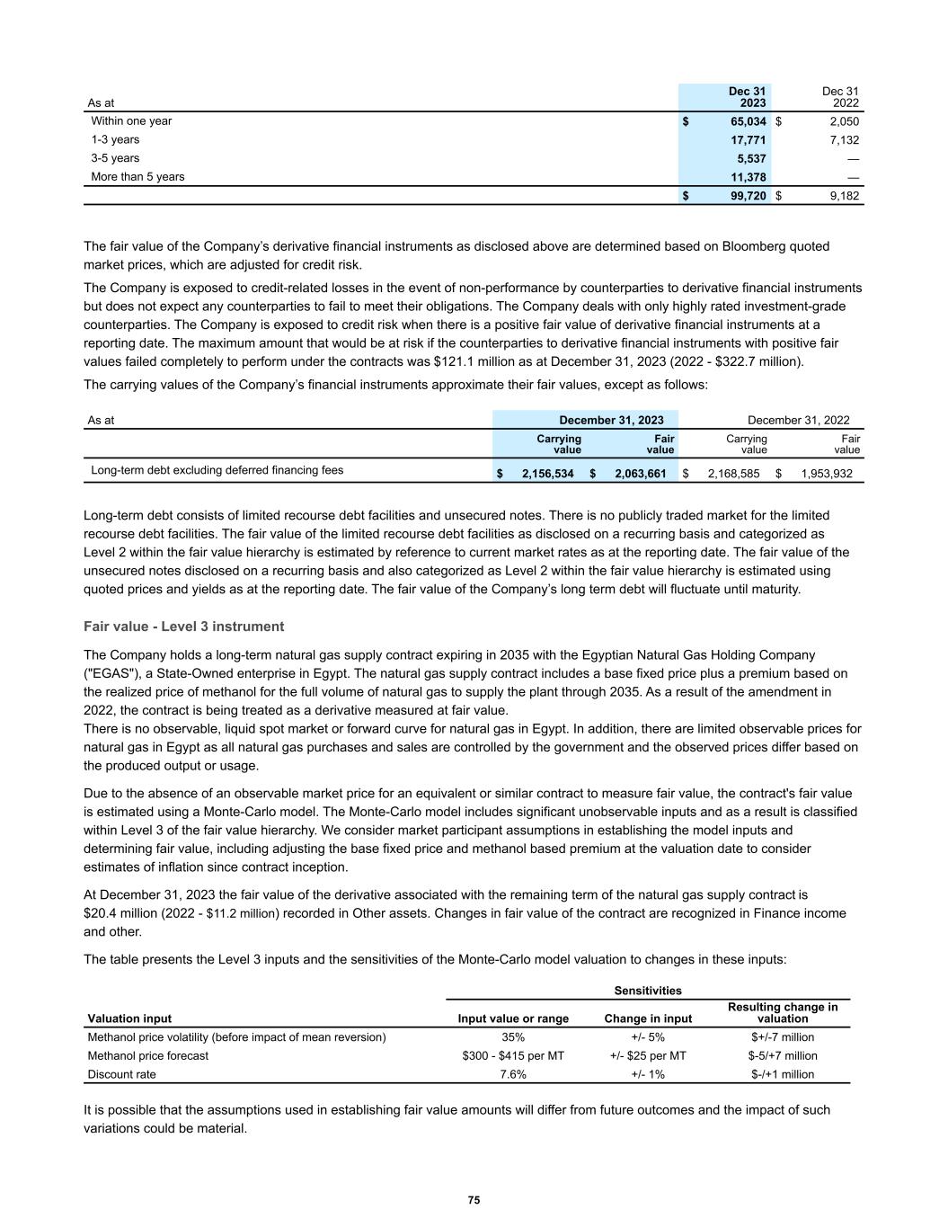 Within one year $ 65,034 $ 2,050 1-3 years 17,771 7,132 3-5 years 5,537 — More than 5 years 11,378 — $ 99,720 $ 9,182 As at Dec 31 2023 Dec 31 2022 The fair value of the Company’s derivative financial instruments as disclosed above are determined based on Bloomberg quoted market prices, which are adjusted for credit risk. The Company is exposed to credit-related losses in the event of non-performance by counterparties to derivative financial instruments but does not expect any counterparties to fail to meet their obligations. The Company deals with only highly rated investment-grade counterparties. The Company is exposed to credit risk when there is a positive fair value of derivative financial instruments at a reporting date. The maximum amount that would be at risk if the counterparties to derivative financial instruments with positive fair values failed completely to perform under the contracts was $121.1 million as at December 31, 2023 (2022 - $322.7 million). The carrying values of the Company’s financial instruments approximate their fair values, except as follows: Carrying value Fair value Carrying value Fair value Long-term debt excluding deferred financing fees $ 2,156,534 $ 2,063,661 $ 2,168,585 $ 1,953,932 As at December 31, 2023 December 31, 2022 Long-term debt consists of limited recourse debt facilities and unsecured notes. There is no publicly traded market for the limited recourse debt facilities. The fair value of the limited recourse debt facilities as disclosed on a recurring basis and categorized as Level 2 within the fair value hierarchy is estimated by reference to current market rates as at the reporting date. The fair value of the unsecured notes disclosed on a recurring basis and also categorized as Level 2 within the fair value hierarchy is estimated using quoted prices and yields as at the reporting date. The fair value of the Company’s long term debt will fluctuate until maturity. Fair value - Level 3 instrument The Company holds a long-term natural gas supply contract expiring in 2035 with the Egyptian Natural Gas Holding Company ("EGAS"), a State-Owned enterprise in Egypt. The natural gas supply contract includes a base fixed price plus a premium based on the realized price of methanol for the full volume of natural gas to supply the plant through 2035. As a result of the amendment in 2022, the contract is being treated as a derivative measured at fair value. There is no observable, liquid spot market or forward curve for natural gas in Egypt. In addition, there are limited observable prices for natural gas in Egypt as all natural gas purchases and sales are controlled by the government and the observed prices differ based on the produced output or usage. Due to the absence of an observable market price for an equivalent or similar contract to measure fair value, the contract's fair value is estimated using a Monte-Carlo model. The Monte-Carlo model includes significant unobservable inputs and as a result is classified within Level 3 of the fair value hierarchy. We consider market participant assumptions in establishing the model inputs and determining fair value, including adjusting the base fixed price and methanol based premium at the valuation date to consider estimates of inflation since contract inception. At December 31, 2023 the fair value of the derivative associated with the remaining term of the natural gas supply contract is $20.4 million (2022 - $11.2 million) recorded in Other assets. Changes in fair value of the contract are recognized in Finance income and other. The table presents the Level 3 inputs and the sensitivities of the Monte-Carlo model valuation to changes in these inputs: Sensitivities Valuation input Input value or range Change in input Resulting change in valuation Methanol price volatility (before impact of mean reversion) 35% +/- 5% $+/-7 million Methanol price forecast $300 - $415 per MT +/- $25 per MT $-5/+7 million Discount rate 7.6% +/- 1% $-/+1 million It is possible that the assumptions used in establishing fair value amounts will differ from future outcomes and the impact of such variations could be material. 75