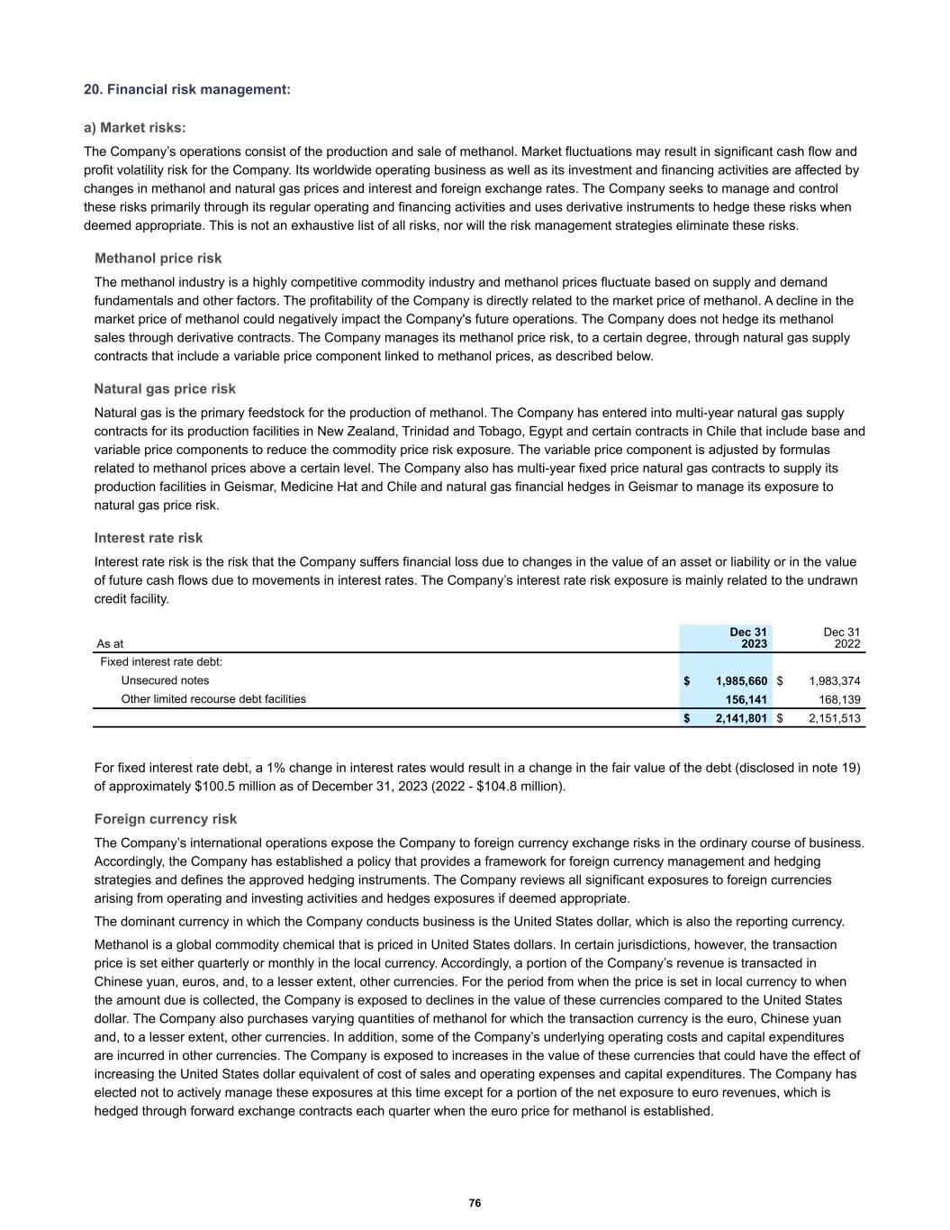 20. Financial risk management: a) Market risks: The Company’s operations consist of the production and sale of methanol. Market fluctuations may result in significant cash flow and profit volatility risk for the Company. Its worldwide operating business as well as its investment and financing activities are affected by changes in methanol and natural gas prices and interest and foreign exchange rates. The Company seeks to manage and control these risks primarily through its regular operating and financing activities and uses derivative instruments to hedge these risks when deemed appropriate. This is not an exhaustive list of all risks, nor will the risk management strategies eliminate these risks. Methanol price risk The methanol industry is a highly competitive commodity industry and methanol prices fluctuate based on supply and demand fundamentals and other factors. The profitability of the Company is directly related to the market price of methanol. A decline in the market price of methanol could negatively impact the Company's future operations. The Company does not hedge its methanol sales through derivative contracts. The Company manages its methanol price risk, to a certain degree, through natural gas supply contracts that include a variable price component linked to methanol prices, as described below. Natural gas price risk Natural gas is the primary feedstock for the production of methanol. The Company has entered into multi-year natural gas supply contracts for its production facilities in New Zealand, Trinidad and Tobago, Egypt and certain contracts in Chile that include base and variable price components to reduce the commodity price risk exposure. The variable price component is adjusted by formulas related to methanol prices above a certain level. The Company also has multi-year fixed price natural gas contracts to supply its production facilities in Geismar, Medicine Hat and Chile and natural gas financial hedges in Geismar to manage its exposure to natural gas price risk. Interest rate risk Interest rate risk is the risk that the Company suffers financial loss due to changes in the value of an asset or liability or in the value of future cash flows due to movements in interest rates. The Company’s interest rate risk exposure is mainly related to the undrawn credit facility. Fixed interest rate debt: Unsecured notes $ 1,985,660 $ 1,983,374 Other limited recourse debt facilities 156,141 168,139 $ 2,141,801 $ 2,151,513 As at Dec 31 2023 Dec 31 2022 For fixed interest rate debt, a 1% change in interest rates would result in a change in the fair value of the debt (disclosed in note 19) of approximately $100.5 million as of December 31, 2023 (2022 - $104.8 million). Foreign currency risk The Company’s international operations expose the Company to foreign currency exchange risks in the ordinary course of business. Accordingly, the Company has established a policy that provides a framework for foreign currency management and hedging strategies and defines the approved hedging instruments. The Company reviews all significant exposures to foreign currencies arising from operating and investing activities and hedges exposures if deemed appropriate. The dominant currency in which the Company conducts business is the United States dollar, which is also the reporting currency. Methanol is a global commodity chemical that is priced in United States dollars. In certain jurisdictions, however, the transaction price is set either quarterly or monthly in the local currency. Accordingly, a portion of the Company’s revenue is transacted in Chinese yuan, euros, and, to a lesser extent, other currencies. For the period from when the price is set in local currency to when the amount due is collected, the Company is exposed to declines in the value of these currencies compared to the United States dollar. The Company also purchases varying quantities of methanol for which the transaction currency is the euro, Chinese yuan and, to a lesser extent, other currencies. In addition, some of the Company’s underlying operating costs and capital expenditures are incurred in other currencies. The Company is exposed to increases in the value of these currencies that could have the effect of increasing the United States dollar equivalent of cost of sales and operating expenses and capital expenditures. The Company has elected not to actively manage these exposures at this time except for a portion of the net exposure to euro revenues, which is hedged through forward exchange contracts each quarter when the euro price for methanol is established. 76
