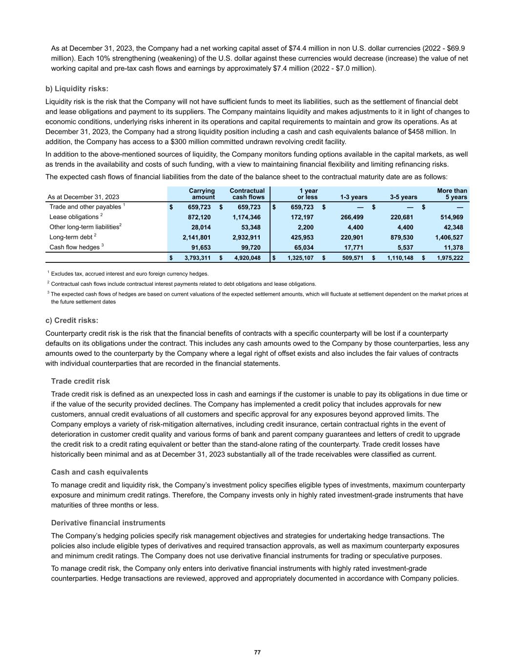 As at December 31, 2023, the Company had a net working capital asset of $74.4 million in non U.S. dollar currencies (2022 - $69.9 million). Each 10% strengthening (weakening) of the U.S. dollar against these currencies would decrease (increase) the value of net working capital and pre-tax cash flows and earnings by approximately $7.4 million (2022 - $7.0 million). b) Liquidity risks: Liquidity risk is the risk that the Company will not have sufficient funds to meet its liabilities, such as the settlement of financial debt and lease obligations and payment to its suppliers. The Company maintains liquidity and makes adjustments to it in light of changes to economic conditions, underlying risks inherent in its operations and capital requirements to maintain and grow its operations. As at December 31, 2023, the Company had a strong liquidity position including a cash and cash equivalents balance of $458 million. In addition, the Company has access to a $300 million committed undrawn revolving credit facility. In addition to the above-mentioned sources of liquidity, the Company monitors funding options available in the capital markets, as well as trends in the availability and costs of such funding, with a view to maintaining financial flexibility and limiting refinancing risks. The expected cash flows of financial liabilities from the date of the balance sheet to the contractual maturity date are as follows: Trade and other payables 1 $ 659,723 $ 659,723 $ 659,723 $ — $ — $ — Lease obligations 2 872,120 1,174,346 172,197 266,499 220,681 514,969 Other long-term liabilities2 28,014 53,348 2,200 4,400 4,400 42,348 Long-term debt 2 2,141,801 2,932,911 425,953 220,901 879,530 1,406,527 Cash flow hedges 3 91,653 99,720 65,034 17,771 5,537 11,378 $ 3,793,311 $ 4,920,048 $ 1,325,107 $ 509,571 $ 1,110,148 $ 1,975,222 As at December 31, 2023 Carrying amount Contractual cash flows 1 year or less 1-3 years 3-5 years More than 5 years 1 Excludes tax, accrued interest and euro foreign currency hedges. 2 Contractual cash flows include contractual interest payments related to debt obligations and lease obligations. 3 The expected cash flows of hedges are based on current valuations of the expected settlement amounts, which will fluctuate at settlement dependent on the market prices at the future settlement dates c) Credit risks: Counterparty credit risk is the risk that the financial benefits of contracts with a specific counterparty will be lost if a counterparty defaults on its obligations under the contract. This includes any cash amounts owed to the Company by those counterparties, less any amounts owed to the counterparty by the Company where a legal right of offset exists and also includes the fair values of contracts with individual counterparties that are recorded in the financial statements. Trade credit risk Trade credit risk is defined as an unexpected loss in cash and earnings if the customer is unable to pay its obligations in due time or if the value of the security provided declines. The Company has implemented a credit policy that includes approvals for new customers, annual credit evaluations of all customers and specific approval for any exposures beyond approved limits. The Company employs a variety of risk-mitigation alternatives, including credit insurance, certain contractual rights in the event of deterioration in customer credit quality and various forms of bank and parent company guarantees and letters of credit to upgrade the credit risk to a credit rating equivalent or better than the stand-alone rating of the counterparty. Trade credit losses have historically been minimal and as at December 31, 2023 substantially all of the trade receivables were classified as current. Cash and cash equivalents To manage credit and liquidity risk, the Company’s investment policy specifies eligible types of investments, maximum counterparty exposure and minimum credit ratings. Therefore, the Company invests only in highly rated investment-grade instruments that have maturities of three months or less. Derivative financial instruments The Company’s hedging policies specify risk management objectives and strategies for undertaking hedge transactions. The policies also include eligible types of derivatives and required transaction approvals, as well as maximum counterparty exposures and minimum credit ratings. The Company does not use derivative financial instruments for trading or speculative purposes. To manage credit risk, the Company only enters into derivative financial instruments with highly rated investment-grade counterparties. Hedge transactions are reviewed, approved and appropriately documented in accordance with Company policies. 77