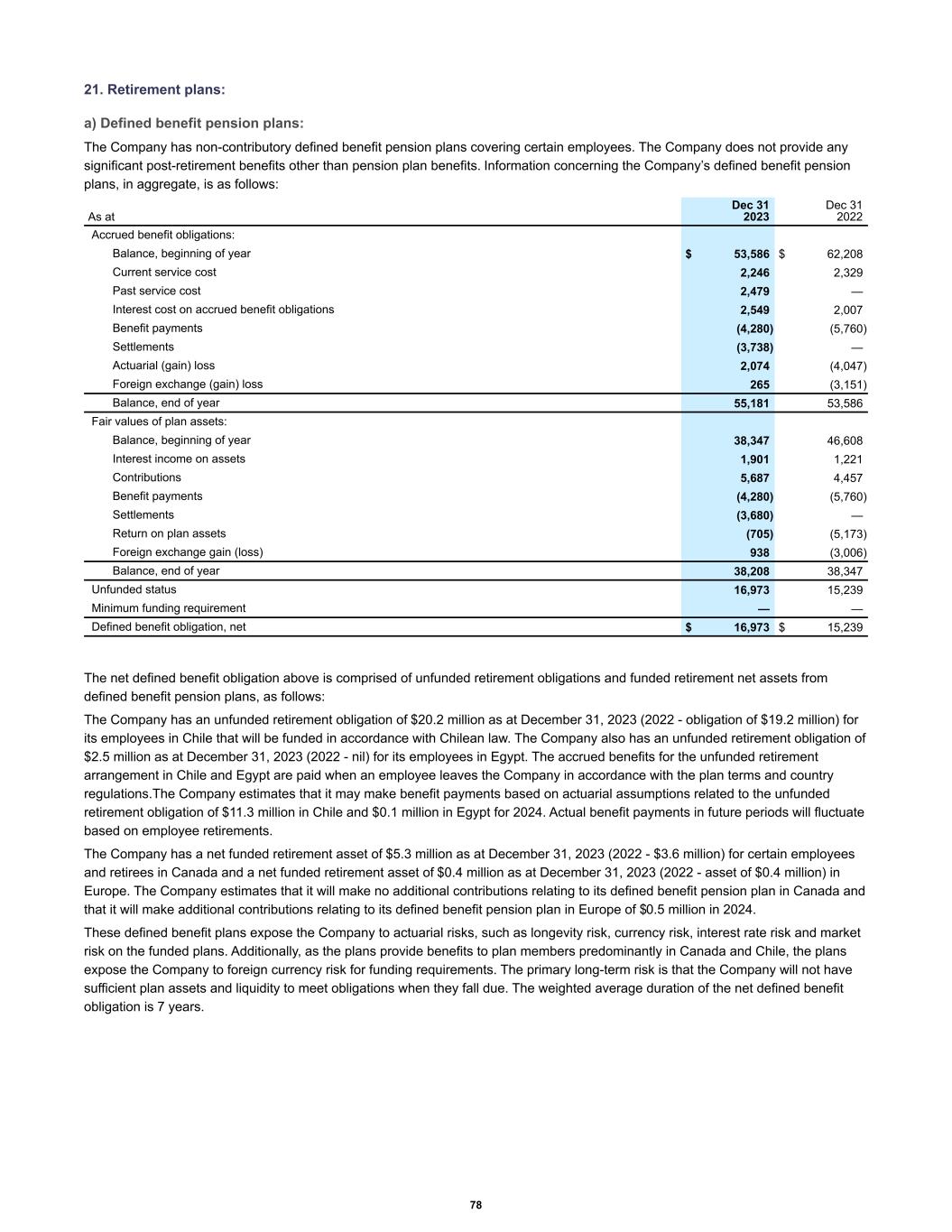 21. Retirement plans: a) Defined benefit pension plans: The Company has non-contributory defined benefit pension plans covering certain employees. The Company does not provide any significant post-retirement benefits other than pension plan benefits. Information concerning the Company’s defined benefit pension plans, in aggregate, is as follows: Accrued benefit obligations: Balance, beginning of year $ 53,586 $ 62,208 Current service cost 2,246 2,329 Past service cost 2,479 — Interest cost on accrued benefit obligations 2,549 2,007 Benefit payments (4,280) (5,760) Settlements (3,738) — Actuarial (gain) loss 2,074 (4,047) Foreign exchange (gain) loss 265 (3,151) Balance, end of year 55,181 53,586 Fair values of plan assets: Balance, beginning of year 38,347 46,608 Interest income on assets 1,901 1,221 Contributions 5,687 4,457 Benefit payments (4,280) (5,760) Settlements (3,680) — Return on plan assets (705) (5,173) Foreign exchange gain (loss) 938 (3,006) Balance, end of year 38,208 38,347 Unfunded status 16,973 15,239 Minimum funding requirement — — Defined benefit obligation, net $ 16,973 $ 15,239 As at Dec 31 2023 Dec 31 2022 The net defined benefit obligation above is comprised of unfunded retirement obligations and funded retirement net assets from defined benefit pension plans, as follows: The Company has an unfunded retirement obligation of $20.2 million as at December 31, 2023 (2022 - obligation of $19.2 million) for its employees in Chile that will be funded in accordance with Chilean law. The Company also has an unfunded retirement obligation of $2.5 million as at December 31, 2023 (2022 - nil) for its employees in Egypt. The accrued benefits for the unfunded retirement arrangement in Chile and Egypt are paid when an employee leaves the Company in accordance with the plan terms and country regulations.The Company estimates that it may make benefit payments based on actuarial assumptions related to the unfunded retirement obligation of $11.3 million in Chile and $0.1 million in Egypt for 2024. Actual benefit payments in future periods will fluctuate based on employee retirements. The Company has a net funded retirement asset of $5.3 million as at December 31, 2023 (2022 - $3.6 million) for certain employees and retirees in Canada and a net funded retirement asset of $0.4 million as at December 31, 2023 (2022 - asset of $0.4 million) in Europe. The Company estimates that it will make no additional contributions relating to its defined benefit pension plan in Canada and that it will make additional contributions relating to its defined benefit pension plan in Europe of $0.5 million in 2024. These defined benefit plans expose the Company to actuarial risks, such as longevity risk, currency risk, interest rate risk and market risk on the funded plans. Additionally, as the plans provide benefits to plan members predominantly in Canada and Chile, the plans expose the Company to foreign currency risk for funding requirements. The primary long-term risk is that the Company will not have sufficient plan assets and liquidity to meet obligations when they fall due. The weighted average duration of the net defined benefit obligation is 7 years. 78