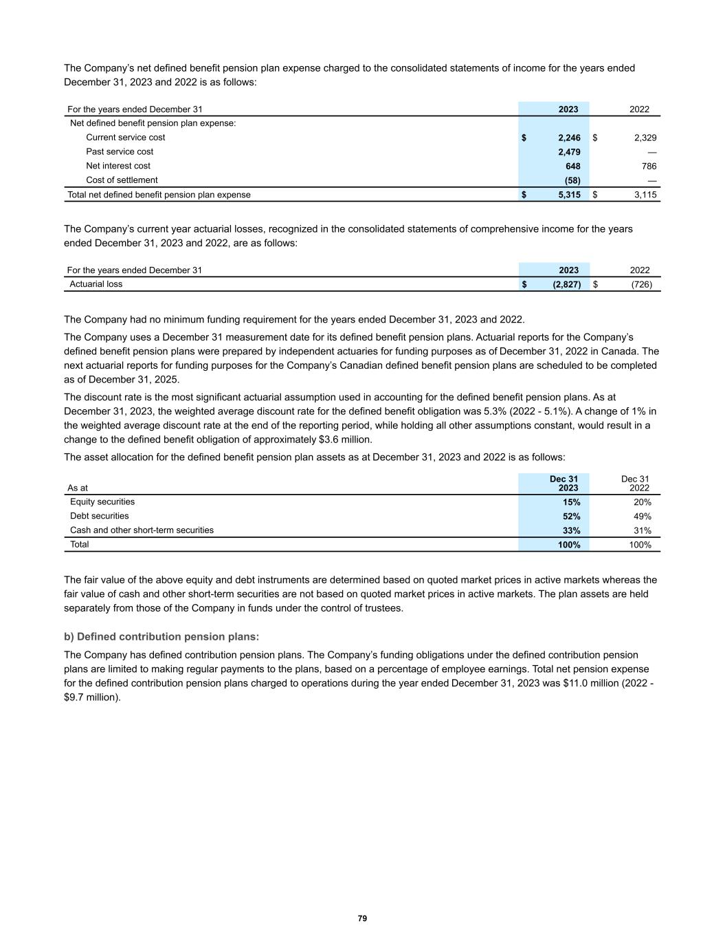 The Company’s net defined benefit pension plan expense charged to the consolidated statements of income for the years ended December 31, 2023 and 2022 is as follows: Net defined benefit pension plan expense: Current service cost $ 2,246 $ 2,329 Past service cost 2,479 — Net interest cost 648 786 Cost of settlement (58) — Total net defined benefit pension plan expense $ 5,315 $ 3,115 For the years ended December 31 2023 2022 The Company’s current year actuarial losses, recognized in the consolidated statements of comprehensive income for the years ended December 31, 2023 and 2022, are as follows: For the years ended December 31 2023 2022 Actuarial loss $ (2,827) $ (726) The Company had no minimum funding requirement for the years ended December 31, 2023 and 2022. The Company uses a December 31 measurement date for its defined benefit pension plans. Actuarial reports for the Company’s defined benefit pension plans were prepared by independent actuaries for funding purposes as of December 31, 2022 in Canada. The next actuarial reports for funding purposes for the Company’s Canadian defined benefit pension plans are scheduled to be completed as of December 31, 2025. The discount rate is the most significant actuarial assumption used in accounting for the defined benefit pension plans. As at December 31, 2023, the weighted average discount rate for the defined benefit obligation was 5.3% (2022 - 5.1%). A change of 1% in the weighted average discount rate at the end of the reporting period, while holding all other assumptions constant, would result in a change to the defined benefit obligation of approximately $3.6 million. The asset allocation for the defined benefit pension plan assets as at December 31, 2023 and 2022 is as follows: Equity securities 15 % 20 % Debt securities 52 % 49 % Cash and other short-term securities 33 % 31 % Total 100 % 100 % As at Dec 31 2023 Dec 31 2022 The fair value of the above equity and debt instruments are determined based on quoted market prices in active markets whereas the fair value of cash and other short-term securities are not based on quoted market prices in active markets. The plan assets are held separately from those of the Company in funds under the control of trustees. b) Defined contribution pension plans: The Company has defined contribution pension plans. The Company’s funding obligations under the defined contribution pension plans are limited to making regular payments to the plans, based on a percentage of employee earnings. Total net pension expense for the defined contribution pension plans charged to operations during the year ended December 31, 2023 was $11.0 million (2022 - $9.7 million). 79