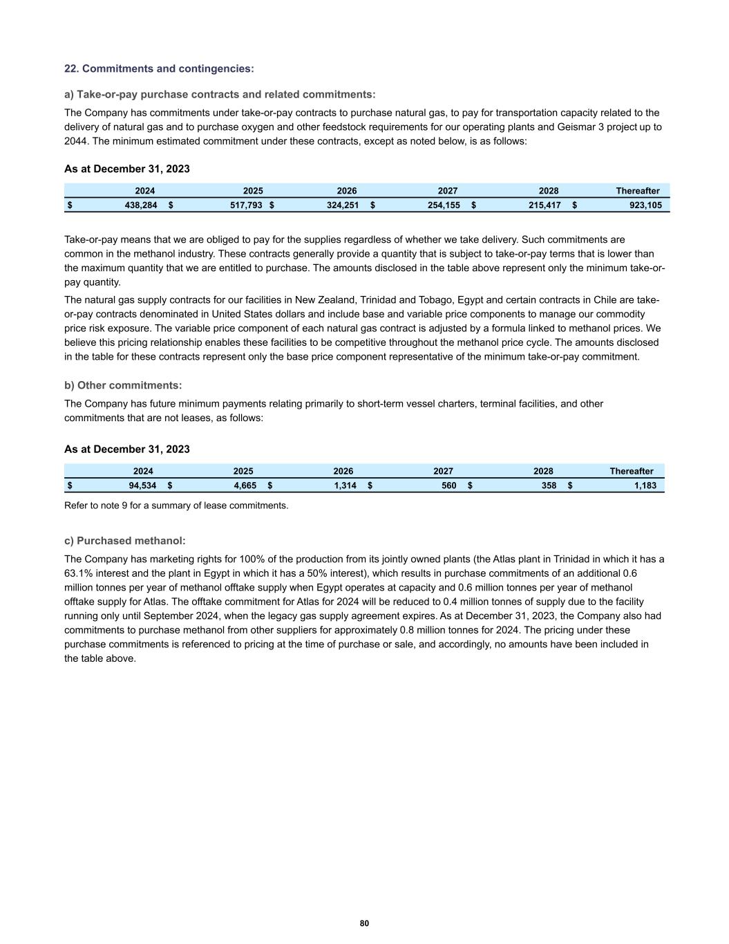 22. Commitments and contingencies: a) Take-or-pay purchase contracts and related commitments: The Company has commitments under take-or-pay contracts to purchase natural gas, to pay for transportation capacity related to the delivery of natural gas and to purchase oxygen and other feedstock requirements for our operating plants and Geismar 3 project up to 2044. The minimum estimated commitment under these contracts, except as noted below, is as follows: As at December 31, 2023 2024 2025 2026 2027 2028 Thereafter $ 438,284 $ 517,793 $ 324,251 $ 254,155 $ 215,417 $ 923,105 Take-or-pay means that we are obliged to pay for the supplies regardless of whether we take delivery. Such commitments are common in the methanol industry. These contracts generally provide a quantity that is subject to take-or-pay terms that is lower than the maximum quantity that we are entitled to purchase. The amounts disclosed in the table above represent only the minimum take-or- pay quantity. The natural gas supply contracts for our facilities in New Zealand, Trinidad and Tobago, Egypt and certain contracts in Chile are take- or-pay contracts denominated in United States dollars and include base and variable price components to manage our commodity price risk exposure. The variable price component of each natural gas contract is adjusted by a formula linked to methanol prices. We believe this pricing relationship enables these facilities to be competitive throughout the methanol price cycle. The amounts disclosed in the table for these contracts represent only the base price component representative of the minimum take-or-pay commitment. b) Other commitments: The Company has future minimum payments relating primarily to short-term vessel charters, terminal facilities, and other commitments that are not leases, as follows: As at December 31, 2023 2024 2025 2026 2027 2028 Thereafter $ 94,534 $ 4,665 $ 1,314 $ 560 $ 358 $ 1,183 Refer to note 9 for a summary of lease commitments. c) Purchased methanol: The Company has marketing rights for 100% of the production from its jointly owned plants (the Atlas plant in Trinidad in which it has a 63.1% interest and the plant in Egypt in which it has a 50% interest), which results in purchase commitments of an additional 0.6 million tonnes per year of methanol offtake supply when Egypt operates at capacity and 0.6 million tonnes per year of methanol offtake supply for Atlas. The offtake commitment for Atlas for 2024 will be reduced to 0.4 million tonnes of supply due to the facility running only until September 2024, when the legacy gas supply agreement expires. As at December 31, 2023, the Company also had commitments to purchase methanol from other suppliers for approximately 0.8 million tonnes for 2024. The pricing under these purchase commitments is referenced to pricing at the time of purchase or sale, and accordingly, no amounts have been included in the table above. 80