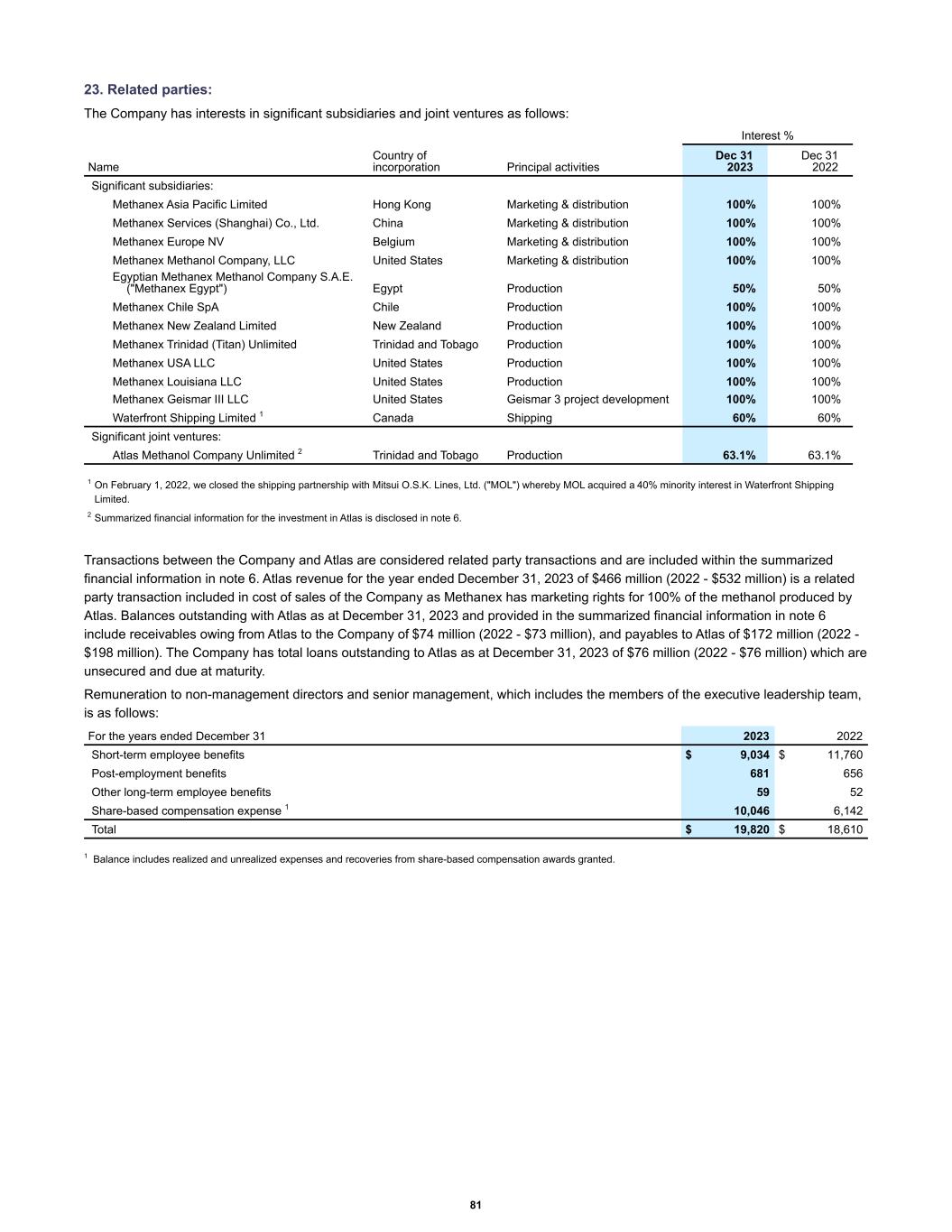 23. Related parties: The Company has interests in significant subsidiaries and joint ventures as follows: Dec 31 2023 Dec 31 2022 Significant subsidiaries: Methanex Asia Pacific Limited Hong Kong Marketing & distribution 100 % 100 % Methanex Services (Shanghai) Co., Ltd. China Marketing & distribution 100 % 100 % Methanex Europe NV Belgium Marketing & distribution 100 % 100 % Methanex Methanol Company, LLC United States Marketing & distribution 100 % 100 % Egyptian Methanex Methanol Company S.A.E. ("Methanex Egypt") Egypt Production 50 % 50 % Methanex Chile SpA Chile Production 100 % 100 % Methanex New Zealand Limited New Zealand Production 100 % 100 % Methanex Trinidad (Titan) Unlimited Trinidad and Tobago Production 100 % 100 % Methanex USA LLC United States Production 100 % 100 % Methanex Louisiana LLC United States Production 100 % 100 % Methanex Geismar III LLC United States Geismar 3 project development 100 % 100 % Waterfront Shipping Limited 1 Canada Shipping 60 % 60 % Significant joint ventures: Atlas Methanol Company Unlimited 2 Trinidad and Tobago Production 63.1 % 63.1 % Name Country of incorporation Principal activities Interest % 1 On February 1, 2022, we closed the shipping partnership with Mitsui O.S.K. Lines, Ltd. ("MOL") whereby MOL acquired a 40% minority interest in Waterfront Shipping Limited. 2 Summarized financial information for the investment in Atlas is disclosed in note 6. Transactions between the Company and Atlas are considered related party transactions and are included within the summarized financial information in note 6. Atlas revenue for the year ended December 31, 2023 of $466 million (2022 - $532 million) is a related party transaction included in cost of sales of the Company as Methanex has marketing rights for 100% of the methanol produced by Atlas. Balances outstanding with Atlas as at December 31, 2023 and provided in the summarized financial information in note 6 include receivables owing from Atlas to the Company of $74 million (2022 - $73 million), and payables to Atlas of $172 million (2022 - $198 million). The Company has total loans outstanding to Atlas as at December 31, 2023 of $76 million (2022 - $76 million) which are unsecured and due at maturity. Remuneration to non-management directors and senior management, which includes the members of the executive leadership team, is as follows: Short-term employee benefits $ 9,034 $ 11,760 Post-employment benefits 681 656 Other long-term employee benefits 59 52 Share-based compensation expense 1 10,046 6,142 Total $ 19,820 $ 18,610 For the years ended December 31 2023 2022 1 Balance includes realized and unrealized expenses and recoveries from share-based compensation awards granted. 81