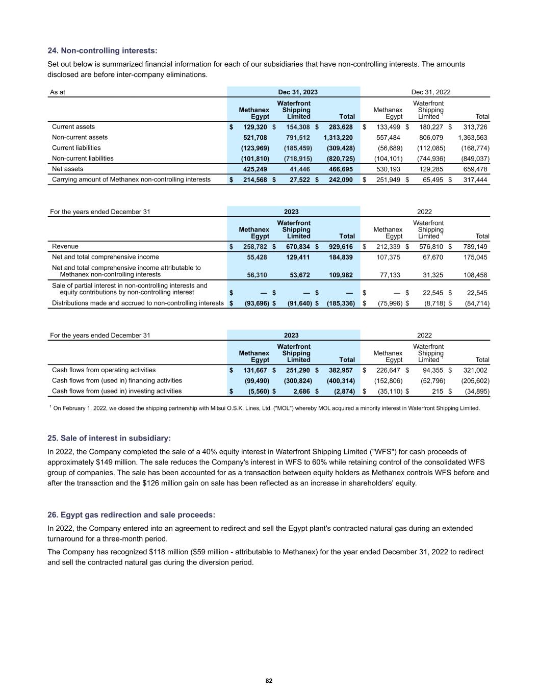 24. Non-controlling interests: Set out below is summarized financial information for each of our subsidiaries that have non-controlling interests. The amounts disclosed are before inter-company eliminations. Methanex Egypt Waterfront Shipping Limited Total Methanex Egypt Waterfront Shipping Limited 1 Total Current assets $ 129,320 $ 154,308 $ 283,628 $ 133,499 $ 180,227 $ 313,726 Non-current assets 521,708 791,512 1,313,220 557,484 806,079 1,363,563 Current liabilities (123,969) (185,459) (309,428) (56,689) (112,085) (168,774) Non-current liabilities (101,810) (718,915) (820,725) (104,101) (744,936) (849,037) Net assets 425,249 41,446 466,695 530,193 129,285 659,478 Carrying amount of Methanex non-controlling interests $ 214,568 $ 27,522 $ 242,090 $ 251,949 $ 65,495 $ 317,444 As at Dec 31, 2023 Dec 31, 2022 Methanex Egypt Waterfront Shipping Limited Total Methanex Egypt Waterfront Shipping Limited 1 Total Revenue $ 258,782 $ 670,834 $ 929,616 $ 212,339 $ 576,810 $ 789,149 Net and total comprehensive income 55,428 129,411 184,839 107,375 67,670 175,045 Net and total comprehensive income attributable to Methanex non-controlling interests 56,310 53,672 109,982 77,133 31,325 108,458 Sale of partial interest in non-controlling interests and equity contributions by non-controlling interest $ — $ — $ — $ — $ 22,545 $ 22,545 Distributions made and accrued to non-controlling interests $ (93,696) $ (91,640) $ (185,336) $ (75,996) $ (8,718) $ (84,714) For the years ended December 31 2023 2022 Methanex Egypt Waterfront Shipping Limited Total Methanex Egypt Waterfront Shipping Limited 1 Total Cash flows from operating activities $ 131,667 $ 251,290 $ 382,957 $ 226,647 $ 94,355 $ 321,002 Cash flows from (used in) financing activities (99,490) (300,824) (400,314) (152,806) (52,796) (205,602) Cash flows from (used in) investing activities $ (5,560) $ 2,686 $ (2,874) $ (35,110) $ 215 $ (34,895) For the years ended December 31 2023 2022 1 On February 1, 2022, we closed the shipping partnership with Mitsui O.S.K. Lines, Ltd. ("MOL") whereby MOL acquired a minority interest in Waterfront Shipping Limited. 25. Sale of interest in subsidiary: In 2022, the Company completed the sale of a 40% equity interest in Waterfront Shipping Limited ("WFS") for cash proceeds of approximately $149 million. The sale reduces the Company's interest in WFS to 60% while retaining control of the consolidated WFS group of companies. The sale has been accounted for as a transaction between equity holders as Methanex controls WFS before and after the transaction and the $126 million gain on sale has been reflected as an increase in shareholders' equity. 26. Egypt gas redirection and sale proceeds: In 2022, the Company entered into an agreement to redirect and sell the Egypt plant's contracted natural gas during an extended turnaround for a three-month period. The Company has recognized $118 million ($59 million - attributable to Methanex) for the year ended December 31, 2022 to redirect and sell the contracted natural gas during the diversion period. 82