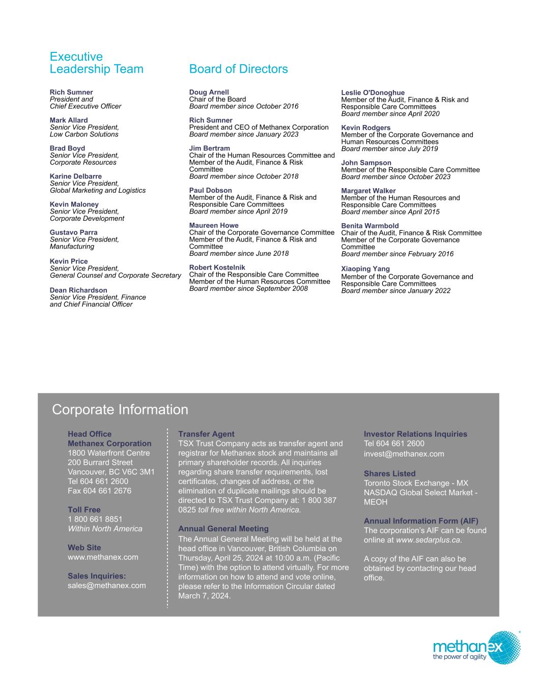 Executive Leadership Team Rich Sumner President and Chief Executive Officer Mark Allard Senior Vice President, Low Carbon Solutions Brad Boyd Senior Vice President, Corporate Resources Karine Delbarre Senior Vice President, Global Marketing and Logistics Kevin Maloney Senior Vice President, Corporate Development Gustavo Parra Senior Vice President, Manufacturing Kevin Price Senior Vice President, General Counsel and Corporate Secretary Dean Richardson Senior Vice President, Finance and Chief Financial Officer Board of Directors Doug Arnell Chair of the Board Board member since October 2016 Rich Sumner President and CEO of Methanex Corporation Board member since January 2023 Jim Bertram Chair of the Human Resources Committee and Member of the Audit, Finance & Risk Committee Board member since October 2018 Paul Dobson Member of the Audit, Finance & Risk and Responsible Care Committees Board member since April 2019 Maureen Howe Chair of the Corporate Governance Committee Member of the Audit, Finance & Risk and Committee Board member since June 2018 Robert Kostelnik Chair of the Responsible Care Committee Member of the Human Resources Committee Board member since September 2008 Leslie O'Donoghue Member of the Audit, Finance & Risk and Responsible Care Committees Board member since April 2020 Kevin Rodgers Member of the Corporate Governance and Human Resources Committees Board member since July 2019 John Sampson Member of the Responsible Care Committee Board member since October 2023 Margaret Walker Member of the Human Resources and Responsible Care Committees Board member since April 2015 Benita Warmbold Chair of the Audit, Finance & Risk Committee Member of the Corporate Governance Committee Board member since February 2016 Xiaoping Yang Member of the Corporate Governance and Responsible Care Committees Board member since January 2022 Corporate Information Head Office Methanex Corporation 1800 Waterfront Centre 200 Burrard Street Vancouver, BC V6C 3M1 Tel 604 661 2600 Fax 604 661 2676 Toll Free 1 800 661 8851 Within North America Web Site www.methanex.com Sales Inquiries: sales@methanex.com Transfer Agent TSX Trust Company acts as transfer agent and registrar for Methanex stock and maintains all primary shareholder records. All inquiries regarding share transfer requirements, lost certificates, changes of address, or the elimination of duplicate mailings should be directed to TSX Trust Company at: 1 800 387 0825 toll free within North America. Annual General Meeting The Annual General Meeting will be held at the head office in Vancouver, British Columbia on Thursday, April 25, 2024 at 10:00 a.m. (Pacific Time) with the option to attend virtually. For more information on how to attend and vote online, please refer to the Information Circular dated March 7, 2024. Investor Relations Inquiries Tel 604 661 2600 invest@methanex.com Shares Listed Toronto Stock Exchange - MX NASDAQ Global Select Market - MEOH Annual Information Form (AIF) The corporation’s AIF can be found online at www.sedarplus.ca. A copy of the AIF can also be obtained by contacting our head office.