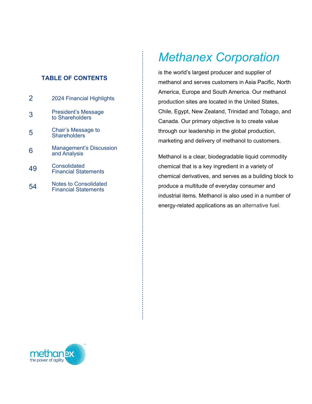 TABLE OF CONTENTS 2 2024 Financial Highlights 3 President’s Message to Shareholders 5 Chair’s Message to Shareholders 6 Management’s Discussion and Analysis 49 Consolidated Financial Statements 54 Notes to Consolidated Financial Statements Methanex Corporation is the world’s largest producer and supplier of methanol and serves customers in Asia Pacific, North America, Europe and South America. Our methanol production sites are located in the United States, Chile, Egypt, New Zealand, Trinidad and Tobago, and Canada. Our primary objective is to create value through our leadership in the global production, marketing and delivery of methanol to customers. Methanol is a clear, biodegradable liquid commodity chemical that is a key ingredient in a variety of chemical derivatives, and serves as a building block to produce a multitude of everyday consumer and industrial items. Methanol is also used in a number of energy-related applications as an alternative fuel.