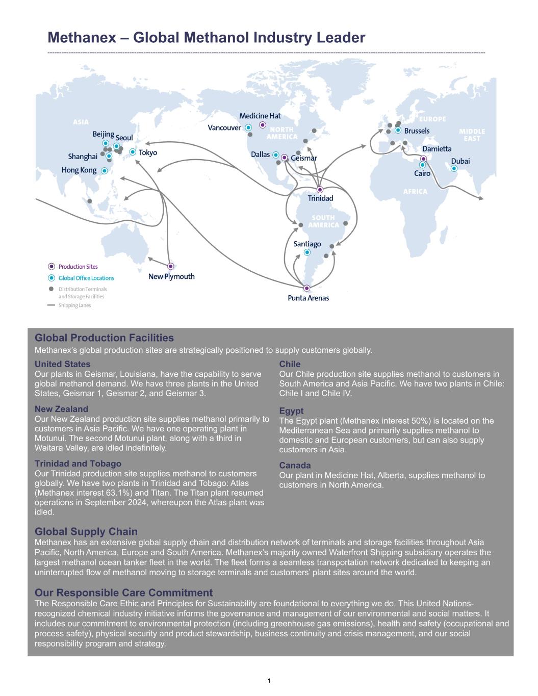 Methanex – Global Methanol Industry Leader ------------------------------------------------------------------------------------------------------------------------------------------------------------------------------------------- Global Production Facilities Methanex’s global production sites are strategically positioned to supply customers globally. United States Our plants in Geismar, Louisiana, have the capability to serve global methanol demand. We have three plants in the United States, Geismar 1, Geismar 2, and Geismar 3. New Zealand Our New Zealand production site supplies methanol primarily to customers in Asia Pacific. We have one operating plant in Motunui. The second Motunui plant, along with a third in Waitara Valley, are idled indefinitely. Trinidad and Tobago Our Trinidad production site supplies methanol to customers globally. We have two plants in Trinidad and Tobago: Atlas (Methanex interest 63.1%) and Titan. The Titan plant resumed operations in September 2024, whereupon the Atlas plant was idled. Chile Our Chile production site supplies methanol to customers in South America and Asia Pacific. We have two plants in Chile: Chile I and Chile IV. Egypt The Egypt plant (Methanex interest 50%) is located on the Mediterranean Sea and primarily supplies methanol to domestic and European customers, but can also supply customers in Asia. Canada Our plant in Medicine Hat, Alberta, supplies methanol to customers in North America. Global Supply Chain Methanex has an extensive global supply chain and distribution network of terminals and storage facilities throughout Asia Pacific, North America, Europe and South America. Methanex’s majority owned Waterfront Shipping subsidiary operates the largest methanol ocean tanker fleet in the world. The fleet forms a seamless transportation network dedicated to keeping an uninterrupted flow of methanol moving to storage terminals and customers’ plant sites around the world. Our Responsible Care Commitment The Responsible Care Ethic and Principles for Sustainability are foundational to everything we do. This United Nations- recognized chemical industry initiative informs the governance and management of our environmental and social matters. It includes our commitment to environmental protection (including greenhouse gas emissions), health and safety (occupational and process safety), physical security and product stewardship, business continuity and crisis management, and our social responsibility program and strategy. 1