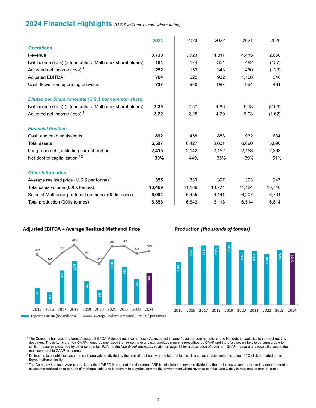 2024 Financial Highlights (U.S.$ millions, except where noted) Operations Revenue 3,720 3,723 4,311 4,415 2,650 Net income (loss) (attributable to Methanex shareholders) 164 174 354 482 (157) Adjusted net income (loss) 1 252 153 343 460 (123) Adjusted EBITDA 1 764 622 932 1,108 346 Cash flows from operating activities 737 660 987 994 461 Diluted per Share Amounts (U.S.$ per common share) Net income (loss) (attributable to Methanex shareholders) 2.39 2.57 4.86 6.13 (2.06) Adjusted net income (loss) 1 3.72 2.25 4.79 6.03 (1.62) Financial Position Cash and cash equivalents 892 458 858 932 834 Total assets 6,597 6,427 6,631 6,090 5,696 Long-term debt, including current portion 2,415 2,142 2,152 2,158 2,363 Net debt to capitalization 1 2 39 % 44 % 35 % 39 % 51 % Other Information Average realized price (U.S.$ per tonne) 3 355 333 397 393 247 Total sales volume (000s tonnes) 10,469 11,169 10,774 11,184 10,740 Sales of Methanex-produced methanol (000s tonnes) 6,094 6,455 6,141 6,207 6,704 Total production (000s tonnes) 6,358 6,642 6,118 6,514 6,614 2024 2023 2022 2021 2020 1 The Company has used the terms Adjusted EBITDA, Adjusted net income (loss), Adjusted net income (loss) per common share, and Net debt to capitalization throughout this document. These items are non-GAAP measures and ratios that do not have any standardized meaning prescribed by GAAP and therefore are unlikely to be comparable to similar measures presented by other companies. Refer to the Non-GAAP Measures section on page 39 for a description of each non-GAAP measure and reconciliations to the most comparable GAAP measures. 2 Defined as total debt less cash and cash equivalents divided by the sum of total equity and total debt less cash and cash equivalents (including 100% of debt related to the Egypt methanol facility). 3 The Company has used Average realized price ("ARP") throughout this document. ARP is calculated as revenue divided by the total sales volume. It is used by management to assess the realized price per unit of methanol sold, and is relevant in a cyclical commodity environment where revenue can fluctuate widely in response to market prices. 2