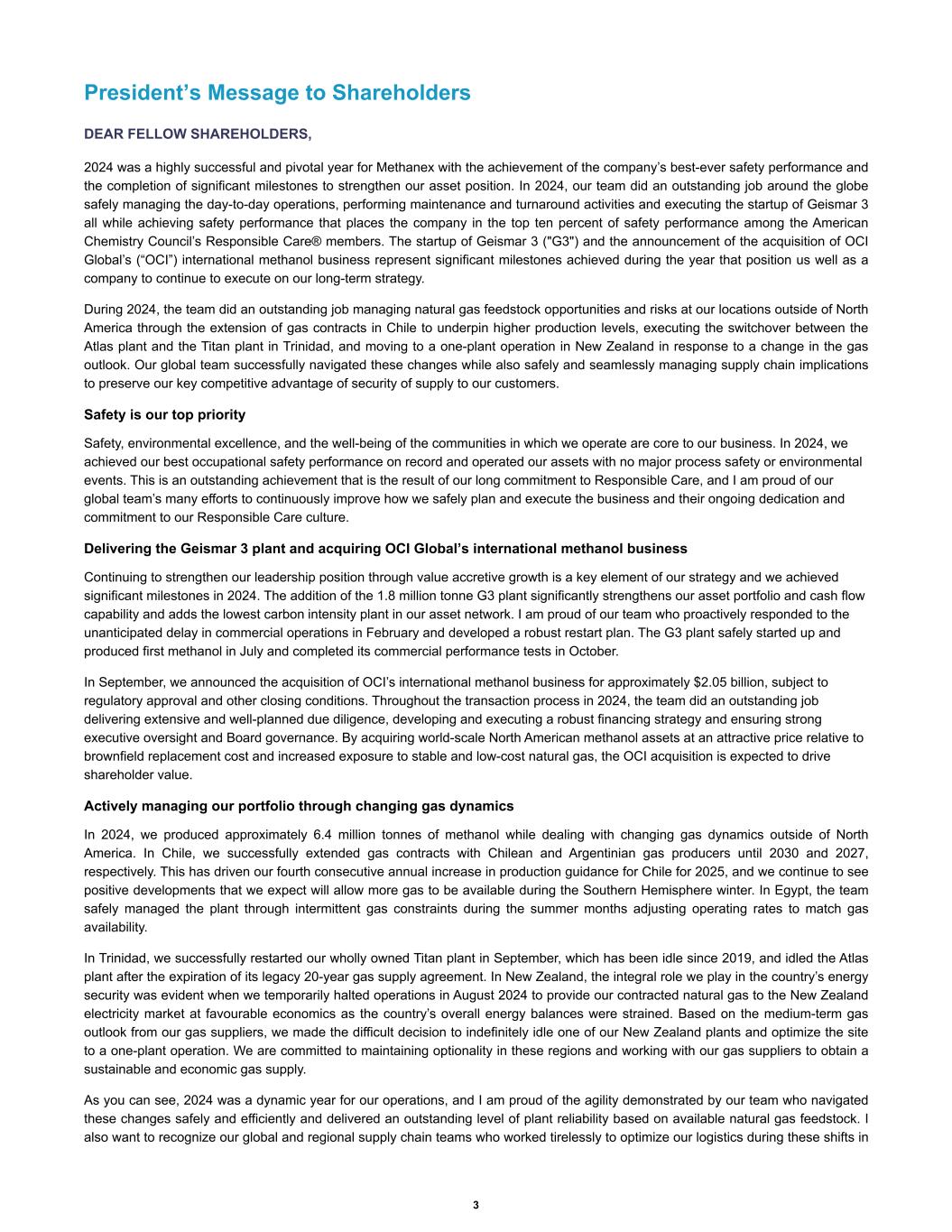 President’s Message to Shareholders DEAR FELLOW SHAREHOLDERS, 2024 was a highly successful and pivotal year for Methanex with the achievement of the company’s best-ever safety performance and the completion of significant milestones to strengthen our asset position. In 2024, our team did an outstanding job around the globe safely managing the day-to-day operations, performing maintenance and turnaround activities and executing the startup of Geismar 3 all while achieving safety performance that places the company in the top ten percent of safety performance among the American Chemistry Council’s Responsible Care® members. The startup of Geismar 3 ("G3") and the announcement of the acquisition of OCI Global’s (“OCI”) international methanol business represent significant milestones achieved during the year that position us well as a company to continue to execute on our long-term strategy. During 2024, the team did an outstanding job managing natural gas feedstock opportunities and risks at our locations outside of North America through the extension of gas contracts in Chile to underpin higher production levels, executing the switchover between the Atlas plant and the Titan plant in Trinidad, and moving to a one-plant operation in New Zealand in response to a change in the gas outlook. Our global team successfully navigated these changes while also safely and seamlessly managing supply chain implications to preserve our key competitive advantage of security of supply to our customers. Safety is our top priority Safety, environmental excellence, and the well-being of the communities in which we operate are core to our business. In 2024, we achieved our best occupational safety performance on record and operated our assets with no major process safety or environmental events. This is an outstanding achievement that is the result of our long commitment to Responsible Care, and I am proud of our global team’s many efforts to continuously improve how we safely plan and execute the business and their ongoing dedication and commitment to our Responsible Care culture. Delivering the Geismar 3 plant and acquiring OCI Global’s international methanol business Continuing to strengthen our leadership position through value accretive growth is a key element of our strategy and we achieved significant milestones in 2024. The addition of the 1.8 million tonne G3 plant significantly strengthens our asset portfolio and cash flow capability and adds the lowest carbon intensity plant in our asset network. I am proud of our team who proactively responded to the unanticipated delay in commercial operations in February and developed a robust restart plan. The G3 plant safely started up and produced first methanol in July and completed its commercial performance tests in October. In September, we announced the acquisition of OCI’s international methanol business for approximately $2.05 billion, subject to regulatory approval and other closing conditions. Throughout the transaction process in 2024, the team did an outstanding job delivering extensive and well-planned due diligence, developing and executing a robust financing strategy and ensuring strong executive oversight and Board governance. By acquiring world-scale North American methanol assets at an attractive price relative to brownfield replacement cost and increased exposure to stable and low-cost natural gas, the OCI acquisition is expected to drive shareholder value. Actively managing our portfolio through changing gas dynamics In 2024, we produced approximately 6.4 million tonnes of methanol while dealing with changing gas dynamics outside of North America. In Chile, we successfully extended gas contracts with Chilean and Argentinian gas producers until 2030 and 2027, respectively. This has driven our fourth consecutive annual increase in production guidance for Chile for 2025, and we continue to see positive developments that we expect will allow more gas to be available during the Southern Hemisphere winter. In Egypt, the team safely managed the plant through intermittent gas constraints during the summer months adjusting operating rates to match gas availability. In Trinidad, we successfully restarted our wholly owned Titan plant in September, which has been idle since 2019, and idled the Atlas plant after the expiration of its legacy 20-year gas supply agreement. In New Zealand, the integral role we play in the country’s energy security was evident when we temporarily halted operations in August 2024 to provide our contracted natural gas to the New Zealand electricity market at favourable economics as the country’s overall energy balances were strained. Based on the medium-term gas outlook from our gas suppliers, we made the difficult decision to indefinitely idle one of our New Zealand plants and optimize the site to a one-plant operation. We are committed to maintaining optionality in these regions and working with our gas suppliers to obtain a sustainable and economic gas supply. As you can see, 2024 was a dynamic year for our operations, and I am proud of the agility demonstrated by our team who navigated these changes safely and efficiently and delivered an outstanding level of plant reliability based on available natural gas feedstock. I also want to recognize our global and regional supply chain teams who worked tirelessly to optimize our logistics during these shifts in 3