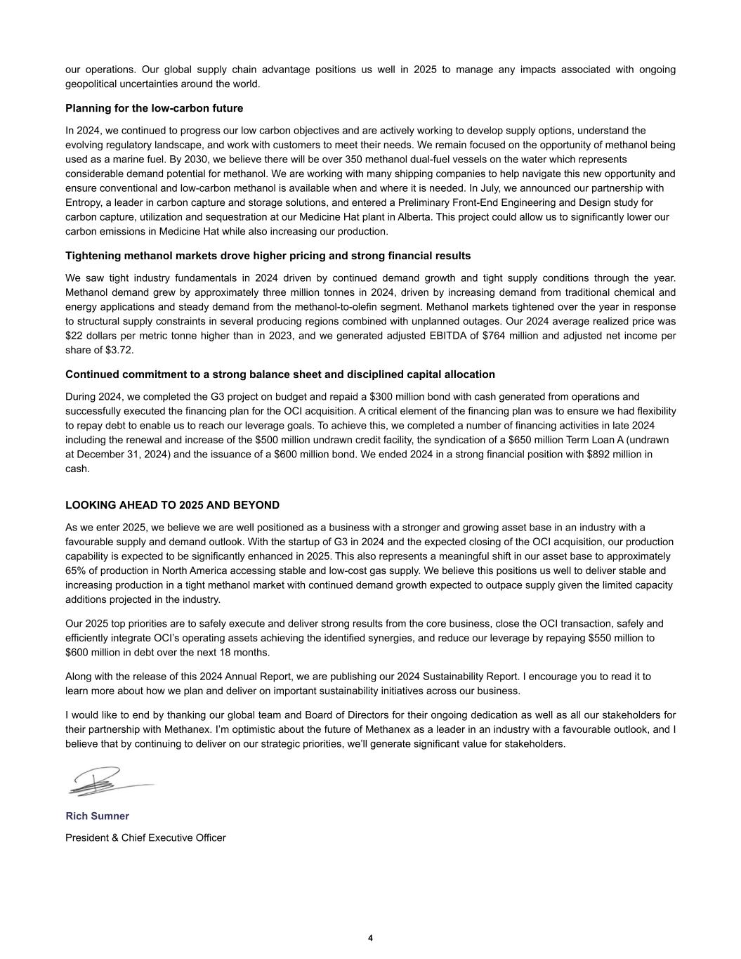 our operations. Our global supply chain advantage positions us well in 2025 to manage any impacts associated with ongoing geopolitical uncertainties around the world. Planning for the low-carbon future In 2024, we continued to progress our low carbon objectives and are actively working to develop supply options, understand the evolving regulatory landscape, and work with customers to meet their needs. We remain focused on the opportunity of methanol being used as a marine fuel. By 2030, we believe there will be over 350 methanol dual-fuel vessels on the water which represents considerable demand potential for methanol. We are working with many shipping companies to help navigate this new opportunity and ensure conventional and low-carbon methanol is available when and where it is needed. In July, we announced our partnership with Entropy, a leader in carbon capture and storage solutions, and entered a Preliminary Front-End Engineering and Design study for carbon capture, utilization and sequestration at our Medicine Hat plant in Alberta. This project could allow us to significantly lower our carbon emissions in Medicine Hat while also increasing our production. Tightening methanol markets drove higher pricing and strong financial results We saw tight industry fundamentals in 2024 driven by continued demand growth and tight supply conditions through the year. Methanol demand grew by approximately three million tonnes in 2024, driven by increasing demand from traditional chemical and energy applications and steady demand from the methanol-to-olefin segment. Methanol markets tightened over the year in response to structural supply constraints in several producing regions combined with unplanned outages. Our 2024 average realized price was $22 dollars per metric tonne higher than in 2023, and we generated adjusted EBITDA of $764 million and adjusted net income per share of $3.72. Continued commitment to a strong balance sheet and disciplined capital allocation During 2024, we completed the G3 project on budget and repaid a $300 million bond with cash generated from operations and successfully executed the financing plan for the OCI acquisition. A critical element of the financing plan was to ensure we had flexibility to repay debt to enable us to reach our leverage goals. To achieve this, we completed a number of financing activities in late 2024 including the renewal and increase of the $500 million undrawn credit facility, the syndication of a $650 million Term Loan A (undrawn at December 31, 2024) and the issuance of a $600 million bond. We ended 2024 in a strong financial position with $892 million in cash. LOOKING AHEAD TO 2025 AND BEYOND As we enter 2025, we believe we are well positioned as a business with a stronger and growing asset base in an industry with a favourable supply and demand outlook. With the startup of G3 in 2024 and the expected closing of the OCI acquisition, our production capability is expected to be significantly enhanced in 2025. This also represents a meaningful shift in our asset base to approximately 65% of production in North America accessing stable and low-cost gas supply. We believe this positions us well to deliver stable and increasing production in a tight methanol market with continued demand growth expected to outpace supply given the limited capacity additions projected in the industry. Our 2025 top priorities are to safely execute and deliver strong results from the core business, close the OCI transaction, safely and efficiently integrate OCI’s operating assets achieving the identified synergies, and reduce our leverage by repaying $550 million to $600 million in debt over the next 18 months. Along with the release of this 2024 Annual Report, we are publishing our 2024 Sustainability Report. I encourage you to read it to learn more about how we plan and deliver on important sustainability initiatives across our business. I would like to end by thanking our global team and Board of Directors for their ongoing dedication as well as all our stakeholders for their partnership with Methanex. I’m optimistic about the future of Methanex as a leader in an industry with a favourable outlook, and I believe that by continuing to deliver on our strategic priorities, we’ll generate significant value for stakeholders. Rich Sumner President & Chief Executive Officer 4