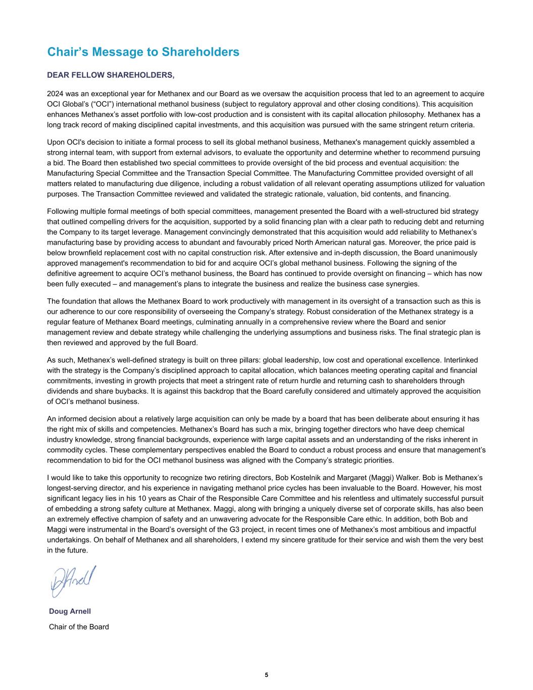 Chair’s Message to Shareholders DEAR FELLOW SHAREHOLDERS, 2024 was an exceptional year for Methanex and our Board as we oversaw the acquisition process that led to an agreement to acquire OCI Global’s (“OCI”) international methanol business (subject to regulatory approval and other closing conditions). This acquisition enhances Methanex’s asset portfolio with low-cost production and is consistent with its capital allocation philosophy. Methanex has a long track record of making disciplined capital investments, and this acquisition was pursued with the same stringent return criteria. Upon OCI's decision to initiate a formal process to sell its global methanol business, Methanex's management quickly assembled a strong internal team, with support from external advisors, to evaluate the opportunity and determine whether to recommend pursuing a bid. The Board then established two special committees to provide oversight of the bid process and eventual acquisition: the Manufacturing Special Committee and the Transaction Special Committee. The Manufacturing Committee provided oversight of all matters related to manufacturing due diligence, including a robust validation of all relevant operating assumptions utilized for valuation purposes. The Transaction Committee reviewed and validated the strategic rationale, valuation, bid contents, and financing. Following multiple formal meetings of both special committees, management presented the Board with a well-structured bid strategy that outlined compelling drivers for the acquisition, supported by a solid financing plan with a clear path to reducing debt and returning the Company to its target leverage. Management convincingly demonstrated that this acquisition would add reliability to Methanex’s manufacturing base by providing access to abundant and favourably priced North American natural gas. Moreover, the price paid is below brownfield replacement cost with no capital construction risk. After extensive and in-depth discussion, the Board unanimously approved management's recommendation to bid for and acquire OCI’s global methanol business. Following the signing of the definitive agreement to acquire OCI’s methanol business, the Board has continued to provide oversight on financing – which has now been fully executed – and management’s plans to integrate the business and realize the business case synergies. The foundation that allows the Methanex Board to work productively with management in its oversight of a transaction such as this is our adherence to our core responsibility of overseeing the Company’s strategy. Robust consideration of the Methanex strategy is a regular feature of Methanex Board meetings, culminating annually in a comprehensive review where the Board and senior management review and debate strategy while challenging the underlying assumptions and business risks. The final strategic plan is then reviewed and approved by the full Board. As such, Methanex’s well-defined strategy is built on three pillars: global leadership, low cost and operational excellence. Interlinked with the strategy is the Company’s disciplined approach to capital allocation, which balances meeting operating capital and financial commitments, investing in growth projects that meet a stringent rate of return hurdle and returning cash to shareholders through dividends and share buybacks. It is against this backdrop that the Board carefully considered and ultimately approved the acquisition of OCI’s methanol business. An informed decision about a relatively large acquisition can only be made by a board that has been deliberate about ensuring it has the right mix of skills and competencies. Methanex’s Board has such a mix, bringing together directors who have deep chemical industry knowledge, strong financial backgrounds, experience with large capital assets and an understanding of the risks inherent in commodity cycles. These complementary perspectives enabled the Board to conduct a robust process and ensure that management’s recommendation to bid for the OCI methanol business was aligned with the Company’s strategic priorities. I would like to take this opportunity to recognize two retiring directors, Bob Kostelnik and Margaret (Maggi) Walker. Bob is Methanex’s longest-serving director, and his experience in navigating methanol price cycles has been invaluable to the Board. However, his most significant legacy lies in his 10 years as Chair of the Responsible Care Committee and his relentless and ultimately successful pursuit of embedding a strong safety culture at Methanex. Maggi, along with bringing a uniquely diverse set of corporate skills, has also been an extremely effective champion of safety and an unwavering advocate for the Responsible Care ethic. In addition, both Bob and Maggi were instrumental in the Board’s oversight of the G3 project, in recent times one of Methanex’s most ambitious and impactful undertakings. On behalf of Methanex and all shareholders, I extend my sincere gratitude for their service and wish them the very best in the future. Doug Arnell Chair of the Board 5