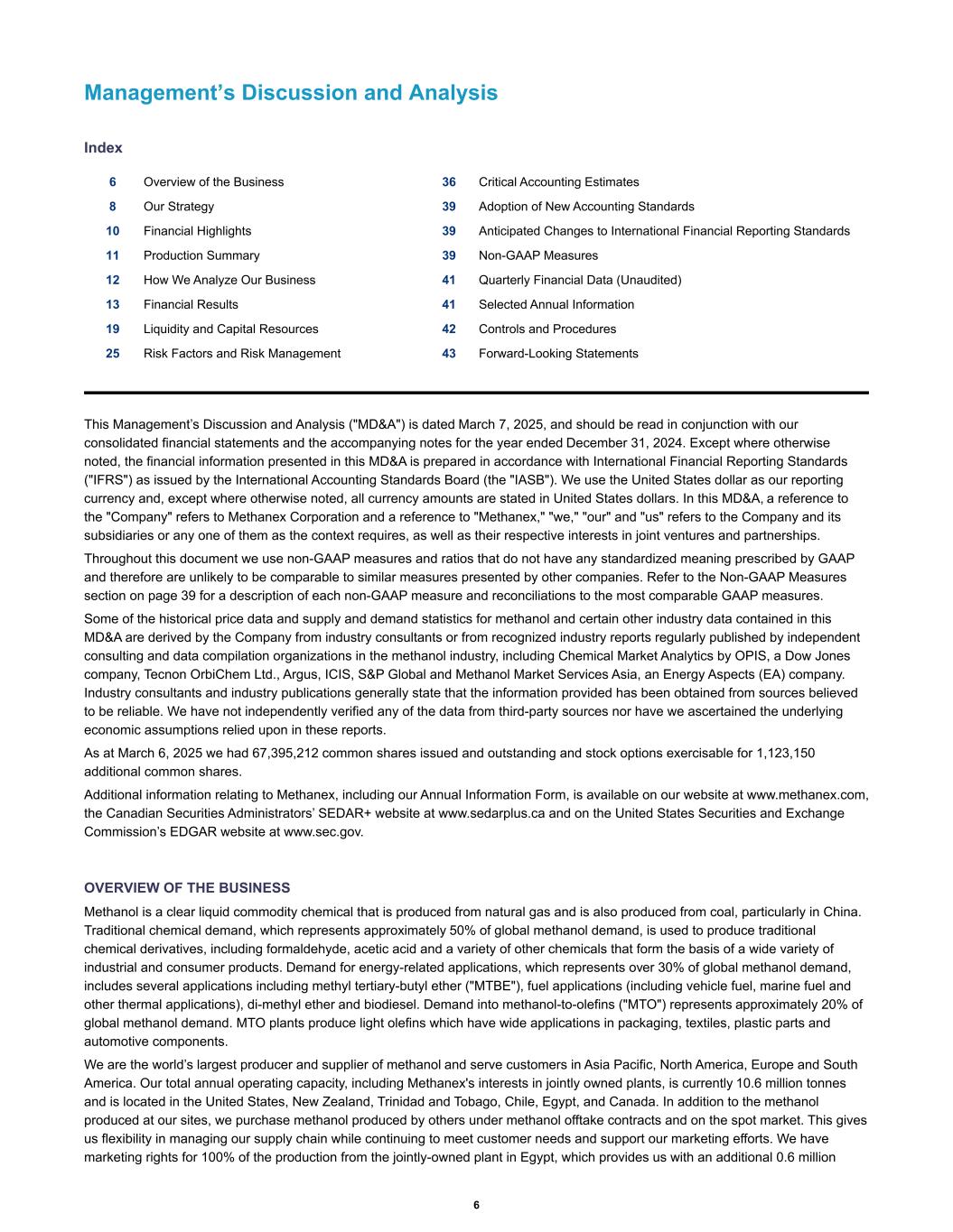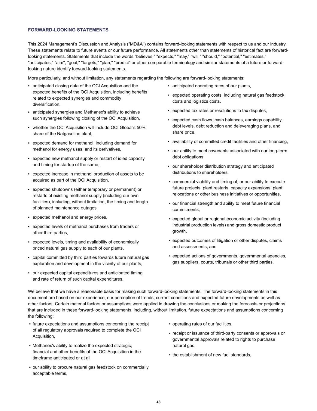 FORWARD-LOOKING STATEMENTS This 2024 Management’s Discussion and Analysis ("MD&A") contains forward-looking statements with respect to us and our industry. These statements relate to future events or our future performance. All statements other than statements of historical fact are forward- looking statements. Statements that include the words "believes," "expects," "may," "will," "should," "potential," "estimates," "anticipates," "aim", "goal," "targets," "plan," "predict" or other comparable terminology and similar statements of a future or forward- looking nature identify forward-looking statements. More particularly, and without limitation, any statements regarding the following are forward-looking statements: ▪ anticipated closing date of the OCI Acquisition and the expected benefits of the OCI Acquisition, including benefits related to expected synergies and commodity diversification, ▪ anticipated synergies and Methanex's ability to achieve such synergies following closing of the OCI Acquisition, ▪ whether the OCI Acquisition will include OCI Global's 50% share of the Natgasoline plant, ▪ expected demand for methanol, including demand for methanol for energy uses, and its derivatives, ▪ expected new methanol supply or restart of idled capacity and timing for startup of the same, ▪ expected increase in methanol production of assets to be acquired as part of the OCI Acquisition, ▪ expected shutdowns (either temporary or permanent) or restarts of existing methanol supply (including our own facilities), including, without limitation, the timing and length of planned maintenance outages, ▪ expected methanol and energy prices, ▪ expected levels of methanol purchases from traders or other third parties, ▪ expected levels, timing and availability of economically priced natural gas supply to each of our plants, ▪ capital committed by third parties towards future natural gas exploration and development in the vicinity of our plants, ▪ our expected capital expenditures and anticipated timing and rate of return of such capital expenditures, ▪ anticipated operating rates of our plants, ▪ expected operating costs, including natural gas feedstock costs and logistics costs, ▪ expected tax rates or resolutions to tax disputes, ▪ expected cash flows, cash balances, earnings capability, debt levels, debt reduction and deleveraging plans, and share price, ▪ availability of committed credit facilities and other financing, ▪ our ability to meet covenants associated with our long-term debt obligations, ▪ our shareholder distribution strategy and anticipated distributions to shareholders, ▪ commercial viability and timing of, or our ability to execute future projects, plant restarts, capacity expansions, plant relocations or other business initiatives or opportunities, ▪ our financial strength and ability to meet future financial commitments, ▪ expected global or regional economic activity (including industrial production levels) and gross domestic product growth, ▪ expected outcomes of litigation or other disputes, claims and assessments, and ▪ expected actions of governments, governmental agencies, gas suppliers, courts, tribunals or other third parties. We believe that we have a reasonable basis for making such forward-looking statements. The forward-looking statements in this document are based on our experience, our perception of trends, current conditions and expected future developments as well as other factors. Certain material factors or assumptions were applied in drawing the conclusions or making the forecasts or projections that are included in these forward-looking statements, including, without limitation, future expectations and assumptions concerning the following: ▪ future expectations and assumptions concerning the receipt of all regulatory approvals required to complete the OCI Acquisition, ▪ Methanex's ability to realize the expected strategic, financial and other benefits of the OCI Acquisition in the timeframe anticipated or at all, ▪ our ability to procure natural gas feedstock on commercially acceptable terms, ▪ operating rates of our facilities, ▪ receipt or issuance of third-party consents or approvals or governmental approvals related to rights to purchase natural gas, ▪ the establishment of new fuel standards, 43