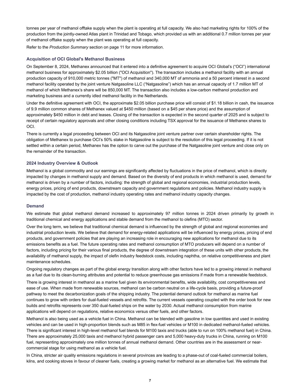 tonnes per year of methanol offtake supply when the plant is operating at full capacity. We also had marketing rights for 100% of the production from the jointly-owned Atlas plant in Trinidad and Tobago, which provided us with an additional 0.7 million tonnes per year of methanol offtake supply when the plant was operating at full capacity. Refer to the Production Summary section on page 11 for more information. Acquisition of OCI Global's Methanol Business On September 8, 2024, Methanex announced that it entered into a definitive agreement to acquire OCI Global’s (“OCI”) international methanol business for approximately $2.05 billion ("OCI Acquisition"). The transaction includes a methanol facility with an annual production capacity of 910,000 metric tonnes ("MT") of methanol and 340,000 MT of ammonia and a 50 percent interest in a second methanol facility operated by the joint venture Natgasoline LLC (“Natgasoline”) which has an annual capacity of 1.7 million MT of methanol of which Methanex’s share will be 850,000 MT. The transaction also includes a low-carbon methanol production and marketing business and a currently idled methanol facility in the Netherlands. Under the definitive agreement with OCI, the approximate $2.05 billion purchase price will consist of $1.18 billion in cash, the issuance of 9.9 million common shares of Methanex valued at $450 million (based on a $45 per share price) and the assumption of approximately $450 million in debt and leases. Closing of the transaction is expected in the second quarter of 2025 and is subject to receipt of certain regulatory approvals and other closing conditions including TSX approval for the issuance of Methanex shares to OCI. There is currently a legal proceeding between OCI and its Natgasoline joint venture partner over certain shareholder rights. The obligation of Methanex to purchase OCI’s 50% stake in Natgasoline is subject to the resolution of this legal proceeding. If it is not settled within a certain period, Methanex has the option to carve out the purchase of the Natgasoline joint venture and close only on the remainder of the transaction. 2024 Industry Overview & Outlook Methanol is a global commodity and our earnings are significantly affected by fluctuations in the price of methanol, which is directly impacted by changes in methanol supply and demand. Based on the diversity of end products in which methanol is used, demand for methanol is driven by a number of factors, including: the strength of global and regional economies, industrial production levels, energy prices, pricing of end products, downstream capacity and government regulations and policies. Methanol industry supply is impacted by the cost of production, methanol industry operating rates and methanol industry capacity changes. Demand We estimate that global methanol demand increased to approximately 97 million tonnes in 2024 driven primarily by growth in traditional chemical and energy applications and stable demand from the methanol to olefins (MTO) sector. Over the long term, we believe that traditional chemical demand is influenced by the strength of global and regional economies and industrial production levels. We believe that demand for energy-related applications will be influenced by energy prices, pricing of end products, and government policies that are playing an increasing role in encouraging new applications for methanol due to its emissions benefits as a fuel. The future operating rates and methanol consumption of MTO producers will depend on a number of factors, including pricing for their various final products, the degree of downstream integration of these units with other products, the availability of methanol supply, the impact of olefin industry feedstock costs, including naphtha, on relative competitiveness and plant maintenance schedules. Ongoing regulatory changes as part of the global energy transition along with other factors have led to a growing interest in methanol as a fuel due to its clean-burning attributes and potential to reduce greenhouse gas emissions if made from a renewable feedstock. There is growing interest in methanol as a marine fuel given its environmental benefits, wide availability, cost competitiveness and ease of use. When made from renewable sources, methanol can be carbon neutral on a life-cycle basis, providing a future-proof pathway to meet the decarbonization goals of the shipping industry. The potential demand outlook for methanol as marine fuel continues to grow with orders for dual-fueled vessels and retrofits. The current vessels operating coupled with the order book for new builds and retrofits represents over 350 dual-fueled ships on the water by 2030. Actual methanol consumption from marine applications will depend on regulations, relative economics versus other fuels, and other factors. Methanol is also being used as a vehicle fuel in China. Methanol can be blended with gasoline in low quantities and used in existing vehicles and can be used in high-proportion blends such as M85 in flex-fuel vehicles or M100 in dedicated methanol-fueled vehicles. There is significant interest in high-level methanol fuel blends for M100 taxis and trucks (able to run on 100% methanol fuel) in China. There are approximately 25,000 taxis and methanol hybrid passenger cars and 5,000 heavy-duty trucks in China, running on M100 fuel, representing approximately one million tonnes of annual methanol demand. Other countries are in the assessment or near- commercial stage for using methanol as a vehicle fuel. In China, stricter air quality emissions regulations in several provinces are leading to a phase-out of coal-fueled commercial boilers, kilns, and cooking stoves in favour of cleaner fuels, creating a growing market for methanol as an alternative fuel. We estimate that 7
