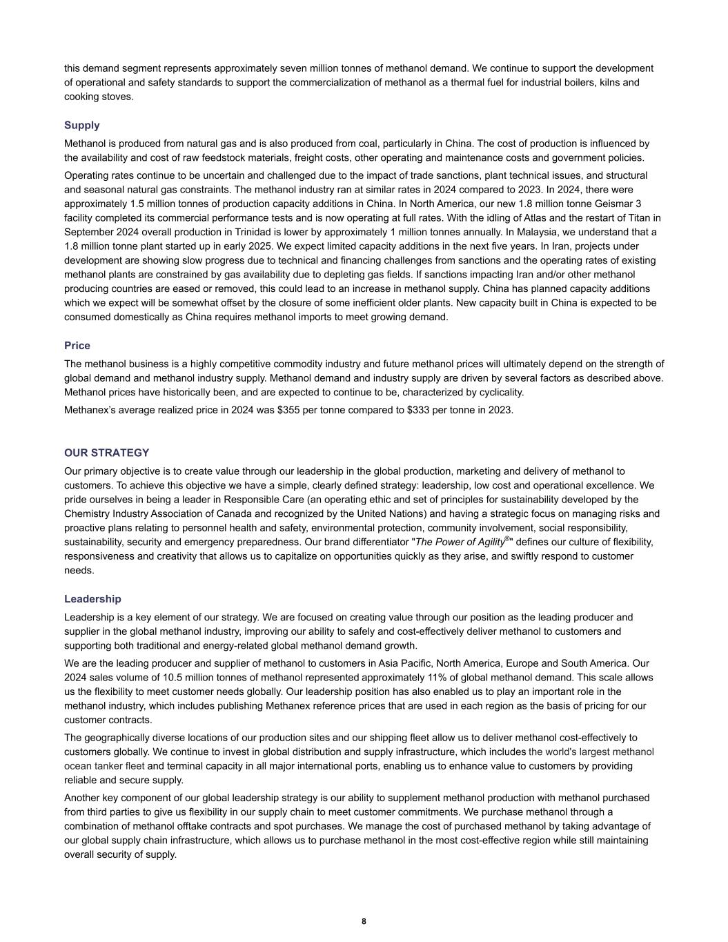 this demand segment represents approximately seven million tonnes of methanol demand. We continue to support the development of operational and safety standards to support the commercialization of methanol as a thermal fuel for industrial boilers, kilns and cooking stoves. Supply Methanol is produced from natural gas and is also produced from coal, particularly in China. The cost of production is influenced by the availability and cost of raw feedstock materials, freight costs, other operating and maintenance costs and government policies. Operating rates continue to be uncertain and challenged due to the impact of trade sanctions, plant technical issues, and structural and seasonal natural gas constraints. The methanol industry ran at similar rates in 2024 compared to 2023. In 2024, there were approximately 1.5 million tonnes of production capacity additions in China. In North America, our new 1.8 million tonne Geismar 3 facility completed its commercial performance tests and is now operating at full rates. With the idling of Atlas and the restart of Titan in September 2024 overall production in Trinidad is lower by approximately 1 million tonnes annually. In Malaysia, we understand that a 1.8 million tonne plant started up in early 2025. We expect limited capacity additions in the next five years. In Iran, projects under development are showing slow progress due to technical and financing challenges from sanctions and the operating rates of existing methanol plants are constrained by gas availability due to depleting gas fields. If sanctions impacting Iran and/or other methanol producing countries are eased or removed, this could lead to an increase in methanol supply. China has planned capacity additions which we expect will be somewhat offset by the closure of some inefficient older plants. New capacity built in China is expected to be consumed domestically as China requires methanol imports to meet growing demand. Price The methanol business is a highly competitive commodity industry and future methanol prices will ultimately depend on the strength of global demand and methanol industry supply. Methanol demand and industry supply are driven by several factors as described above. Methanol prices have historically been, and are expected to continue to be, characterized by cyclicality. Methanex’s average realized price in 2024 was $355 per tonne compared to $333 per tonne in 2023. OUR STRATEGY Our primary objective is to create value through our leadership in the global production, marketing and delivery of methanol to customers. To achieve this objective we have a simple, clearly defined strategy: leadership, low cost and operational excellence. We pride ourselves in being a leader in Responsible Care (an operating ethic and set of principles for sustainability developed by the Chemistry Industry Association of Canada and recognized by the United Nations) and having a strategic focus on managing risks and proactive plans relating to personnel health and safety, environmental protection, community involvement, social responsibility, sustainability, security and emergency preparedness. Our brand differentiator "The Power of Agility®" defines our culture of flexibility, responsiveness and creativity that allows us to capitalize on opportunities quickly as they arise, and swiftly respond to customer needs. Leadership Leadership is a key element of our strategy. We are focused on creating value through our position as the leading producer and supplier in the global methanol industry, improving our ability to safely and cost-effectively deliver methanol to customers and supporting both traditional and energy-related global methanol demand growth. We are the leading producer and supplier of methanol to customers in Asia Pacific, North America, Europe and South America. Our 2024 sales volume of 10.5 million tonnes of methanol represented approximately 11% of global methanol demand. This scale allows us the flexibility to meet customer needs globally. Our leadership position has also enabled us to play an important role in the methanol industry, which includes publishing Methanex reference prices that are used in each region as the basis of pricing for our customer contracts. The geographically diverse locations of our production sites and our shipping fleet allow us to deliver methanol cost-effectively to customers globally. We continue to invest in global distribution and supply infrastructure, which includes the world's largest methanol ocean tanker fleet and terminal capacity in all major international ports, enabling us to enhance value to customers by providing reliable and secure supply. Another key component of our global leadership strategy is our ability to supplement methanol production with methanol purchased from third parties to give us flexibility in our supply chain to meet customer commitments. We purchase methanol through a combination of methanol offtake contracts and spot purchases. We manage the cost of purchased methanol by taking advantage of our global supply chain infrastructure, which allows us to purchase methanol in the most cost-effective region while still maintaining overall security of supply. 8