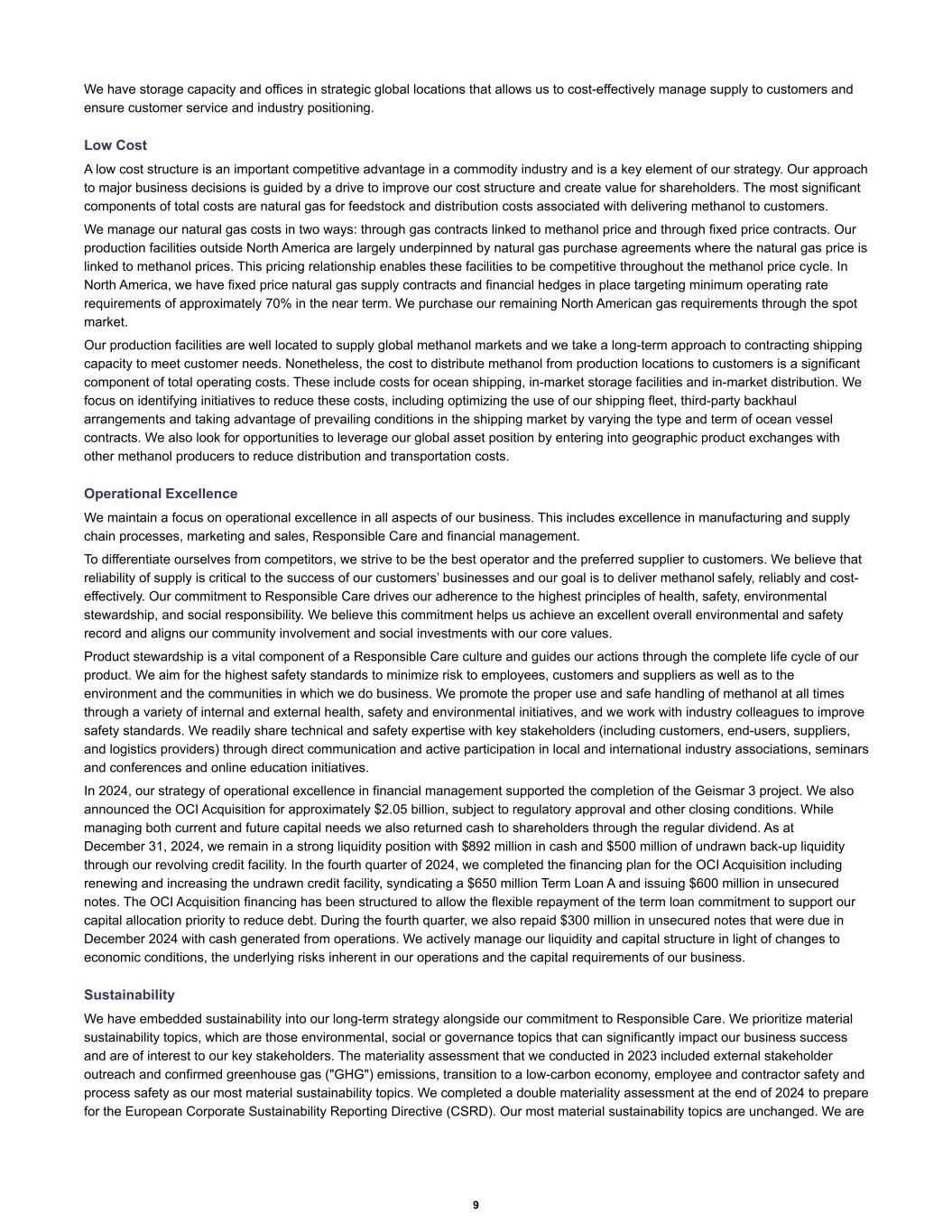 We have storage capacity and offices in strategic global locations that allows us to cost-effectively manage supply to customers and ensure customer service and industry positioning. Low Cost A low cost structure is an important competitive advantage in a commodity industry and is a key element of our strategy. Our approach to major business decisions is guided by a drive to improve our cost structure and create value for shareholders. The most significant components of total costs are natural gas for feedstock and distribution costs associated with delivering methanol to customers. We manage our natural gas costs in two ways: through gas contracts linked to methanol price and through fixed price contracts. Our production facilities outside North America are largely underpinned by natural gas purchase agreements where the natural gas price is linked to methanol prices. This pricing relationship enables these facilities to be competitive throughout the methanol price cycle. In North America, we have fixed price natural gas supply contracts and financial hedges in place targeting minimum operating rate requirements of approximately 70% in the near term. We purchase our remaining North American gas requirements through the spot market. Our production facilities are well located to supply global methanol markets and we take a long-term approach to contracting shipping capacity to meet customer needs. Nonetheless, the cost to distribute methanol from production locations to customers is a significant component of total operating costs. These include costs for ocean shipping, in-market storage facilities and in-market distribution. We focus on identifying initiatives to reduce these costs, including optimizing the use of our shipping fleet, third-party backhaul arrangements and taking advantage of prevailing conditions in the shipping market by varying the type and term of ocean vessel contracts. We also look for opportunities to leverage our global asset position by entering into geographic product exchanges with other methanol producers to reduce distribution and transportation costs. Operational Excellence We maintain a focus on operational excellence in all aspects of our business. This includes excellence in manufacturing and supply chain processes, marketing and sales, Responsible Care and financial management. To differentiate ourselves from competitors, we strive to be the best operator and the preferred supplier to customers. We believe that reliability of supply is critical to the success of our customers’ businesses and our goal is to deliver methanol safely, reliably and cost- effectively. Our commitment to Responsible Care drives our adherence to the highest principles of health, safety, environmental stewardship, and social responsibility. We believe this commitment helps us achieve an excellent overall environmental and safety record and aligns our community involvement and social investments with our core values. Product stewardship is a vital component of a Responsible Care culture and guides our actions through the complete life cycle of our product. We aim for the highest safety standards to minimize risk to employees, customers and suppliers as well as to the environment and the communities in which we do business. We promote the proper use and safe handling of methanol at all times through a variety of internal and external health, safety and environmental initiatives, and we work with industry colleagues to improve safety standards. We readily share technical and safety expertise with key stakeholders (including customers, end-users, suppliers, and logistics providers) through direct communication and active participation in local and international industry associations, seminars and conferences and online education initiatives. In 2024, our strategy of operational excellence in financial management supported the completion of the Geismar 3 project. We also announced the OCI Acquisition for approximately $2.05 billion, subject to regulatory approval and other closing conditions. While managing both current and future capital needs we also returned cash to shareholders through the regular dividend. As at December 31, 2024, we remain in a strong liquidity position with $892 million in cash and $500 million of undrawn back-up liquidity through our revolving credit facility. In the fourth quarter of 2024, we completed the financing plan for the OCI Acquisition including renewing and increasing the undrawn credit facility, syndicating a $650 million Term Loan A and issuing $600 million in unsecured notes. The OCI Acquisition financing has been structured to allow the flexible repayment of the term loan commitment to support our capital allocation priority to reduce debt. During the fourth quarter, we also repaid $300 million in unsecured notes that were due in December 2024 with cash generated from operations. We actively manage our liquidity and capital structure in light of changes to economic conditions, the underlying risks inherent in our operations and the capital requirements of our business. Sustainability We have embedded sustainability into our long-term strategy alongside our commitment to Responsible Care. We prioritize material sustainability topics, which are those environmental, social or governance topics that can significantly impact our business success and are of interest to our key stakeholders. The materiality assessment that we conducted in 2023 included external stakeholder outreach and confirmed greenhouse gas ("GHG") emissions, transition to a low-carbon economy, employee and contractor safety and process safety as our most material sustainability topics. We completed a double materiality assessment at the end of 2024 to prepare for the European Corporate Sustainability Reporting Directive (CSRD). Our most material sustainability topics are unchanged. We are 9