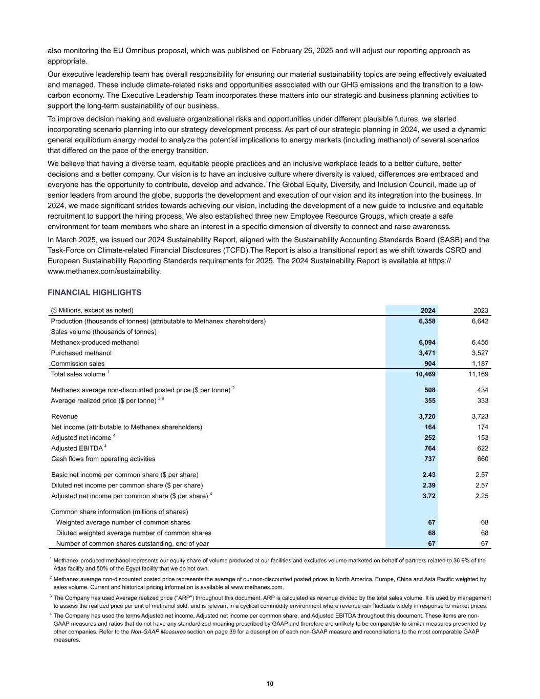 also monitoring the EU Omnibus proposal, which was published on February 26, 2025 and will adjust our reporting approach as appropriate. Our executive leadership team has overall responsibility for ensuring our material sustainability topics are being effectively evaluated and managed. These include climate-related risks and opportunities associated with our GHG emissions and the transition to a low- carbon economy. The Executive Leadership Team incorporates these matters into our strategic and business planning activities to support the long-term sustainability of our business. To improve decision making and evaluate organizational risks and opportunities under different plausible futures, we started incorporating scenario planning into our strategy development process. As part of our strategic planning in 2024, we used a dynamic general equilibrium energy model to analyze the potential implications to energy markets (including methanol) of several scenarios that differed on the pace of the energy transition. We believe that having a diverse team, equitable people practices and an inclusive workplace leads to a better culture, better decisions and a better company. Our vision is to have an inclusive culture where diversity is valued, differences are embraced and everyone has the opportunity to contribute, develop and advance. The Global Equity, Diversity, and Inclusion Council, made up of senior leaders from around the globe, supports the development and execution of our vision and its integration into the business. In 2024, we made significant strides towards achieving our vision, including the development of a new guide to inclusive and equitable recruitment to support the hiring process. We also established three new Employee Resource Groups, which create a safe environment for team members who share an interest in a specific dimension of diversity to connect and raise awareness. In March 2025, we issued our 2024 Sustainability Report, aligned with the Sustainability Accounting Standards Board (SASB) and the Task-Force on Climate-related Financial Disclosures (TCFD).The Report is also a transitional report as we shift towards CSRD and European Sustainability Reporting Standards requirements for 2025. The 2024 Sustainability Report is available at https:// www.methanex.com/sustainability. FINANCIAL HIGHLIGHTS Production (thousands of tonnes) (attributable to Methanex shareholders) 6,358 6,642 Sales volume (thousands of tonnes) Methanex-produced methanol 6,094 6,455 Purchased methanol 3,471 3,527 Commission sales 904 1,187 Total sales volume 1 10,469 11,169 Methanex average non-discounted posted price ($ per tonne) 2 508 434 Average realized price ($ per tonne) 3 4 355 333 Revenue 3,720 3,723 Net income (attributable to Methanex shareholders) 164 174 Adjusted net income 4 252 153 Adjusted EBITDA 4 764 622 Cash flows from operating activities 737 660 Basic net income per common share ($ per share) 2.43 2.57 Diluted net income per common share ($ per share) 2.39 2.57 Adjusted net income per common share ($ per share) 4 3.72 2.25 Common share information (millions of shares) Weighted average number of common shares 67 68 Diluted weighted average number of common shares 68 68 Number of common shares outstanding, end of year 67 67 ($ Millions, except as noted) 2024 2023 1 Methanex-produced methanol represents our equity share of volume produced at our facilities and excludes volume marketed on behalf of partners related to 36.9% of the Atlas facility and 50% of the Egypt facility that we do not own. 2 Methanex average non-discounted posted price represents the average of our non-discounted posted prices in North America, Europe, China and Asia Pacific weighted by sales volume. Current and historical pricing information is available at www.methanex.com. 3 The Company has used Average realized price ("ARP") throughout this document. ARP is calculated as revenue divided by the total sales volume. It is used by management to assess the realized price per unit of methanol sold, and is relevant in a cyclical commodity environment where revenue can fluctuate widely in response to market prices. 4 The Company has used the terms Adjusted net income, Adjusted net income per common share, and Adjusted EBITDA throughout this document. These items are non- GAAP measures and ratios that do not have any standardized meaning prescribed by GAAP and therefore are unlikely to be comparable to similar measures presented by other companies. Refer to the Non-GAAP Measures section on page 39 for a description of each non-GAAP measure and reconciliations to the most comparable GAAP measures. 10