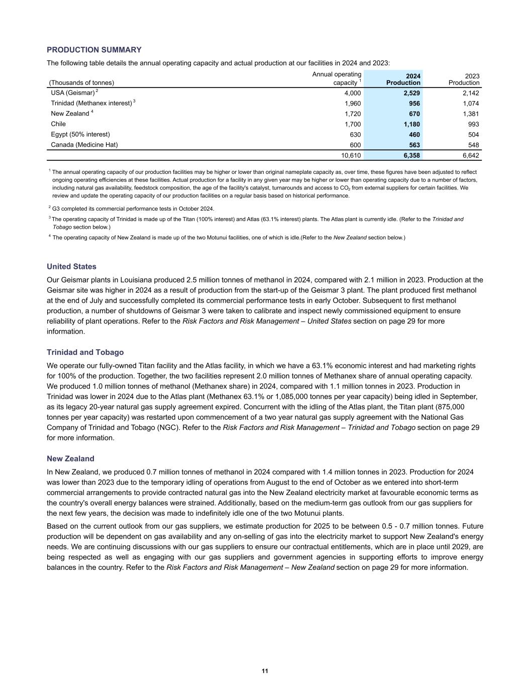 PRODUCTION SUMMARY The following table details the annual operating capacity and actual production at our facilities in 2024 and 2023: USA (Geismar) 2 4,000 2,529 2,142 Trinidad (Methanex interest) 3 1,960 956 1,074 New Zealand 4 1,720 670 1,381 Chile 1,700 1,180 993 Egypt (50% interest) 630 460 504 Canada (Medicine Hat) 600 563 548 10,610 6,358 6,642 (Thousands of tonnes) Annual operating capacity 1 2024 Production 2023 Production 1 The annual operating capacity of our production facilities may be higher or lower than original nameplate capacity as, over time, these figures have been adjusted to reflect ongoing operating efficiencies at these facilities. Actual production for a facility in any given year may be higher or lower than operating capacity due to a number of factors, including natural gas availability, feedstock composition, the age of the facility's catalyst, turnarounds and access to CO2 from external suppliers for certain facilities. We review and update the operating capacity of our production facilities on a regular basis based on historical performance. 2 G3 completed its commercial performance tests in October 2024. 3 The operating capacity of Trinidad is made up of the Titan (100% interest) and Atlas (63.1% interest) plants. The Atlas plant is currently idle. (Refer to the Trinidad and Tobago section below.) 4 The operating capacity of New Zealand is made up of the two Motunui facilities, one of which is idle.(Refer to the New Zealand section below.) United States Our Geismar plants in Louisiana produced 2.5 million tonnes of methanol in 2024, compared with 2.1 million in 2023. Production at the Geismar site was higher in 2024 as a result of production from the start-up of the Geismar 3 plant. The plant produced first methanol at the end of July and successfully completed its commercial performance tests in early October. Subsequent to first methanol production, a number of shutdowns of Geismar 3 were taken to calibrate and inspect newly commissioned equipment to ensure reliability of plant operations. Refer to the Risk Factors and Risk Management – United States section on page 29 for more information. Trinidad and Tobago We operate our fully-owned Titan facility and the Atlas facility, in which we have a 63.1% economic interest and had marketing rights for 100% of the production. Together, the two facilities represent 2.0 million tonnes of Methanex share of annual operating capacity. We produced 1.0 million tonnes of methanol (Methanex share) in 2024, compared with 1.1 million tonnes in 2023. Production in Trinidad was lower in 2024 due to the Atlas plant (Methanex 63.1% or 1,085,000 tonnes per year capacity) being idled in September, as its legacy 20-year natural gas supply agreement expired. Concurrent with the idling of the Atlas plant, the Titan plant (875,000 tonnes per year capacity) was restarted upon commencement of a two year natural gas supply agreement with the National Gas Company of Trinidad and Tobago (NGC). Refer to the Risk Factors and Risk Management – Trinidad and Tobago section on page 29 for more information. New Zealand In New Zealand, we produced 0.7 million tonnes of methanol in 2024 compared with 1.4 million tonnes in 2023. Production for 2024 was lower than 2023 due to the temporary idling of operations from August to the end of October as we entered into short-term commercial arrangements to provide contracted natural gas into the New Zealand electricity market at favourable economic terms as the country's overall energy balances were strained. Additionally, based on the medium-term gas outlook from our gas suppliers for the next few years, the decision was made to indefinitely idle one of the two Motunui plants. Based on the current outlook from our gas suppliers, we estimate production for 2025 to be between 0.5 - 0.7 million tonnes. Future production will be dependent on gas availability and any on-selling of gas into the electricity market to support New Zealand's energy needs. We are continuing discussions with our gas suppliers to ensure our contractual entitlements, which are in place until 2029, are being respected as well as engaging with our gas suppliers and government agencies in supporting efforts to improve energy balances in the country. Refer to the Risk Factors and Risk Management – New Zealand section on page 29 for more information. 11