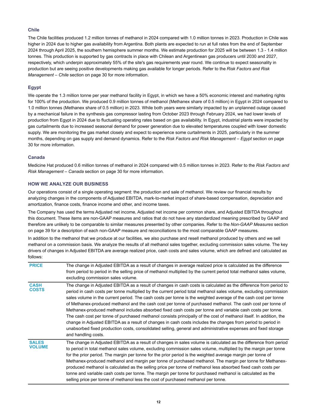 Chile The Chile facilities produced 1.2 million tonnes of methanol in 2024 compared with 1.0 million tonnes in 2023. Production in Chile was higher in 2024 due to higher gas availability from Argentina. Both plants are expected to run at full rates from the end of September 2024 through April 2025, the southern hemisphere summer months. We estimate production for 2025 will be between 1.3 - 1.4 million tonnes. This production is supported by gas contracts in place with Chilean and Argentinean gas producers until 2030 and 2027, respectively, which underpin approximately 55% of the site's gas requirements year round. We continue to expect seasonality in production but are seeing positive developments making gas available for longer periods. Refer to the Risk Factors and Risk Management – Chile section on page 30 for more information. Egypt We operate the 1.3 million tonne per year methanol facility in Egypt, in which we have a 50% economic interest and marketing rights for 100% of the production. We produced 0.9 million tonnes of methanol (Methanex share of 0.5 million) in Egypt in 2024 compared to 1.0 million tonnes (Methanex share of 0.5 million) in 2023. While both years were similarly impacted by an unplanned outage caused by a mechanical failure in the synthesis gas compressor lasting from October 2023 through February 2024, we had lower levels of production from Egypt in 2024 due to fluctuating operating rates based on gas availability. In Egypt, industrial plants were impacted by gas curtailments due to increased seasonal demand for power generation due to elevated temperatures coupled with lower domestic supply. We are monitoring the gas market closely and expect to experience some curtailments in 2025, particularly in the summer months, depending on gas supply and demand dynamics. Refer to the Risk Factors and Risk Management – Egypt section on page 30 for more information. Canada Medicine Hat produced 0.6 million tonnes of methanol in 2024 compared with 0.5 million tonnes in 2023. Refer to the Risk Factors and Risk Management – Canada section on page 30 for more information. HOW WE ANALYZE OUR BUSINESS Our operations consist of a single operating segment: the production and sale of methanol. We review our financial results by analyzing changes in the components of Adjusted EBITDA, mark-to-market impact of share-based compensation, depreciation and amortization, finance costs, finance income and other, and income taxes. The Company has used the terms Adjusted net income, Adjusted net income per common share, and Adjusted EBITDA throughout this document. These items are non-GAAP measures and ratios that do not have any standardized meaning prescribed by GAAP and therefore are unlikely to be comparable to similar measures presented by other companies. Refer to the Non-GAAP Measures section on page 39 for a description of each non-GAAP measure and reconciliations to the most comparable GAAP measures. In addition to the methanol that we produce at our facilities, we also purchase and resell methanol produced by others and we sell methanol on a commission basis. We analyze the results of all methanol sales together, excluding commission sales volume. The key drivers of changes in Adjusted EBITDA are average realized price, cash costs and sales volume, which are defined and calculated as follows: PRICE The change in Adjusted EBITDA as a result of changes in average realized price is calculated as the difference from period to period in the selling price of methanol multiplied by the current period total methanol sales volume, excluding commission sales volume. CASH COSTS The change in Adjusted EBITDA as a result of changes in cash costs is calculated as the difference from period to period in cash costs per tonne multiplied by the current period total methanol sales volume, excluding commission sales volume in the current period. The cash costs per tonne is the weighted average of the cash cost per tonne of Methanex-produced methanol and the cash cost per tonne of purchased methanol. The cash cost per tonne of Methanex-produced methanol includes absorbed fixed cash costs per tonne and variable cash costs per tonne. The cash cost per tonne of purchased methanol consists principally of the cost of methanol itself. In addition, the change in Adjusted EBITDA as a result of changes in cash costs includes the changes from period to period in unabsorbed fixed production costs, consolidated selling, general and administrative expenses and fixed storage and handling costs. SALES VOLUME The change in Adjusted EBITDA as a result of changes in sales volume is calculated as the difference from period to period in total methanol sales volume, excluding commission sales volume, multiplied by the margin per tonne for the prior period. The margin per tonne for the prior period is the weighted average margin per tonne of Methanex-produced methanol and margin per tonne of purchased methanol. The margin per tonne for Methanex- produced methanol is calculated as the selling price per tonne of methanol less absorbed fixed cash costs per tonne and variable cash costs per tonne. The margin per tonne for purchased methanol is calculated as the selling price per tonne of methanol less the cost of purchased methanol per tonne. 12